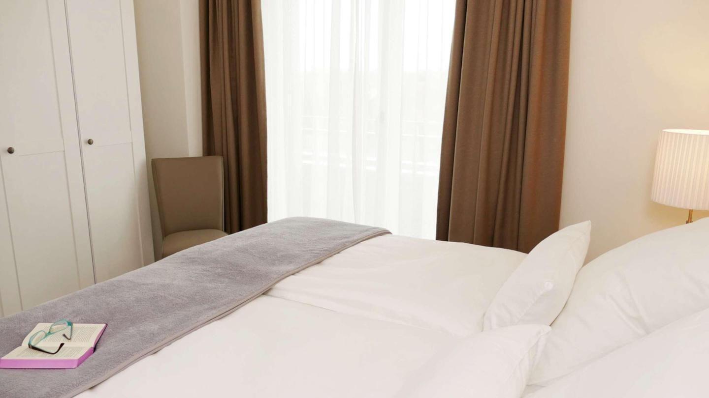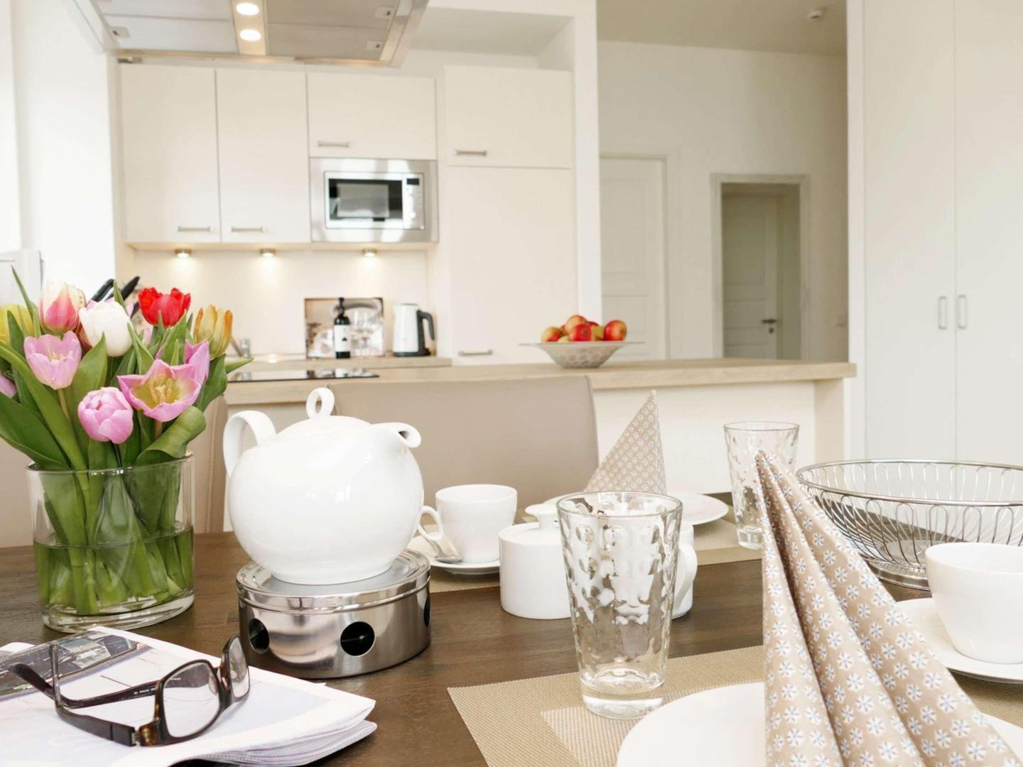 Das Apartment bietet einen hellen Wohnbereich mit einer angrenzenden Essecke und einer offenen, bestens ausgestatteten Küche. Vom Wohnzimmer aus genießen Sie bereits einen teilweisen Meerblick. Das Schlafsofa im Wohnbereich bietet eine weitere Schlafmöglichkeit für eine Person. Sonnige Stunden können Sie auf der Dachterrasse mit herrlichem Blick auf das Meer verbringen.