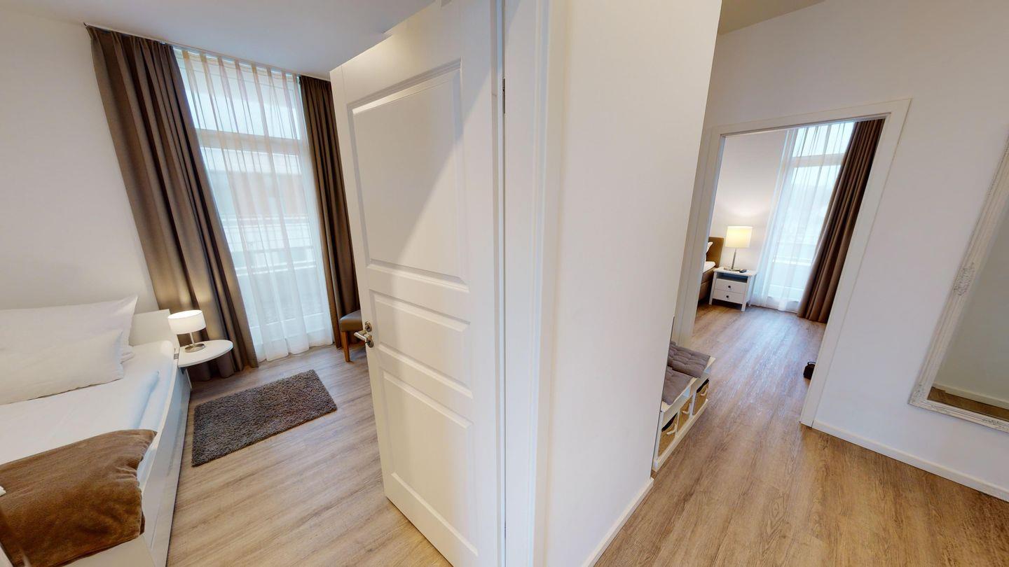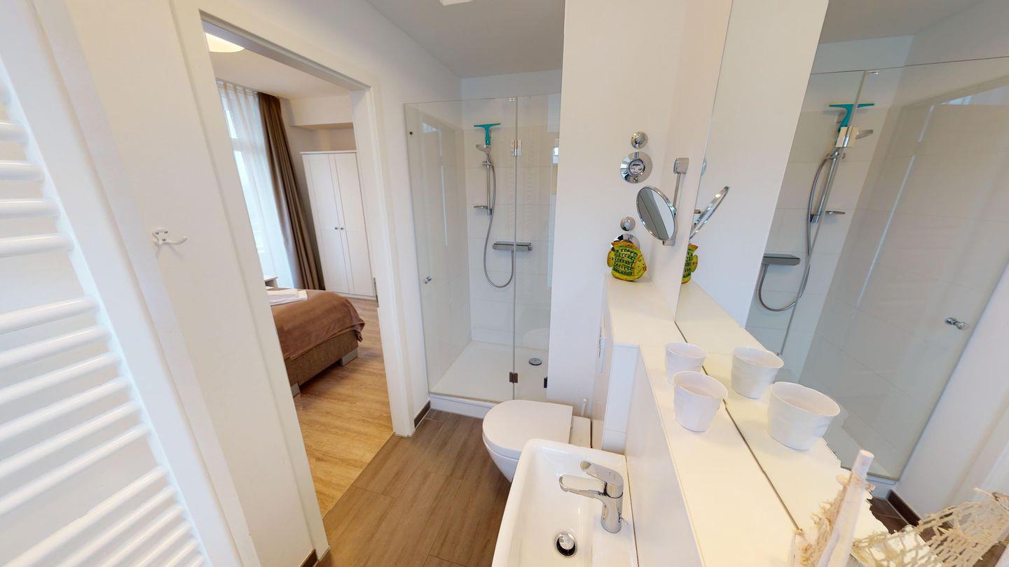 Ein großzügiges Wohnzimmer mit Ess- und Küchenbereich, zwei Schlafzimmer und zwei Bäder (eines mit Dusche und eines mit Dusche und Badewanne) versprechen viel Komfort. Eines der Schlafzimmer ist mit einem komfortablen Boxspringbett ausgestattet, das zweite Schlafzimmer mit einem Einzelbett und einem ausziehbaren "Kojenbett".