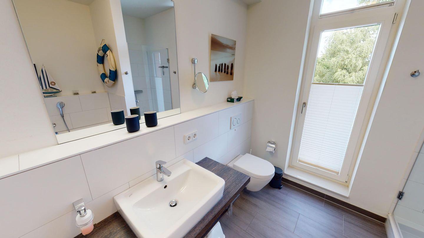 Das Badezimmer bietet großzügige Ablageflächen, eine Dusche und eine zusätzliche Badewanne. Beide Badezimmer sind exklusiv ausgestattet und haben Tageslicht. Das kleine Badezimmer bietet sogar einen kleinen Meerblick. Das zweite Schlafzimmer der Ferienwohnung ist mit zwei hochwertigen Boxpring-Einzelbetten, einem Kleiderschrank, einem Schminktisch und einem dritten wandhängenden SMART TV ausgestattet. Auch von diesem Zimmer aus kann man einen Ostseeblick auf die Lübecker Bucht genießen. In der Ferienwohnung befinden sich außerdem ein eingebauter Safe und diverse Haushaltsutensilien wie ein Dyson Akku-Staubsauger, Wischmop, Besen, Handfeger, Bügelbrett und Bügeleisen. Ein Föhn ist natürlich ebenfalls vorhanden.