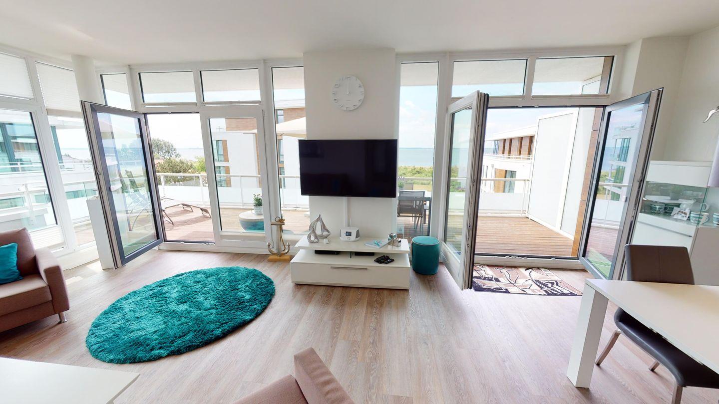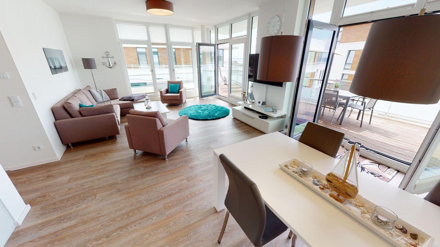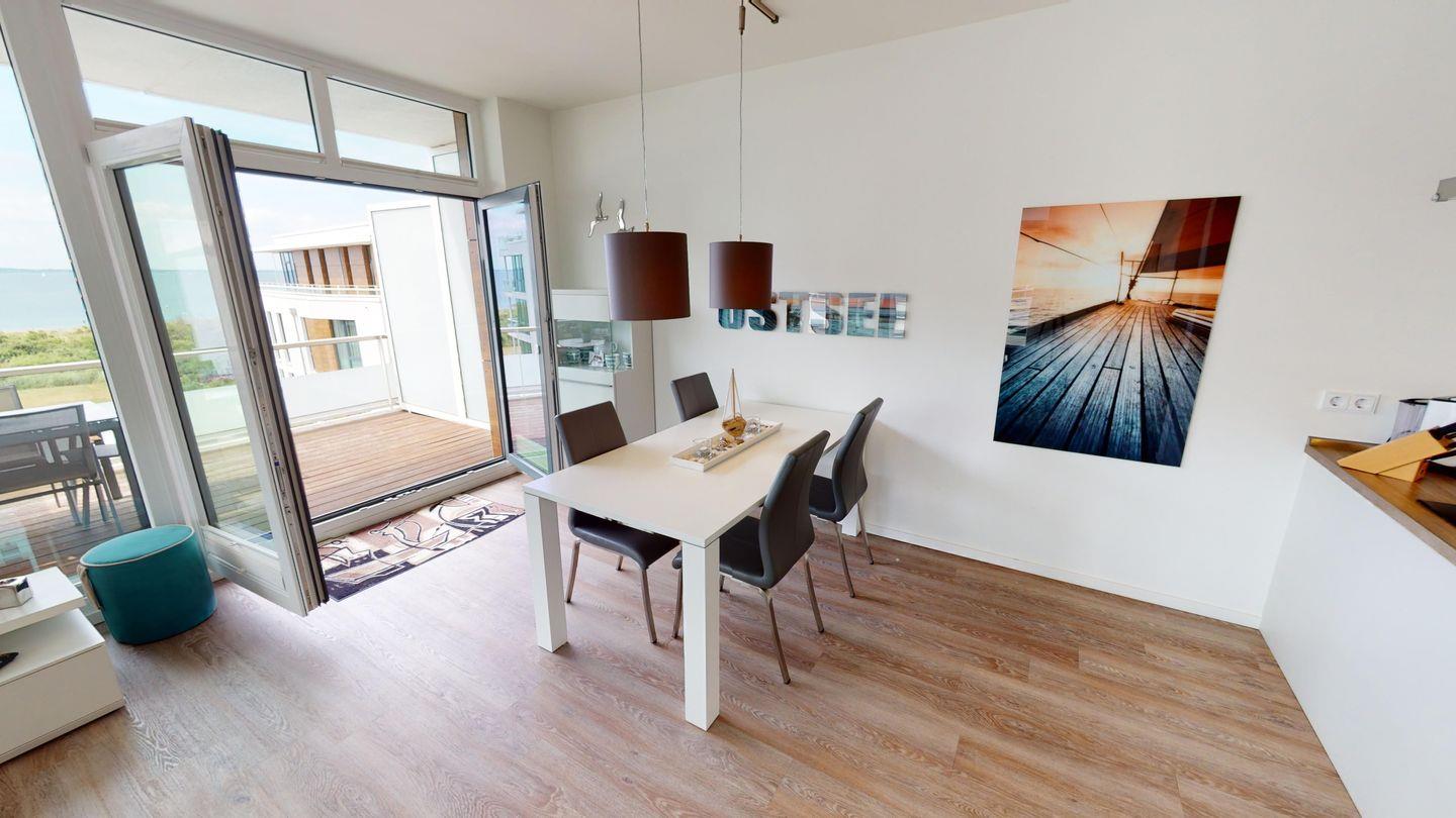 Von der Wohnlandschaft aus hat man einen Logenplatz auf die Ostsee und kann einen fantastischen Meerblick genießen. Außerdem gibt es eine großzügige Essecke, ebenfalls mit Meerblick.