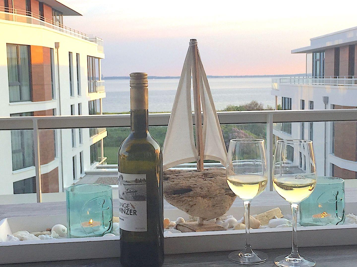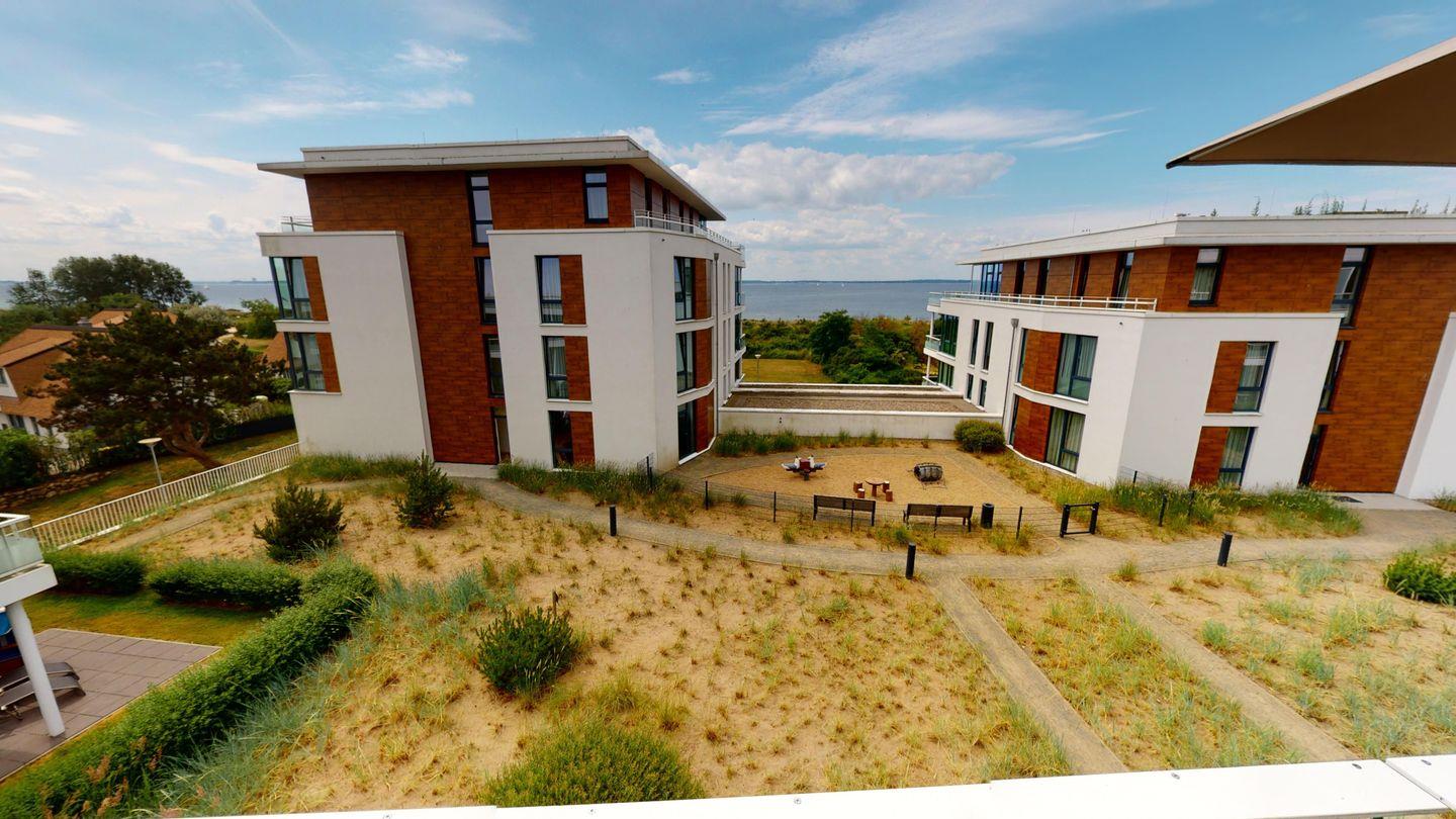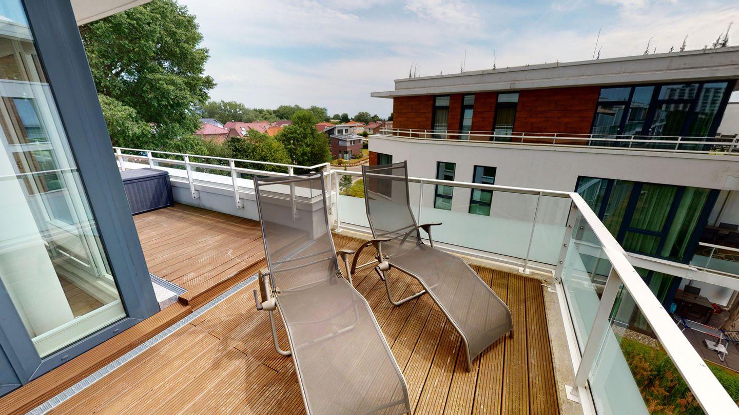 Die große Dachterrasse mit tollem Meerblick ist nach Süden ausgerichtet und bietet durch die in der Lübecker Bucht einzigartigen Lage bei gutem Wetter fast den ganzen Tag Sonne. Die halbüberdachte Dachterrasse ist mit einem großen Tisch, Stühlen, zwei Liegestühlen, einem Sonnenschirm und einer Gartenbox ausgestattet.