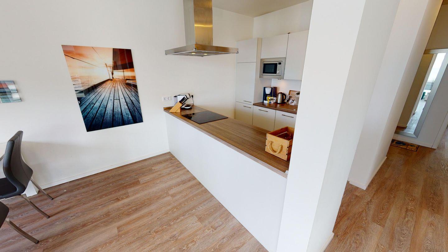 Die Küche ist komfortabel ausgestattet mit Geschirrspülmaschine, Mikrowelle, einem Kochtresen mit Ceranfeld, Backofen und Dunstabzugshaube, einer Tassimo Kaffee-Tab-Maschine (wahlweise auch Nutzung der vorhandenen Bosch Filterkaffeemaschine möglich), Toaster, Wasserkocher und Eierkocher. Ein Elektrogrill von Philips bietet die Möglichkeit für gemütliche Grillabende auf der Dachterrasse.