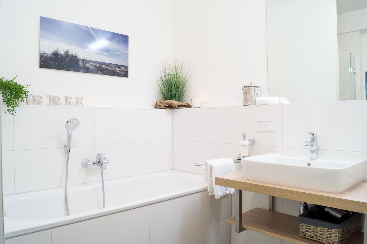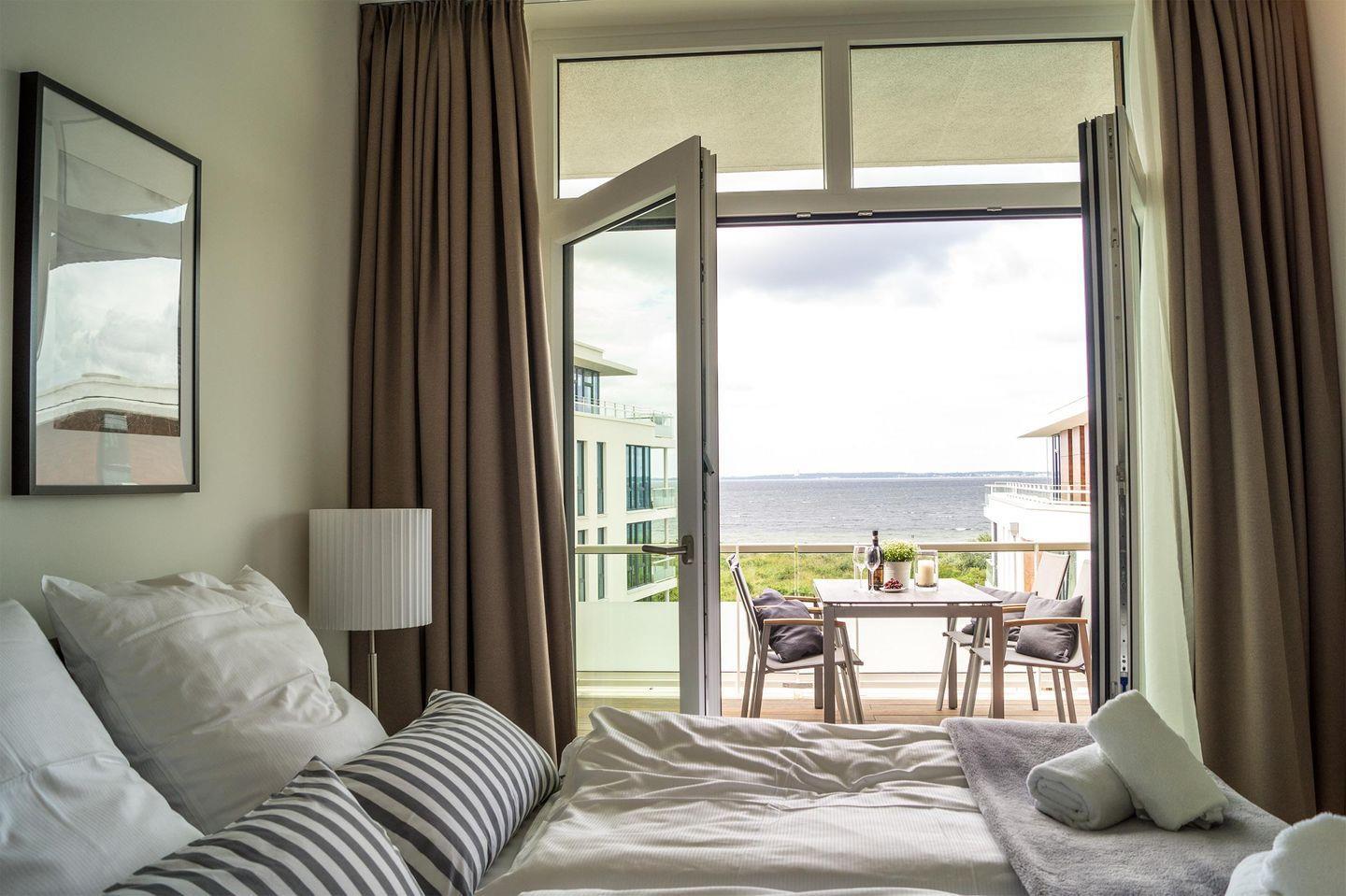 Der Eingangsbereich führt Sie linkerhand direkt in das Badezimmer mit Badewanne und Dusche. Zurück auf dem Flur führt Sie Ihr Weg in den hellen Wohnbereich mit tollem Ostseeblick durch die große Fensterfront. Der Wohnbereich ist mit einer modernen, offenen Küchenzeile, einem Essbereich sowie einem Sofa & Sessel ausgestattet. Über den Wohnbereich gelangen Sie in das Schlafzimmer mit Boxspring-Doppelbett.