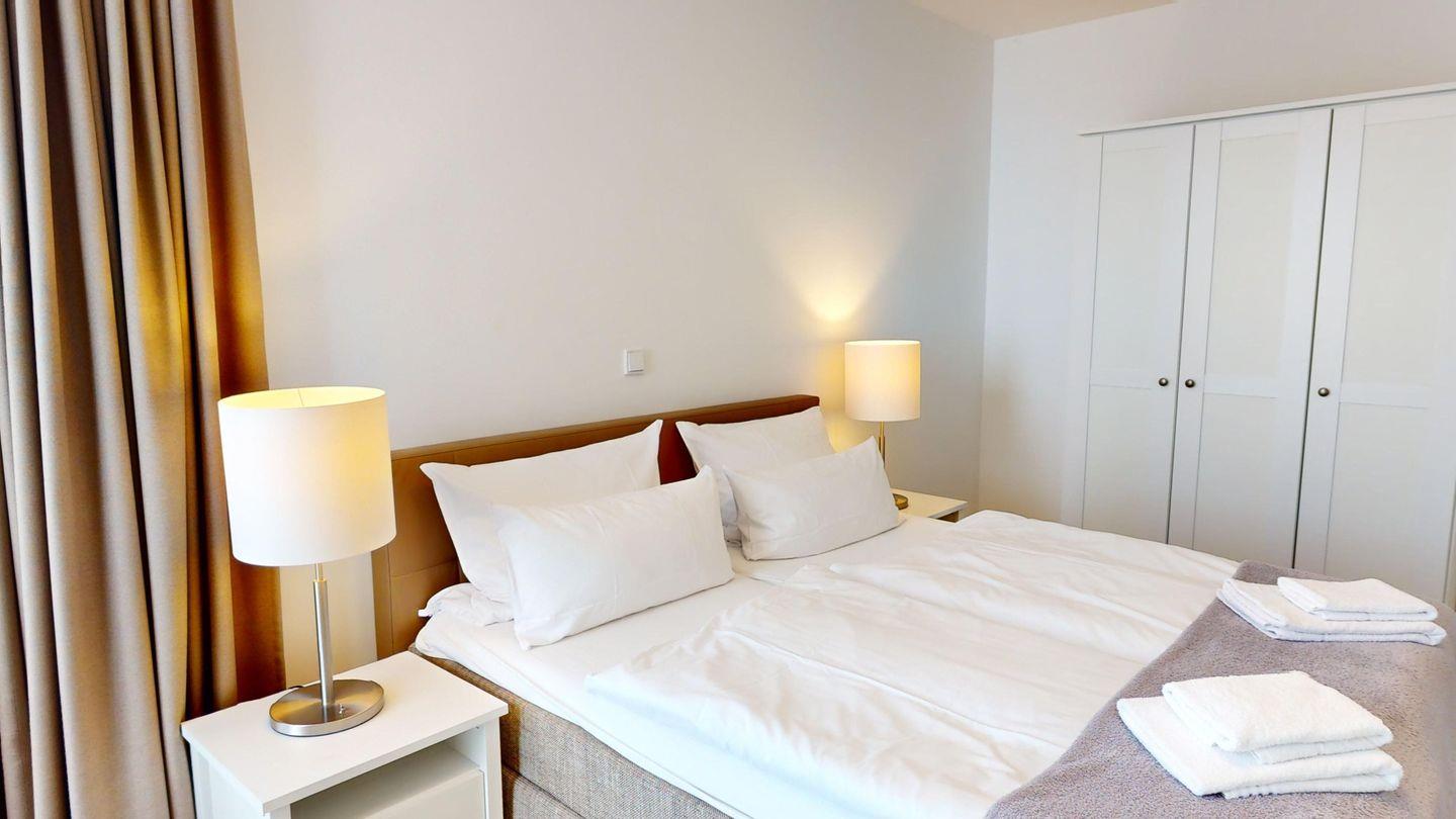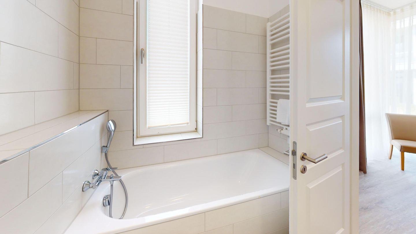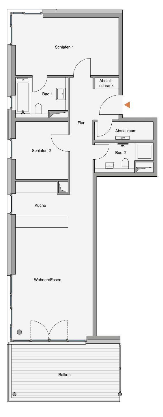 Die Wohnung hat zwei getrennte Schlafzimmer, eins davon mit einem eigenen Badezimmer mit Dusche. Ein weiteres Bad mit Dusche ist vom Flur aus zu erreichen.