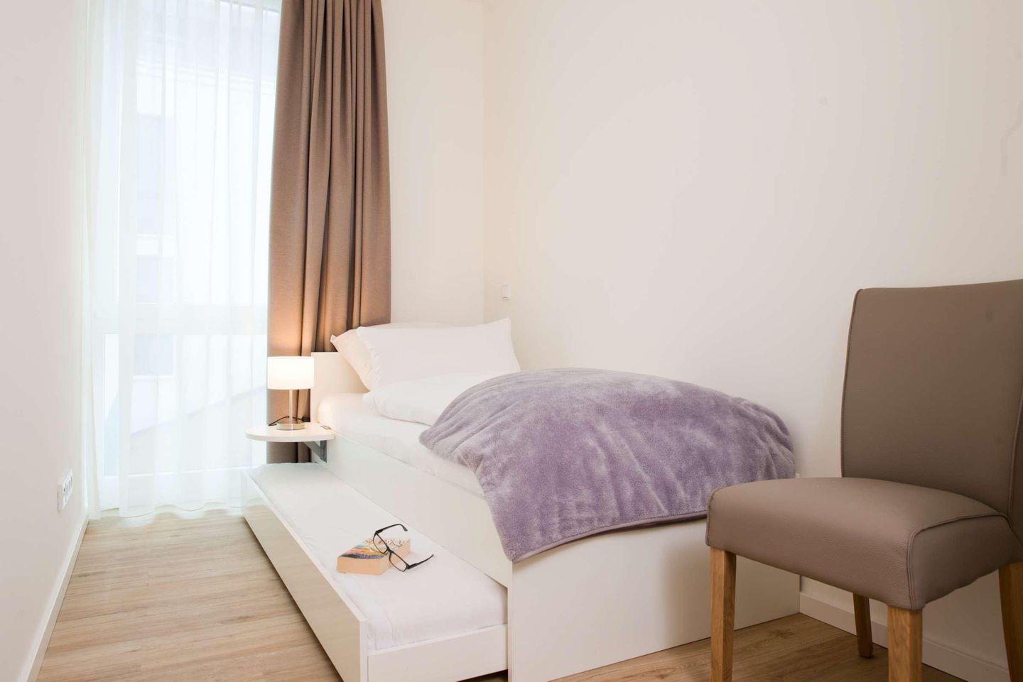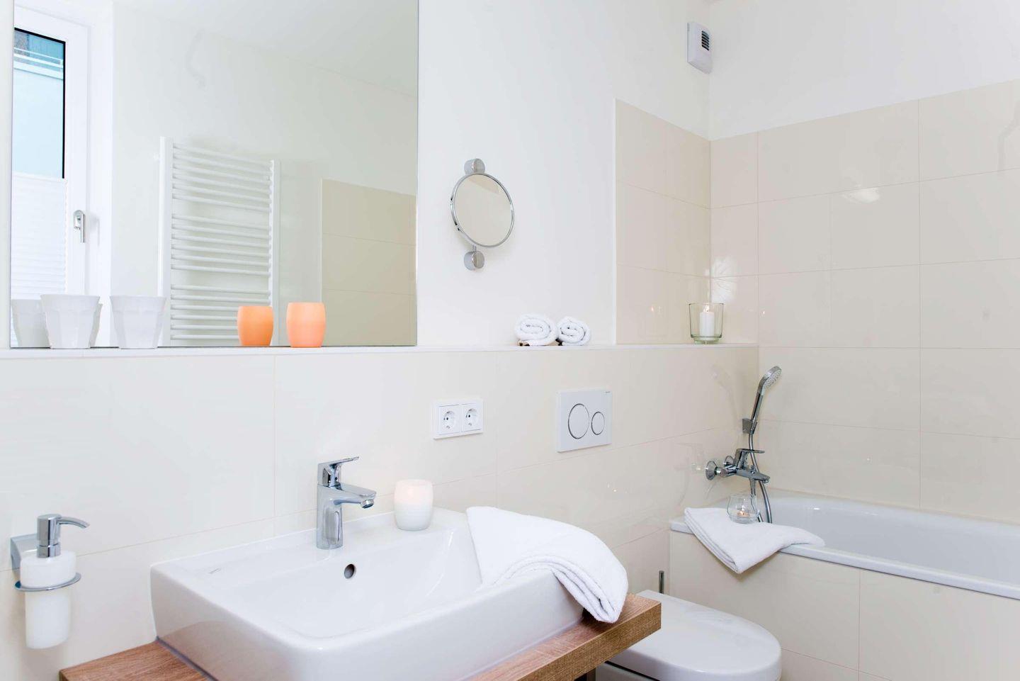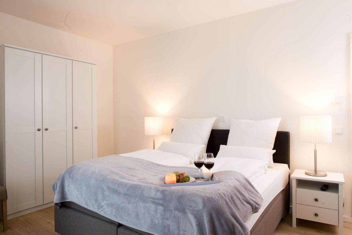 Der einladende Flur mit Garderobe und großem Spiegel führt Sie rechterhand direkt in das erste der beiden hellen und freundlichen Schlafzimmer. Die Ausstattung besteht aus einem Boxspring-Doppelbett und einem Kleiderschrank. Weiter über den Flur gelangen Sie jeweils in zwei weitere Schlafzimmer. Eines mit Boxspring-Doppelbett, Kleiderschrank, Flachbildferseher und Zugang zu einem separaten Badezimmer mit Tageslichtfenster und Badewanne. Das Zweite verfügt über ein Einzelbett, es bietet jedoch eine Ausziehfunktion für ein zweites Bett, sodass hier zwei Schlafplätze zur Verfügung stehen.