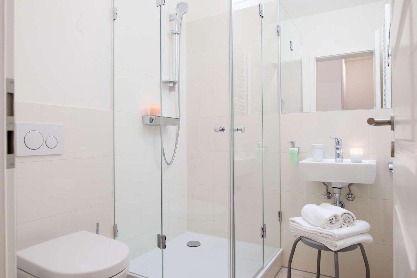 Außerdem führt Sie eine Tür des Flurs noch in ein zweites Badzimmer mit Dusche.
