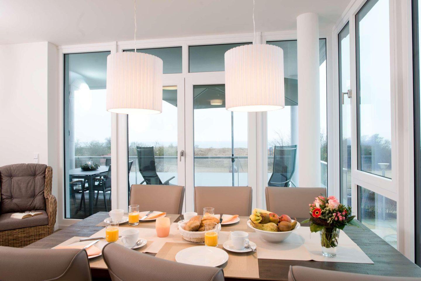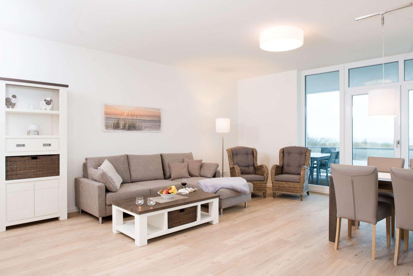 Am Ende des Flurs erwartet Sie das Herzstück des Apartments der Wohnbereich. Dieser verfügt über eine offene, moderne Einbauküche, einen schönen Essplatz mit sechs Stühlen und eine gemütliche Sofaecke. Aus dem Wohnzimmer genießen Sie einen tollen Meerblick. Sie haben somit die Möglichkeit den Blick aus der großen Fensterfront zu genießen oder den Tag mit einem spannenden Film, auf dem großen Flachbildfernseher ausklingen zu lassen! Den sonnigen Südbalkon erreichen Sie außerdem über den Wohnbereich. Zwei Sonnenliegen und ein Balkontisch mit 6 Sitzplätzen warten auf Sie!