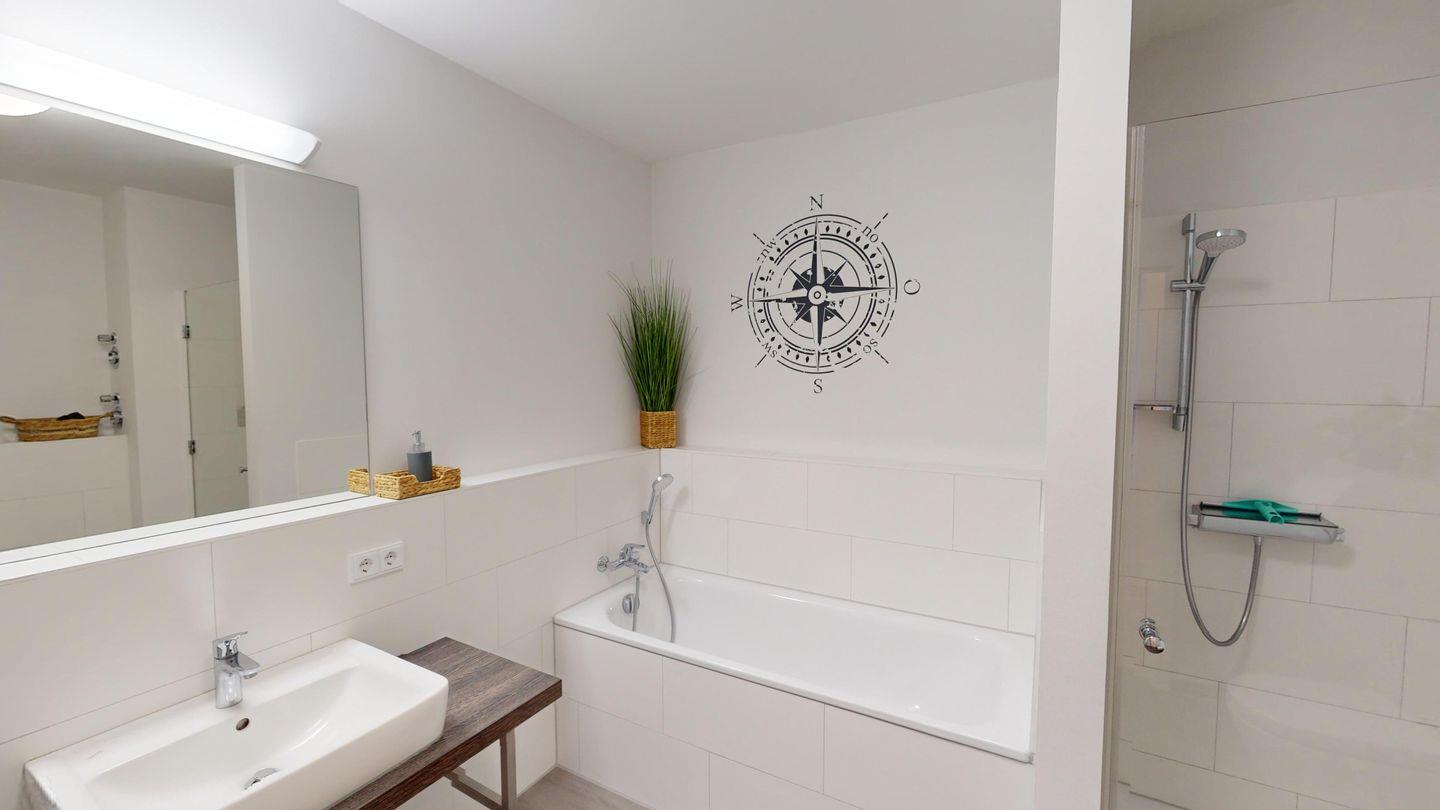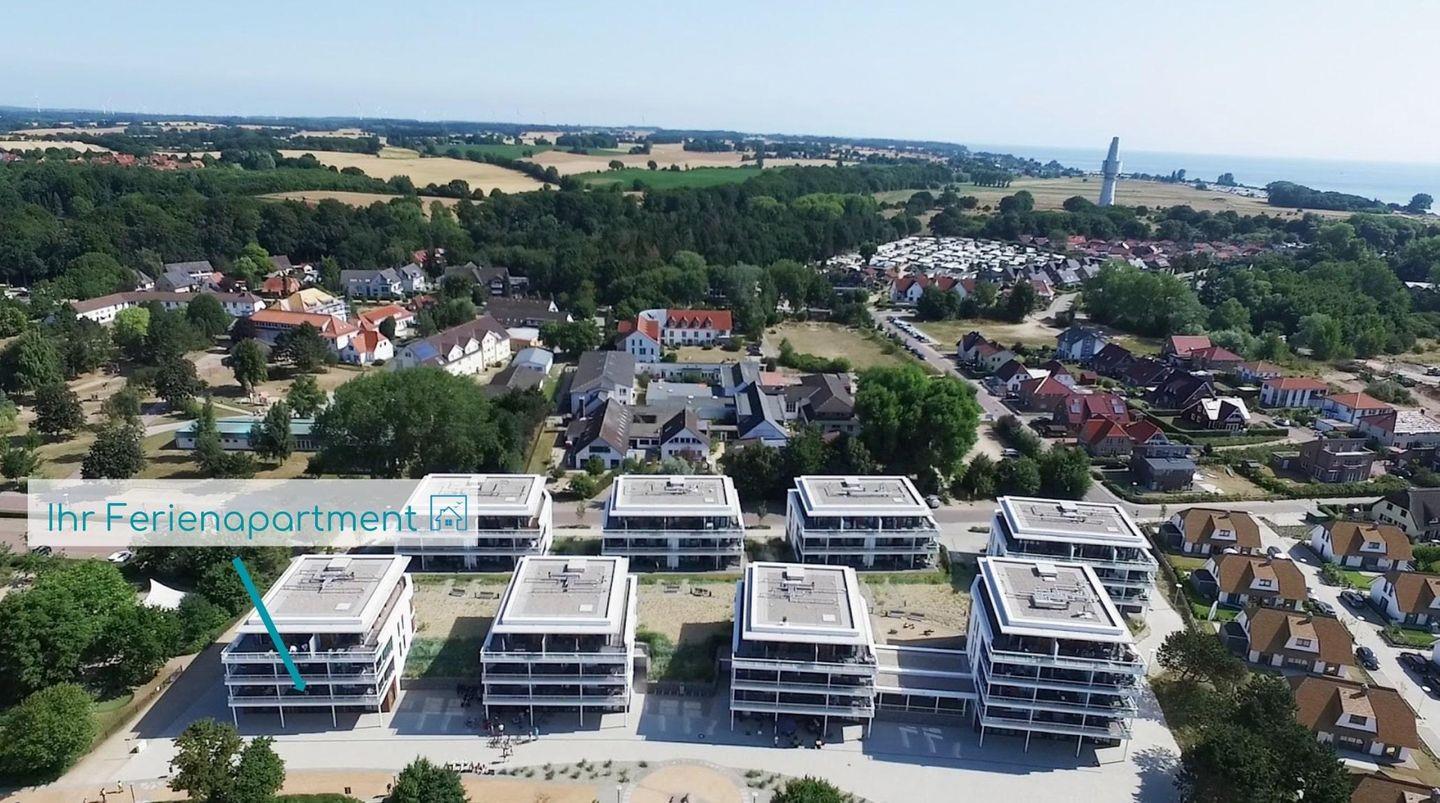 Der Eingangsbereich empfängt Sie mit einem großen Spiegel sowie Garderobenschrank und führt Sie geradeaus in den modernen und lichtdurchfluteten Wohnbereich. Die offene, voll ausgestattete Einbauküche, ein einladender Essplatz und ein gemütlicher Sofabereich, mit großem Flachbildfernseher machen das Urlaubsgefühl perfekt! Genießen Sie vom Sofa aus den einmaligen Blick auf die Ostsee! Rechterhand vom Wohnbereich gelangen Sie einerseits in das Badezimmer, mit Badewanne und Dusche und durch eine weitere Tür in das komfortable Schlafzimmer mit Home Office-Arbeitsplatz. Ein tolles Boxspring-Doppelbett, ein weiterer Flachbildfernseher und ein geräumiger Kleiderschrank gehören zur Ausstattung. Sowohl über das Wohnzimmer, als auch über das Schlafzimmer können Sie den großzügigen Balkon mit eigenem Strandkorb betreten. Ein Tisch mit vier Stühlen sowie zwei Sonnenliegen laden Sie ein, den fantastischen Ostseeblick zu genießen!