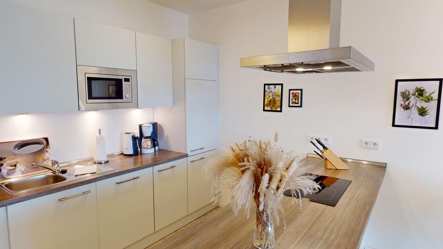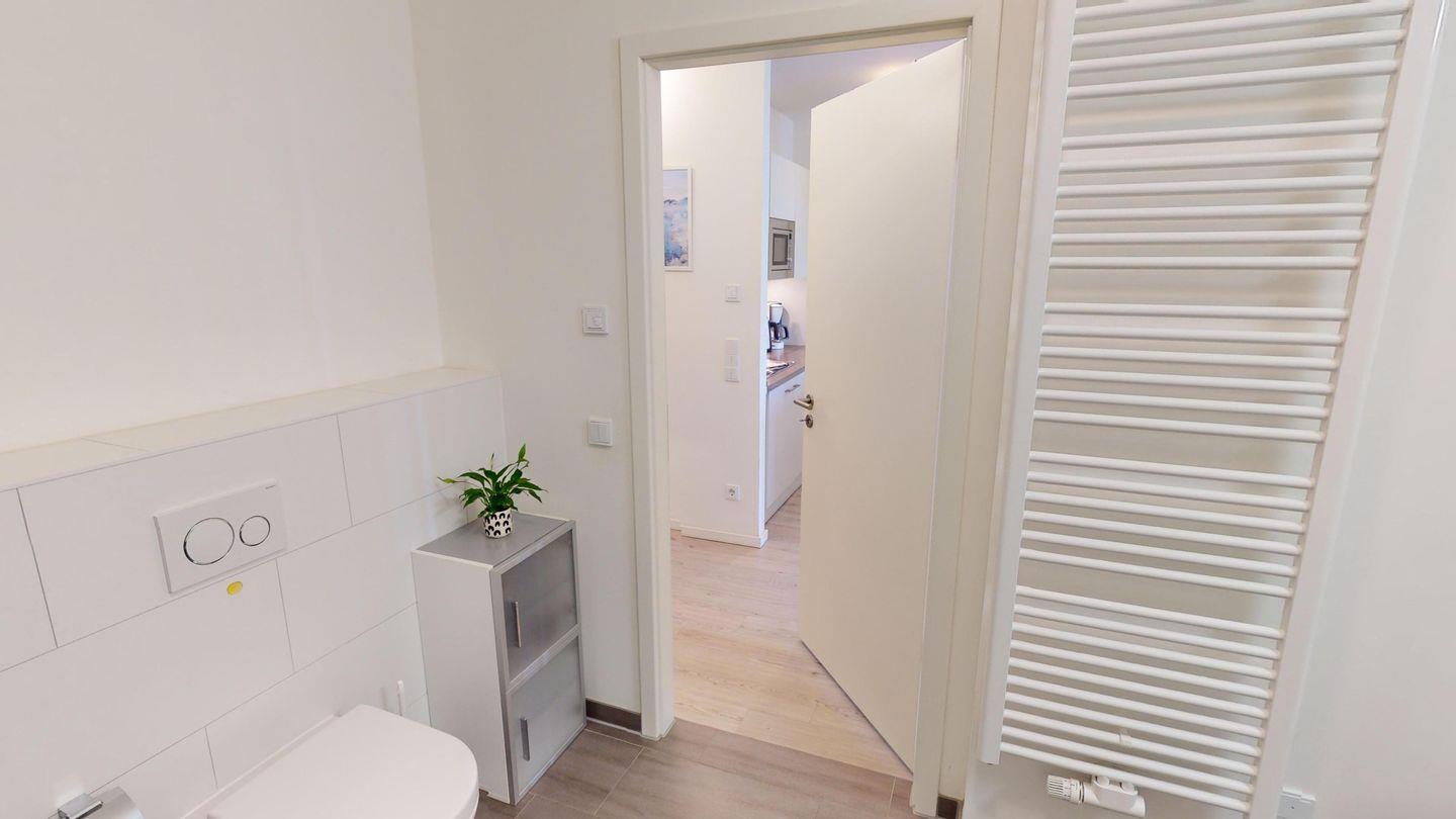 Der Eingangsbereich empfängt Sie mit einem großen Ganzkörperspiegel sowie Garderobenschrank und führt Sie geradeaus in den modernen und lichtdurchfluteten Wohnbereich. Die offene, voll ausgestattete Einbauküche, ein einladender Essplatz und ein gemütlicher Sofabereich, mit großem Flachbildfernseher machen das Urlaubsgefühl perfekt! Genießen Sie vom Sofa aus, den einmaligen Blick auf die Ostsee! Das Sofa bietet eine bequeme Schlaffunktion für eine Person. Rechterhand vom Wohnbereich gelangen Sie einerseits in das Badezimmer, mit Badewanne und Dusche und durch eine weitere Tür in das komfortable Schlafzimmer. Ein tolles Boxspring-Doppelbett, ein weiterer Flachbildfernseher und ein geräumiger Kleiderschrank gehören zur Ausstattung. Sowohl über das Wohnzimmer, als auch über das Schlafzimmer können Sie den großzügigen Balkon betreten. Ein Tisch mit vier Stühlen sowie zwei Sonnenliegen laden Sie ein, den fantastischen Ostseeblick zu genießen!