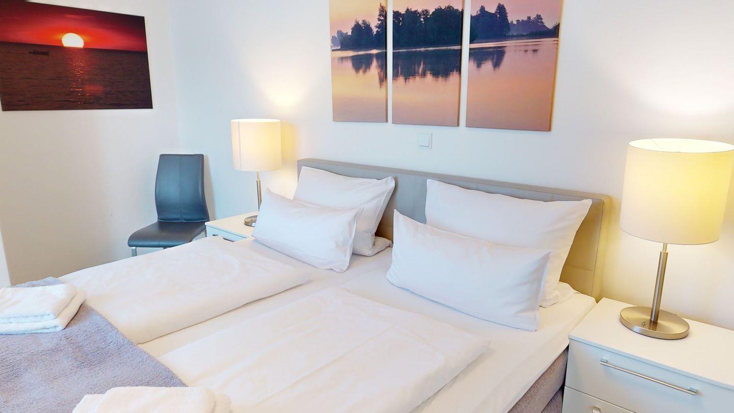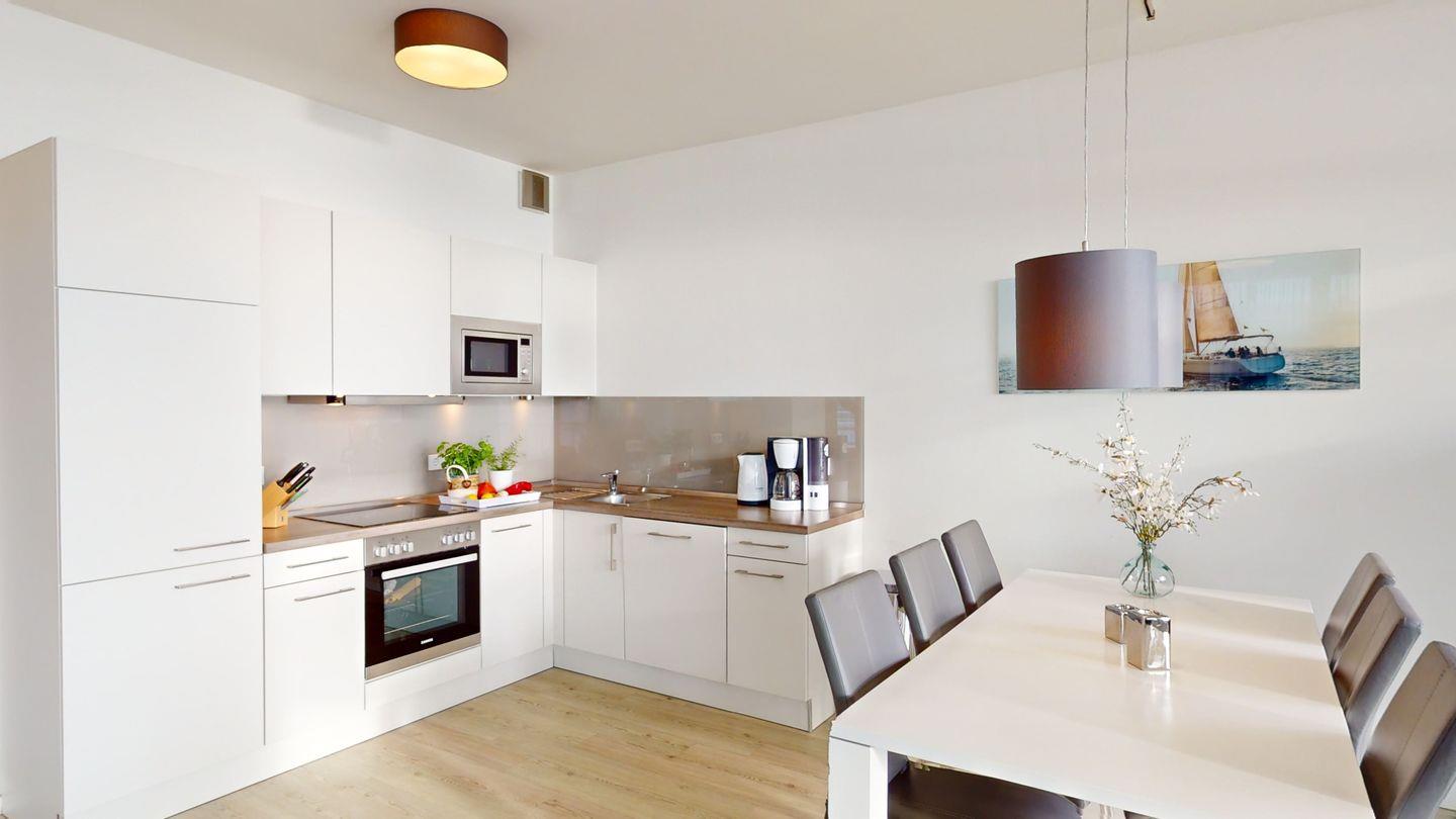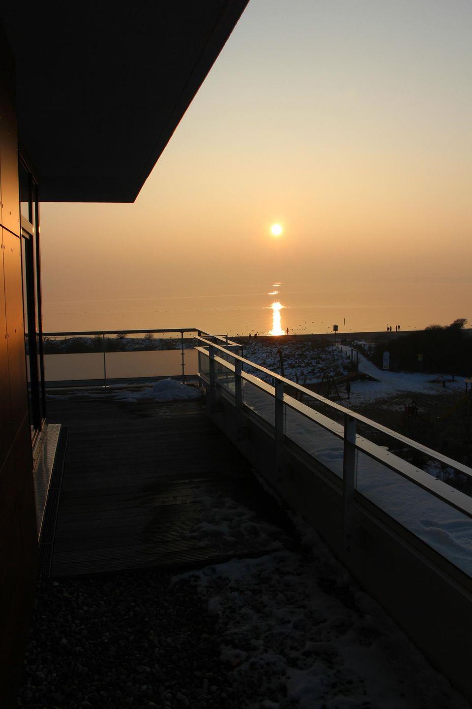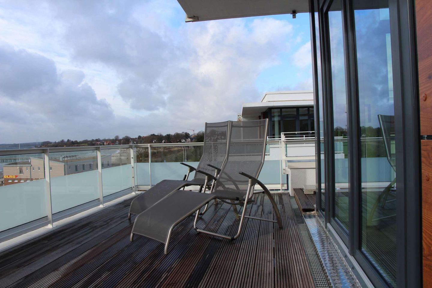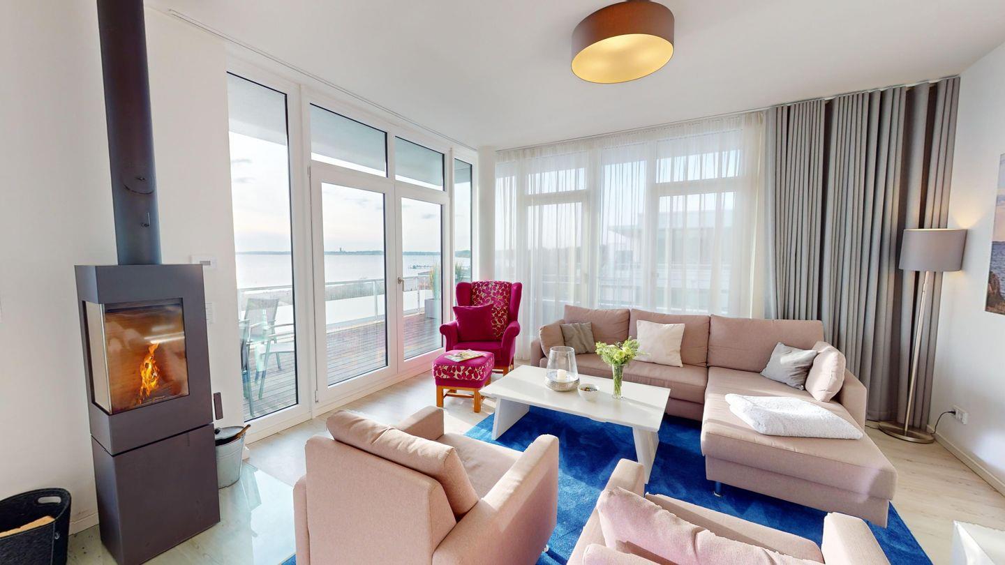Highlights sind u.a. der drehbare Kaminofen, den Sie sowohl vom Essbereich als auch vom Sofa aus bei einem Blick auf die Ostsee genießen können, und die großzügige finnische Blockbohlen-Sauna mit einem Innenmaß von 2,1 x 2,1 Metern und drei Ebenen innerhalb der Penthouse-Wohnung, so dass Sie sich nach einem Saunagang auf einer Liege auf der Dachterrasse ausruhen können. Die beiden Bäder (eins mit Badewanne und eins mit Dusche) sind jeweils mit einem Handtuchheizkörper ausgestattet.