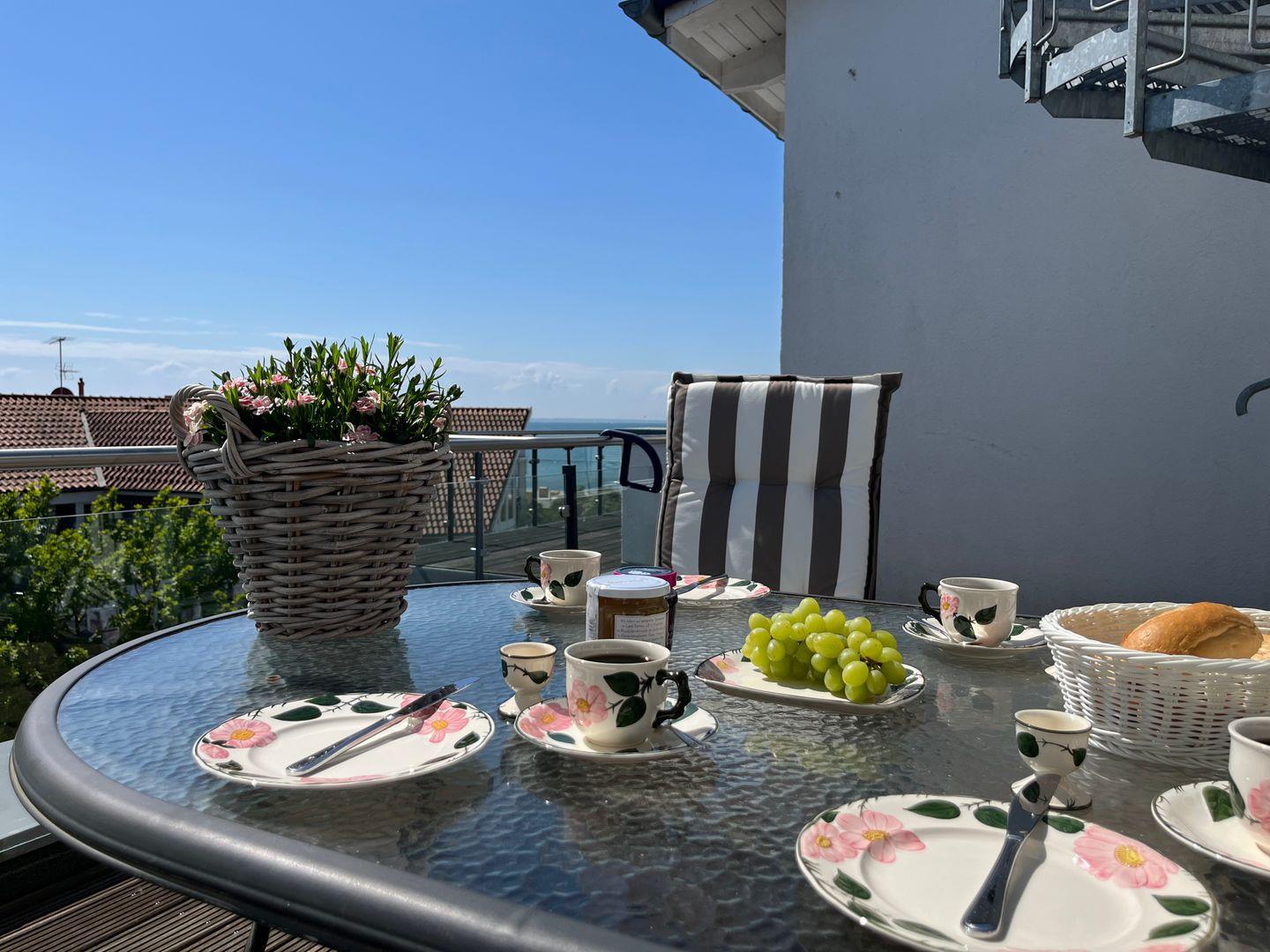 Hier können Sie windgeschützt mit Blick auf die Ostsee schon Ihr Frühstück genießen. Zu dieser Terrasse gehört eine sehr schöne Sitzgruppe mit Bank, sowie eine elektrische Markise.