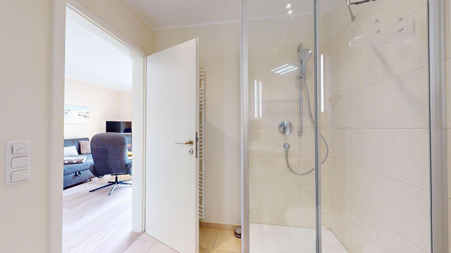 Das Badezimmer ist mit einer geräumigen Dusche ausgestattet.