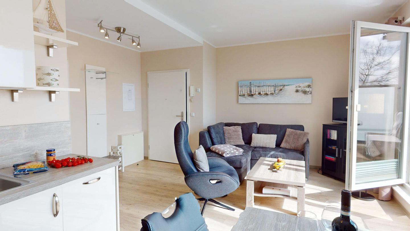 Im Wohnraum befindet sich eine großzügige Sitzgruppe mit Ottomane sowie einem Flachbildfernseher.