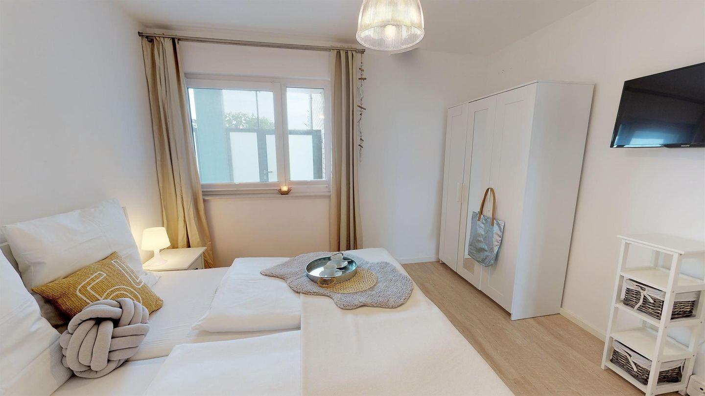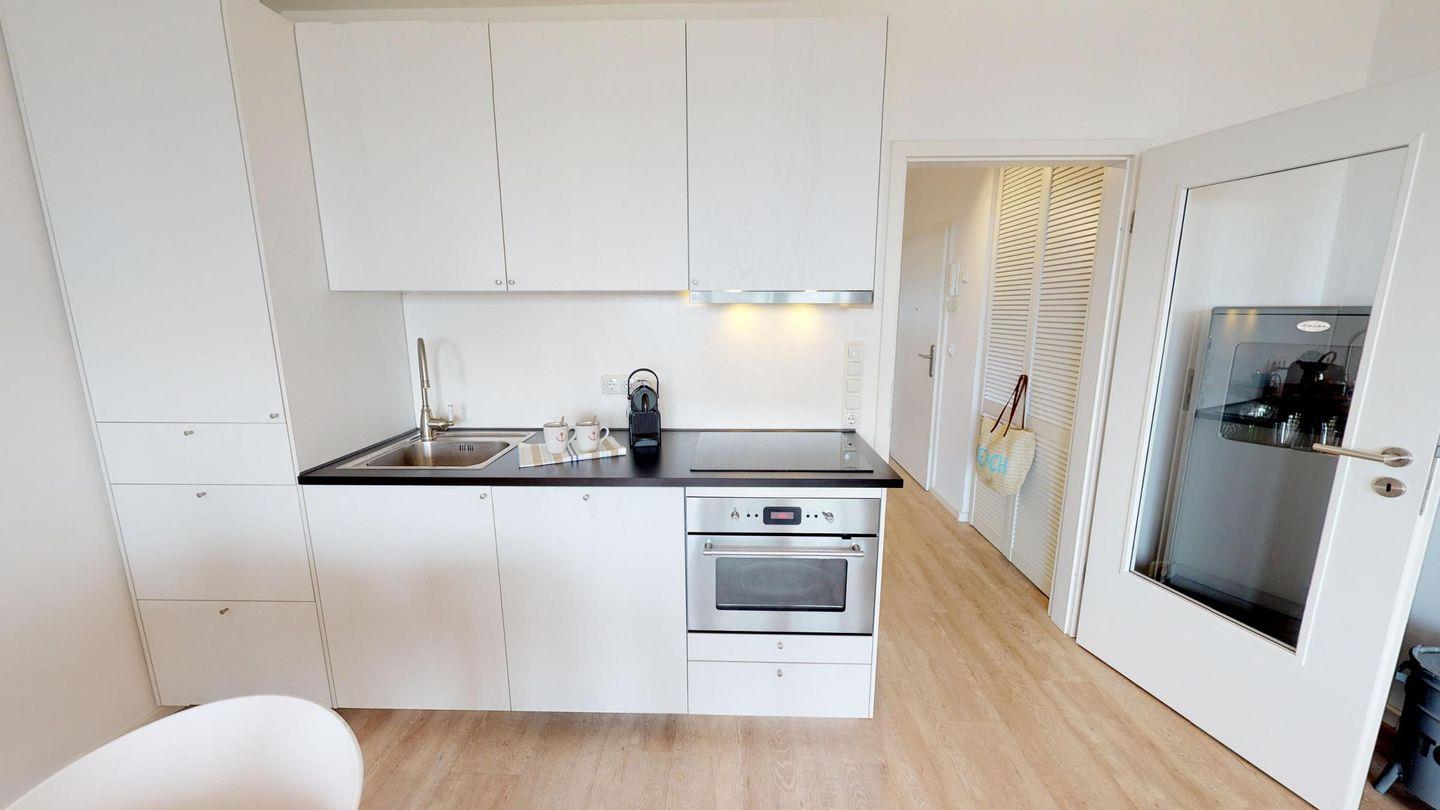 Die Wohnung verfügt über ein Schlafzimmer mit Doppelbett und ein schönes Bad mit Dusche. Abgerundet wird der Wohnbereich durch eine kleine, offene Küchenzeile, einen schönen Essbereich sowie einen gemütlichen Sofabereich (mit Schlaffunktion) – das Highlight ist der frontale Meerblick durch die Fensterfront!