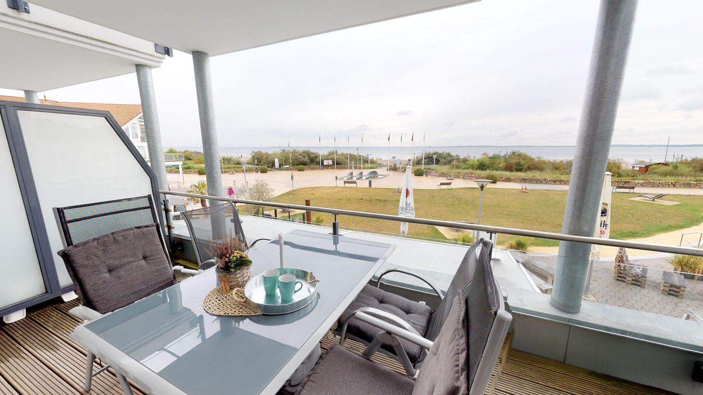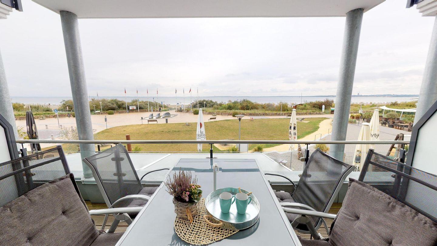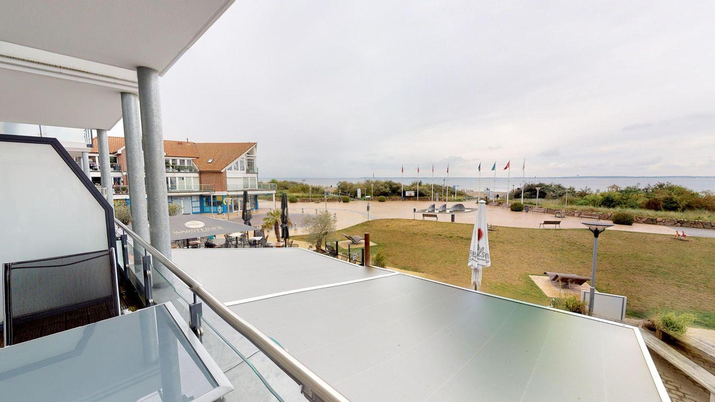 Über das Wohnzimmer gelangen Sie auf den großzügigen Balkon mit Sitzmöglichkeiten für vier Personen - genießen Sie den atemberaubenden Meerblick! Ein gemeinschaftlicher Fahrradraum steht außerdem zur Verfügung.