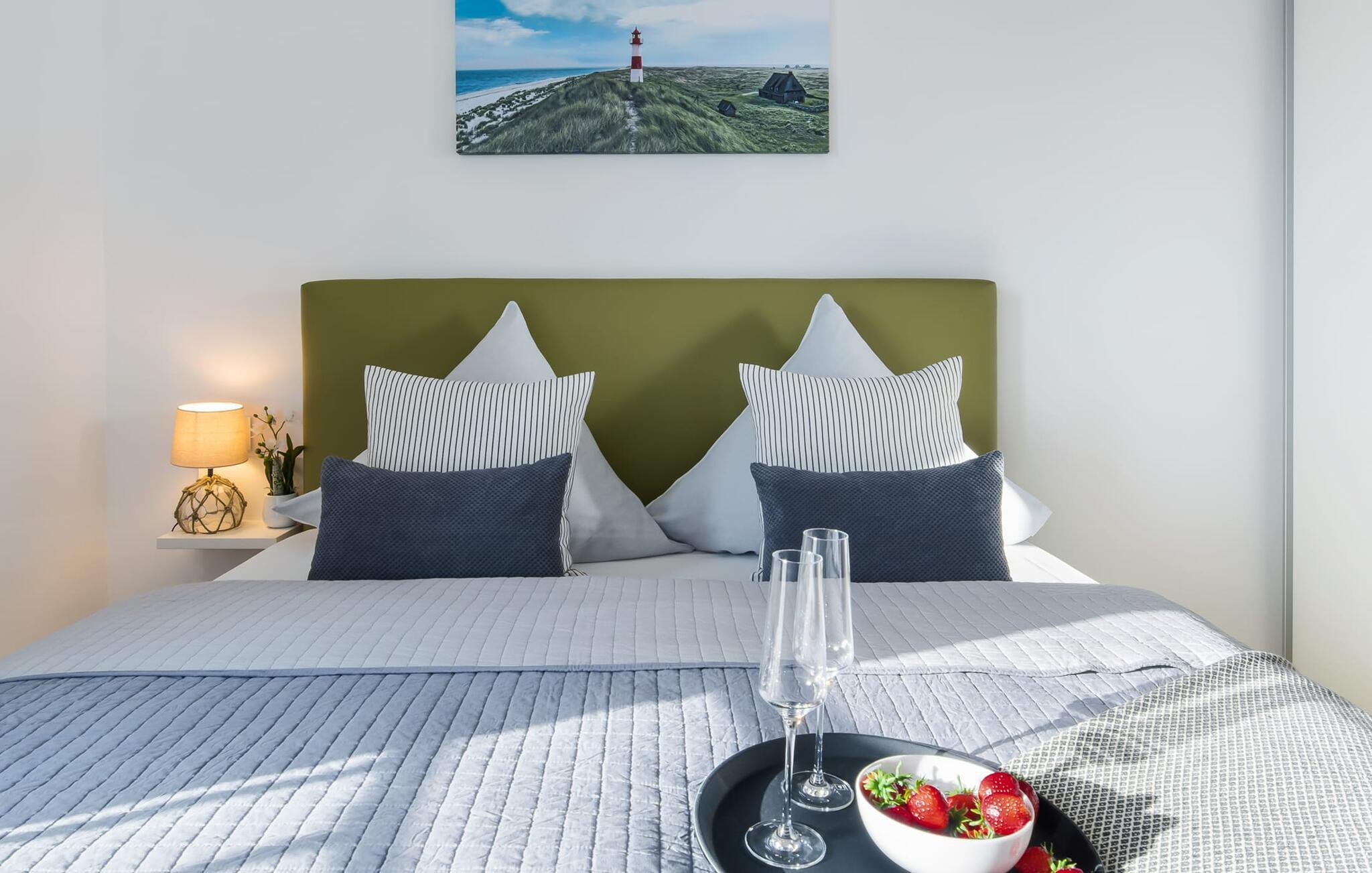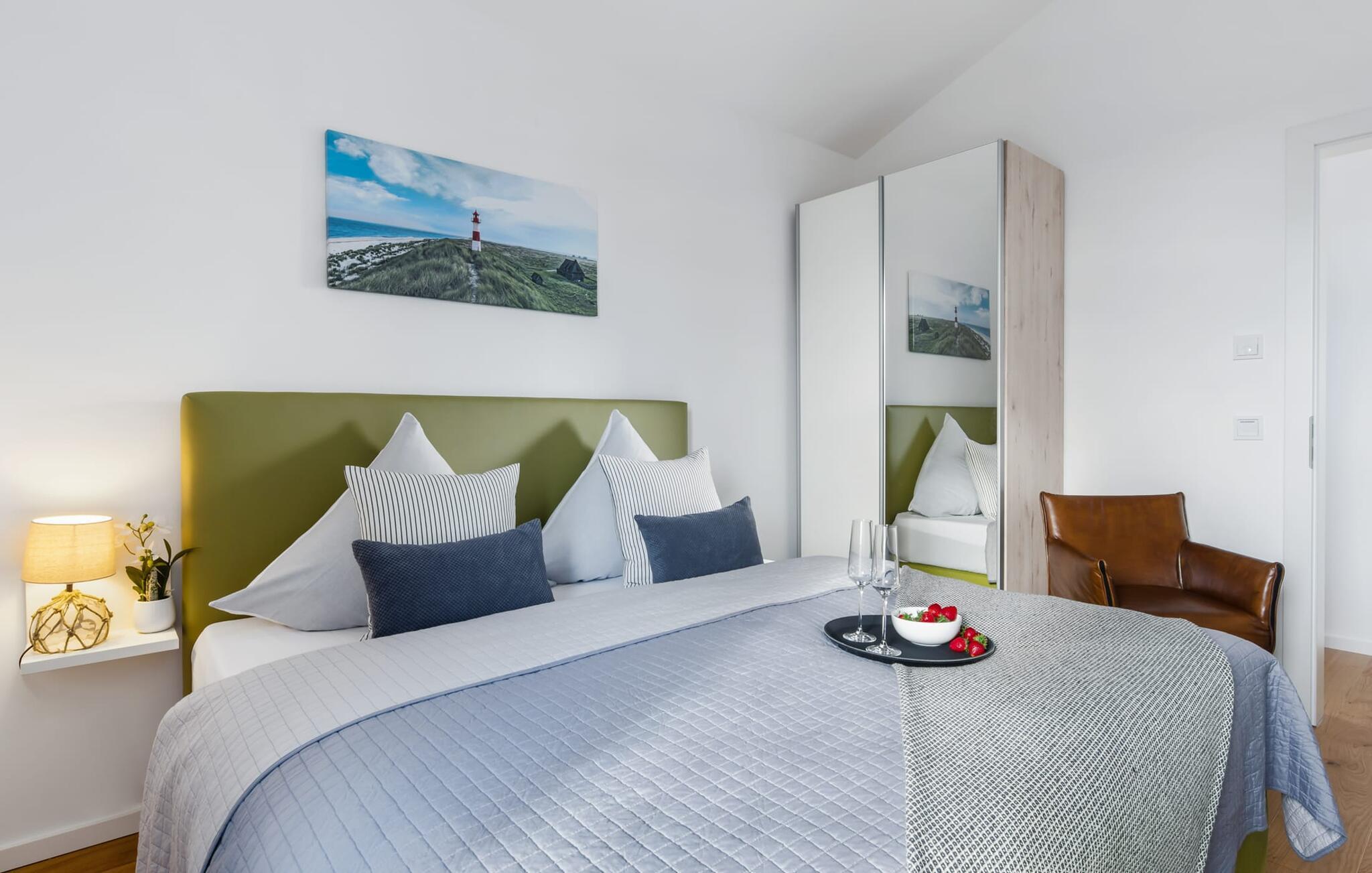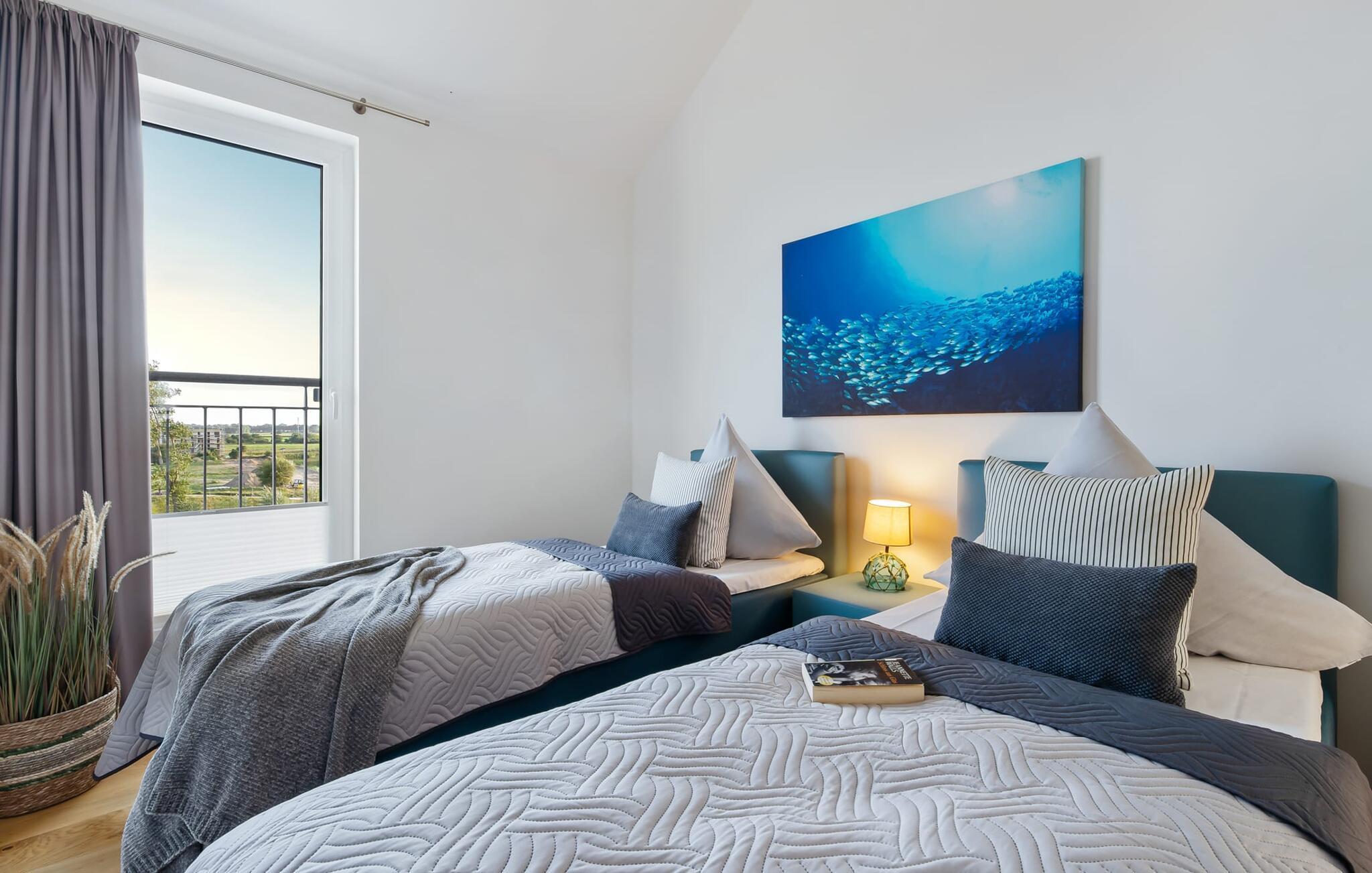 Penthouselejligheden MEERESTOCHTER inviterer sine gæster til en uforglemmelig ferie ved Østersøen. Bare et par minutters gang fra Weidenfelds sandstrand og Østersøen byder MEERESTOCHTER jer velkommen til sin rummelige og lyse stue/spisestue. Træd ind og kig straks gennem de gulv-til-loft-vinduer ud på sportsbådshavnen, slimets smukke mund med dets sømænd og naturreservatet og til siden den uendelige Østersø med dens bølger ! Den moderne og hyggelige indretning med deres kærligt designede maritime detaljer får jer hurtigt til at glemme hverdagen. Ud over fjernsyn og pejs til den køligere sæson, er alt der for at føles helt behageligt. Bluetooth musiksystemet sikrer den rigtige stemning med jeres yndlingsmusik. Og når I først har opdaget den komfortable L-formede sofa i stuen, vil I bestemt ikke rejse jer så hurtigt igen. Det integrerede åbne køkken er udstyret med alt, der ikke kun gør madlavningen nemmere, men også gør madlavningen sjov. Og hvad kunne være hyggeligere end at spise den tilberedte mad på den tilstødende rummelige loggia med udsigt til travlheden i lystbådehavnsområdet. Med den elektriske grill vil grillfans også få noget for pengene med udsigt til solnedgangen over Sleien, måske med et glas vin...? De to soveværelser har hver et fjernsyn og gulv til loft-vinduer. I kan vælge mellem en dobbelt boxmadras eller to enkelt boxmadrasser. Uanset hvilken beslutning I træffer, er I garanteret en afslappende søvn. Ydermere sikrer det perfekt udstyrede badeværelse med bruser i gulvniveau behagelig komfort. Der er også en elevator ved siden af opgangen, der bringer jer komfortabelt til jeres ferielejlighed på øverste etage. Da det næsten er obligatorisk at cykle i dette smukke landskab, er der en rummelig, aflåselig cykelkælder lige ved siden af den underjordiske parkeringsplads (indgangshøjde: 2m). Vores favoritsted: At sidde på loggiaen, kigge ud i det fjerne og lytte til bølgerne og vinden... Bemærk venligst: OstseeResort Olpenitz er meget populært, og der bygges fortsat i parken. Ikke desto mindre kan I se frem til en 5-stjernet standard og et førsteklasses ophold. Byggeaktiviteterne kommer ikke til at forstyrre jer på ferien, og derfor gives der ikke yderligere afslag i prisen.