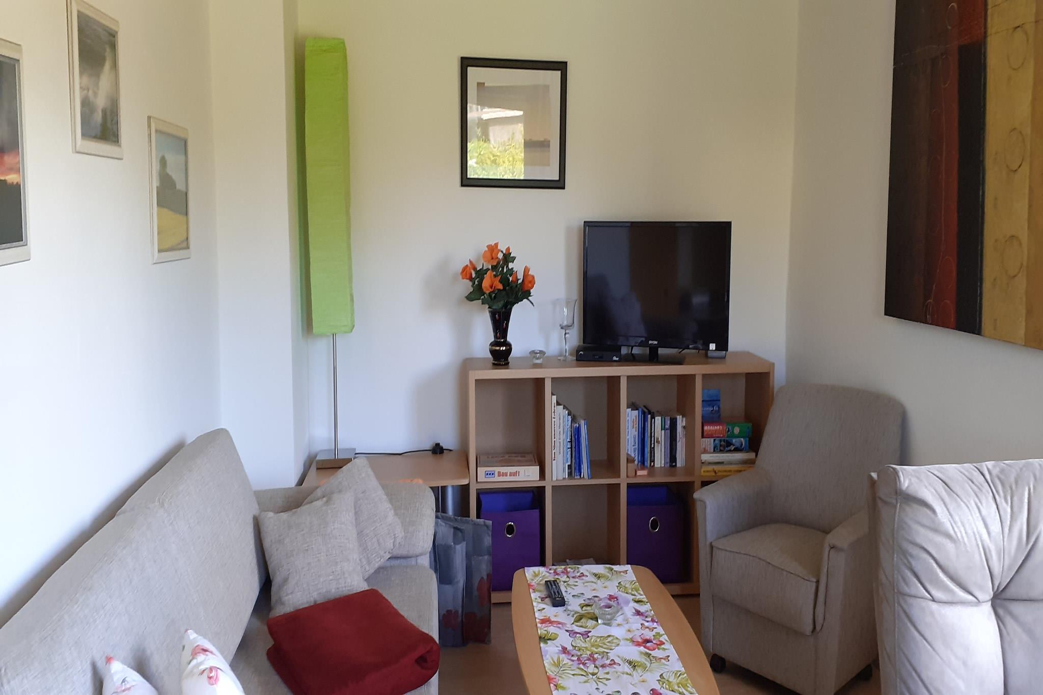 Stueetage: (Køkken(elkedel, brødrister, komfur(Komfur med fire kogeplader), kaffemaskine, ovn, mikrobølgeovn, køleskab(+ fryser)), Stue/soveværelse(dobbeltsovesofa, Fjernsyn(fladskærm), spisebord(4 personer), sofahjørne, radio), soveværelse(king size-seng), badeværelse(bruser, håndvask, toilet), varme, barnestol) terrasse, have(deles med ejer), havemøbler, grill, parkering, Solcreme