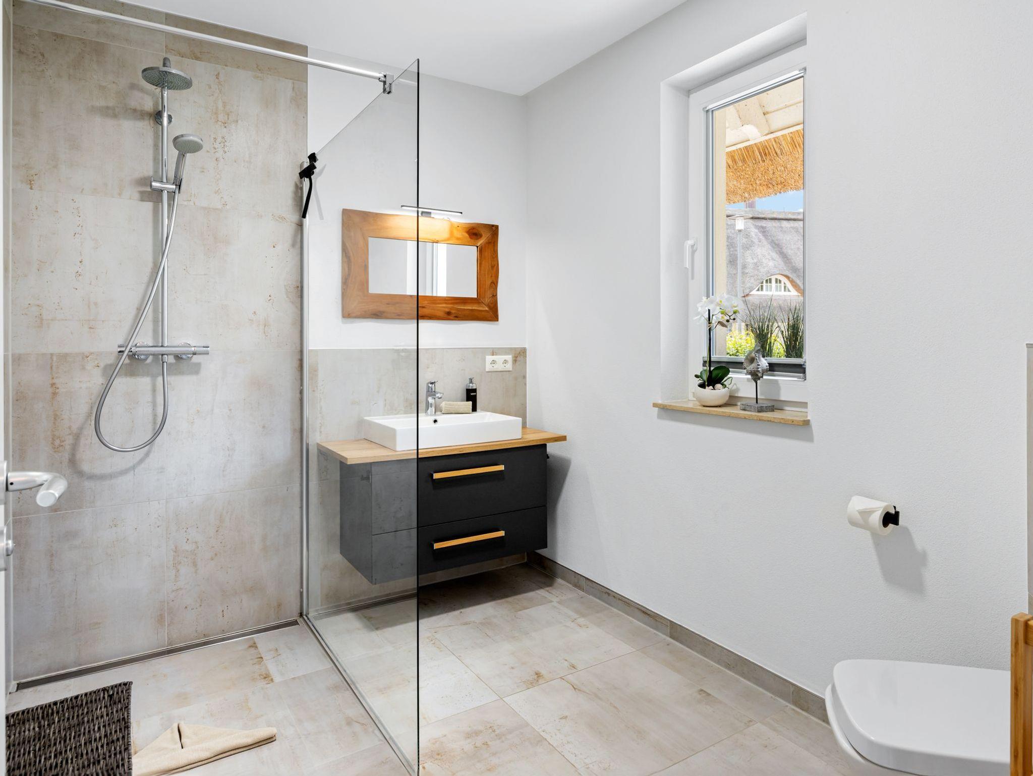 Das Highlight des Hauses liegt ebenfalls hier oben: das wunderschöne Bad mit Sauna. Großzügig, hell, ein Ort zum Entspannen. Während die Hitze wohltut, schweift der Blick über die Reetdächer der Umgebung - ein Gefühl von Luxus und Weite, ohne laut zu sein.