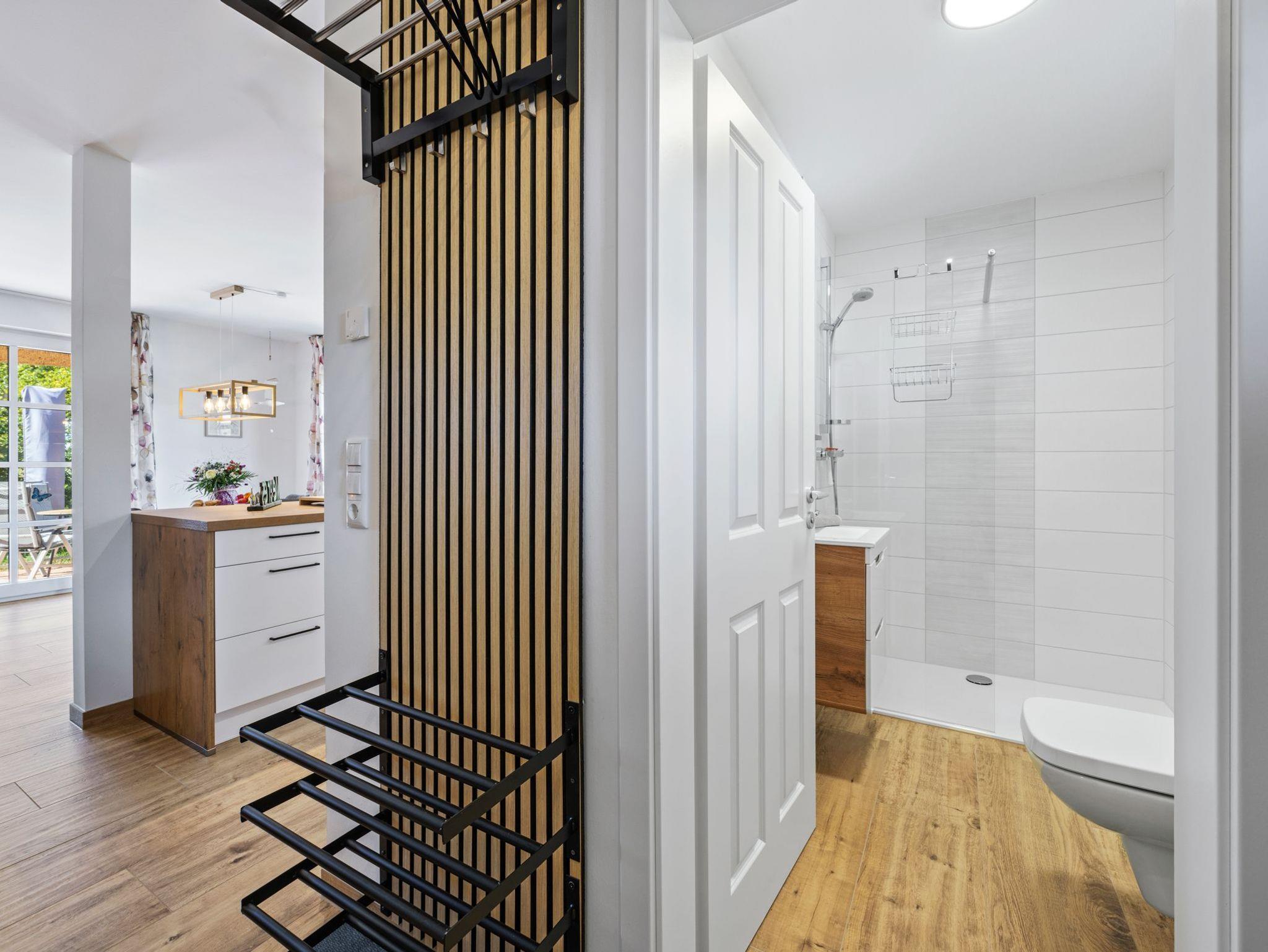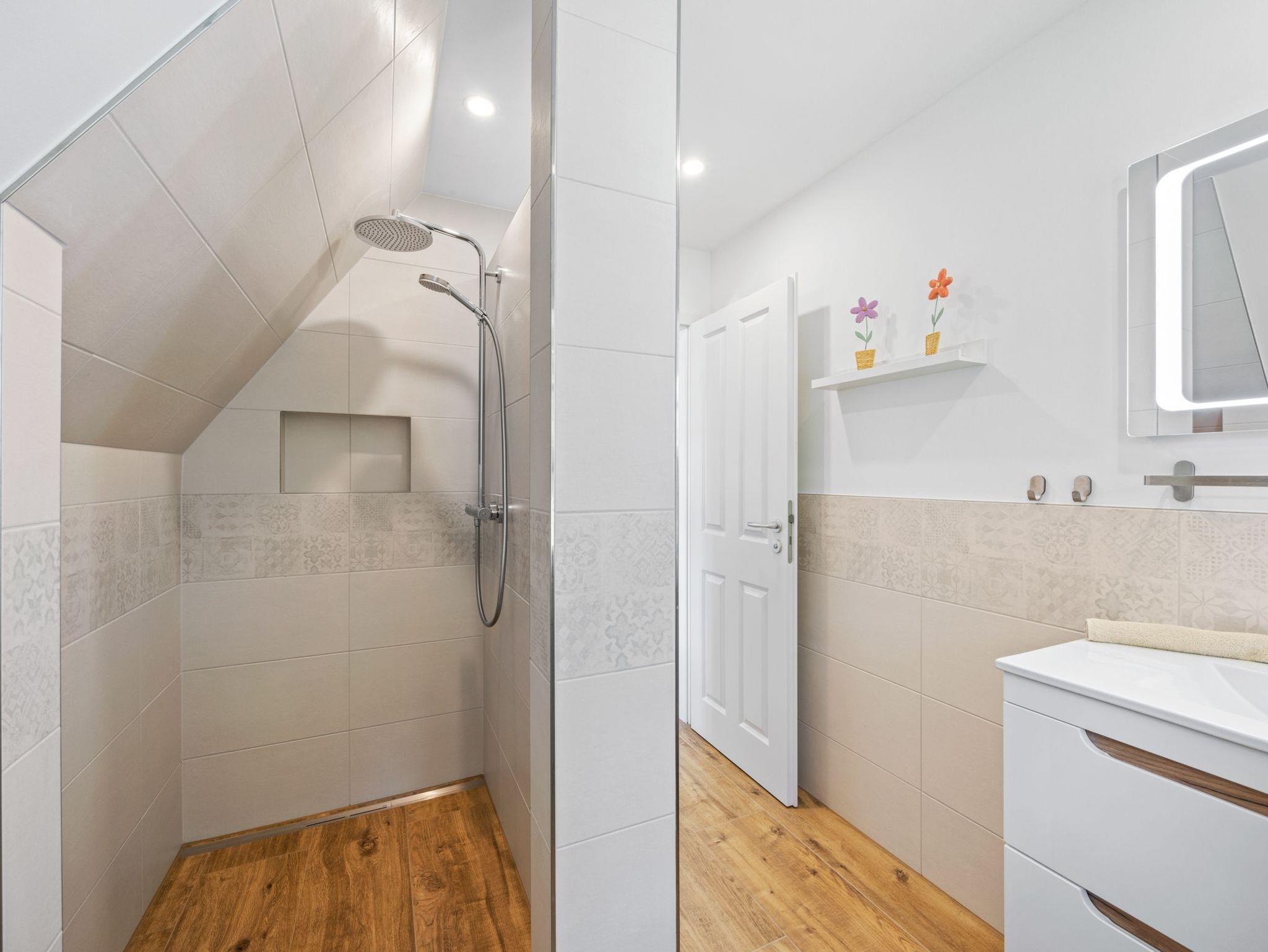 Das zweite Bad mit großer ebenerdiger Dusche und freien Blick in die Natur bietet echtes Urlaubsfeeling.