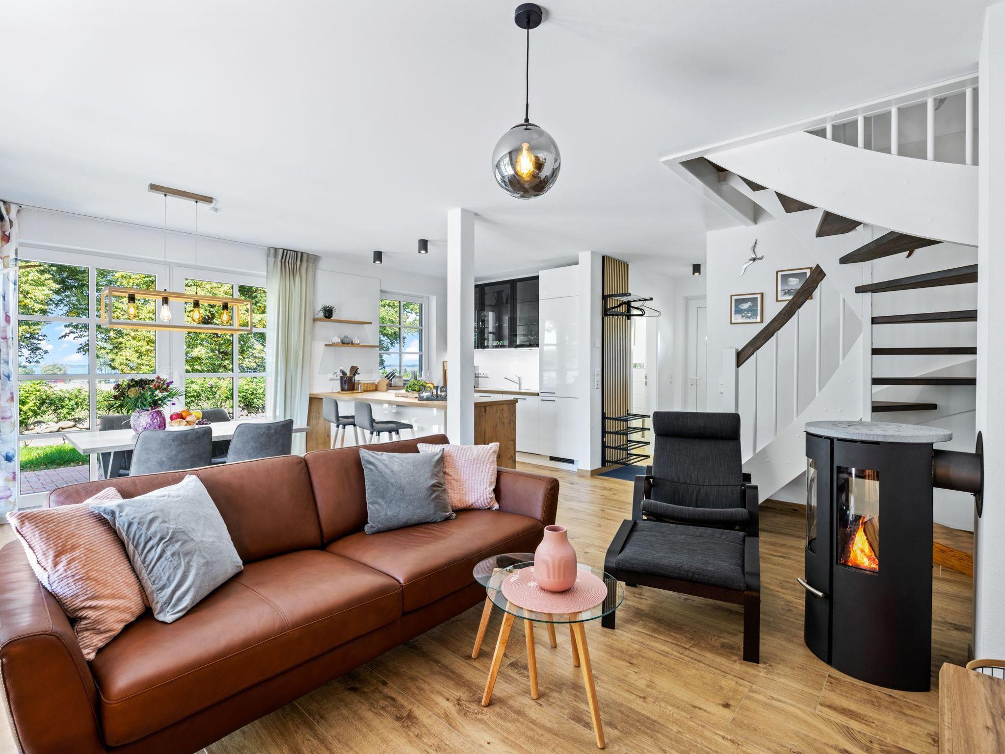 Ein kleiner Flur mit Blick in den offenen Wohnbereich zum entspannten Ankommen für alle Urlaubsgäste. Am Flur angrenzend befindet sich das erste Badezimmer mit ebenerdiger Dusche. Ein kleiner Hauswirtschaftsraum bietet Platz für die Waschmaschine. Großzügiger, stylisch und urgemütlich eingerichteter Wohn- Essbereich mit Ledersofa, Sessel und Kamin sowie Smart TV. Der Küchenbereich verfügt über einen großen Esstisch für 4 Personen und eine umfangreiche Ausstattung mit Geschirrspüler, Backofen, Herd mit 4 Kochfeldern, Wasserkocher, Kaffeevollautomat und jede Menge weitere Küchenutensilien. Aus dem offenen Küchen-Wohnbereich gelangt man direkt auf den schönen Terrassenbereich mit Blick in die freie und unverbaute Natur der Salzhaffregion. Hier kann man ebenso wunderbar den klaren Ostseehimmel genießen und einfach die Seele baumeln lassen