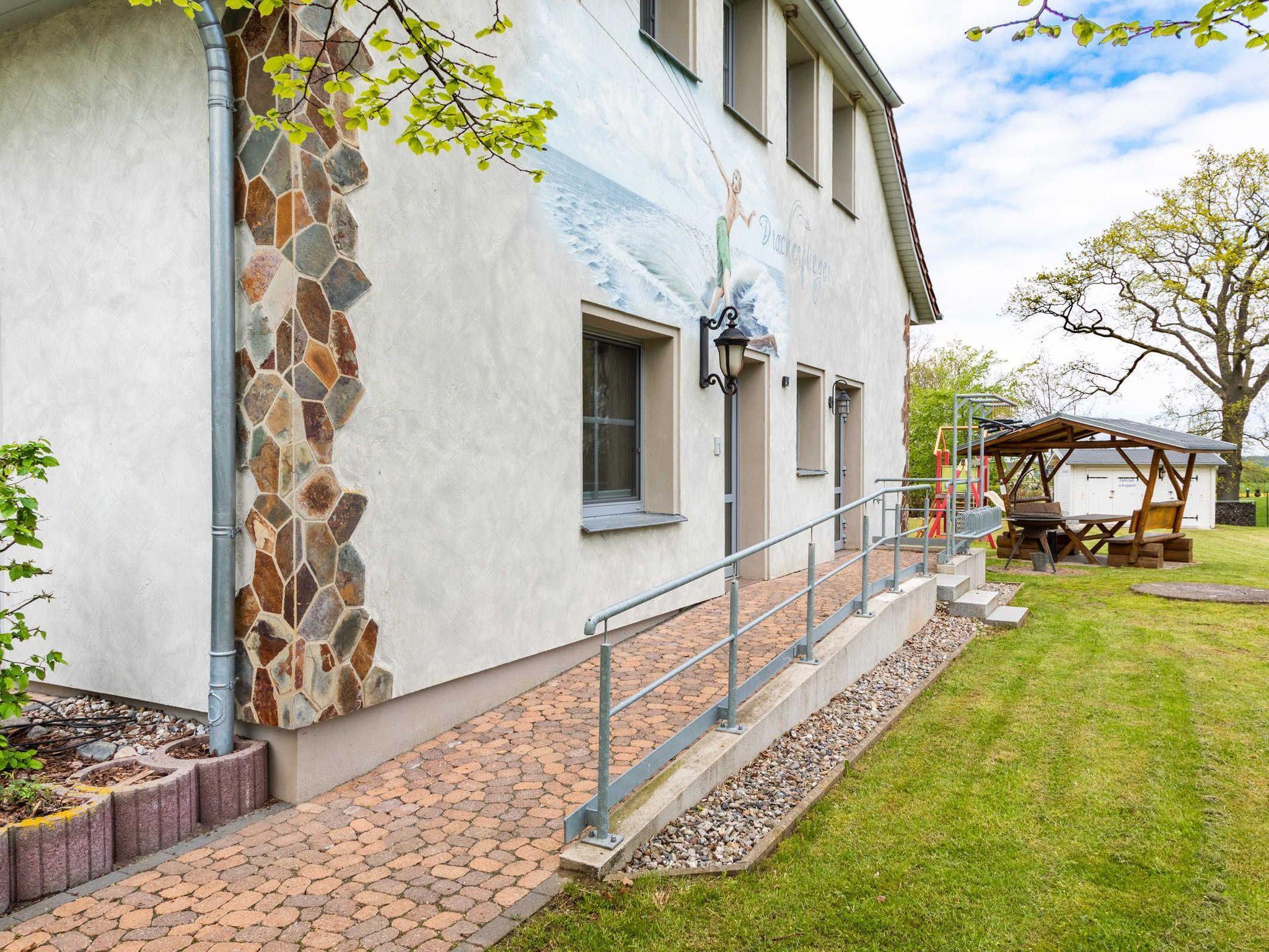 Kleiner Spielplatz auf dem Grundstück des Ostseeferienhauses Drachenflieger. Babybetten inkl. Bettzeug leihbar, Babyhochstühle, Wickelauflage, Töpfchen, Schemel. Flacher, seichter Naturstrand 700m. Kindersurfkurse am Strand. Großer Spielplatz im Ort 100m.