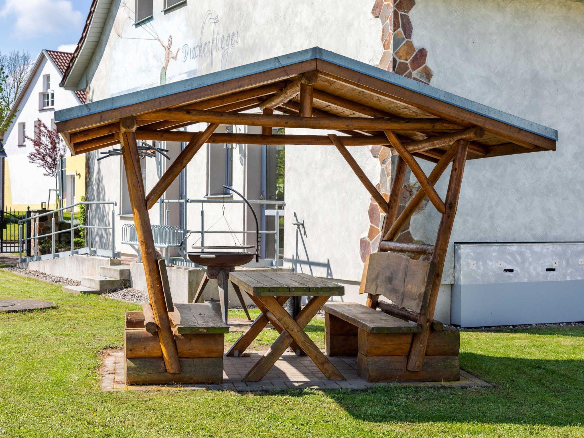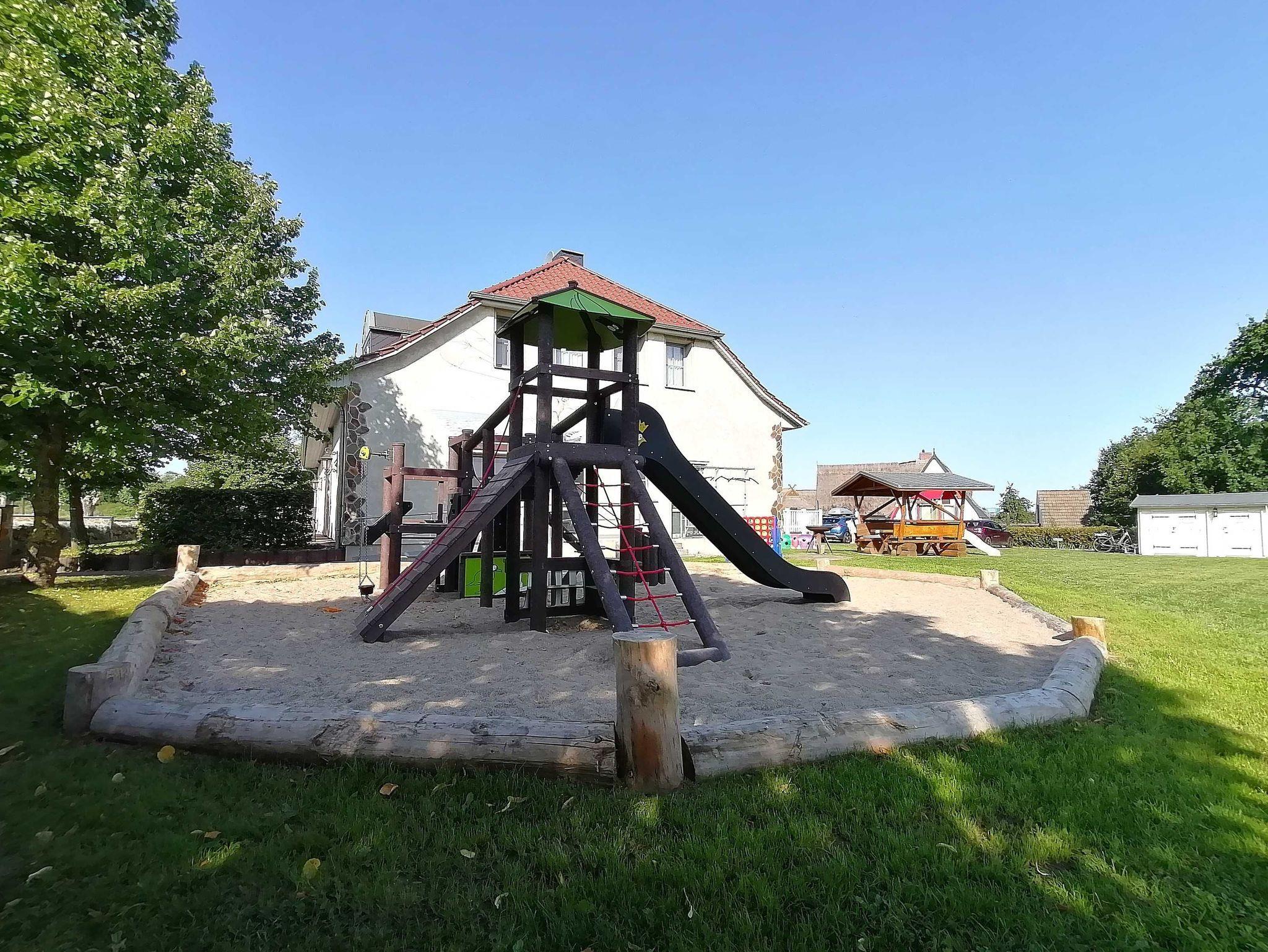 Kleiner Spielplatz auf dem Grundstück des Ostseeferienhauses Drachenflieger. Babybetten inkl. Bettzeug leihbar, Babyhochstühle, Wickelauflage, Töpfchen, Schemel. Flacher, seichter Naturstrand 700m. Kindersurfkurse am Strand. Großer Spielplatz im Ort 100m.
