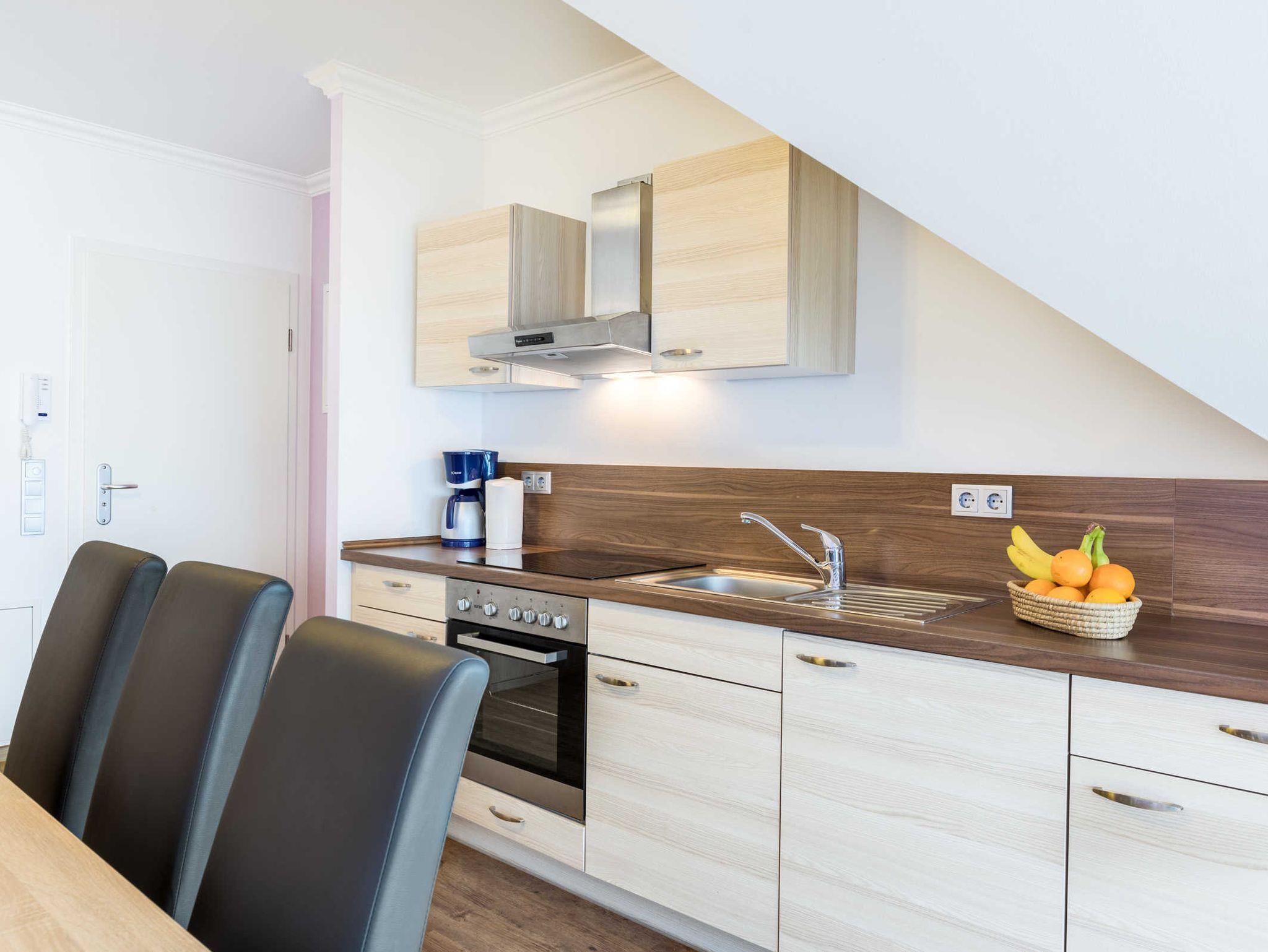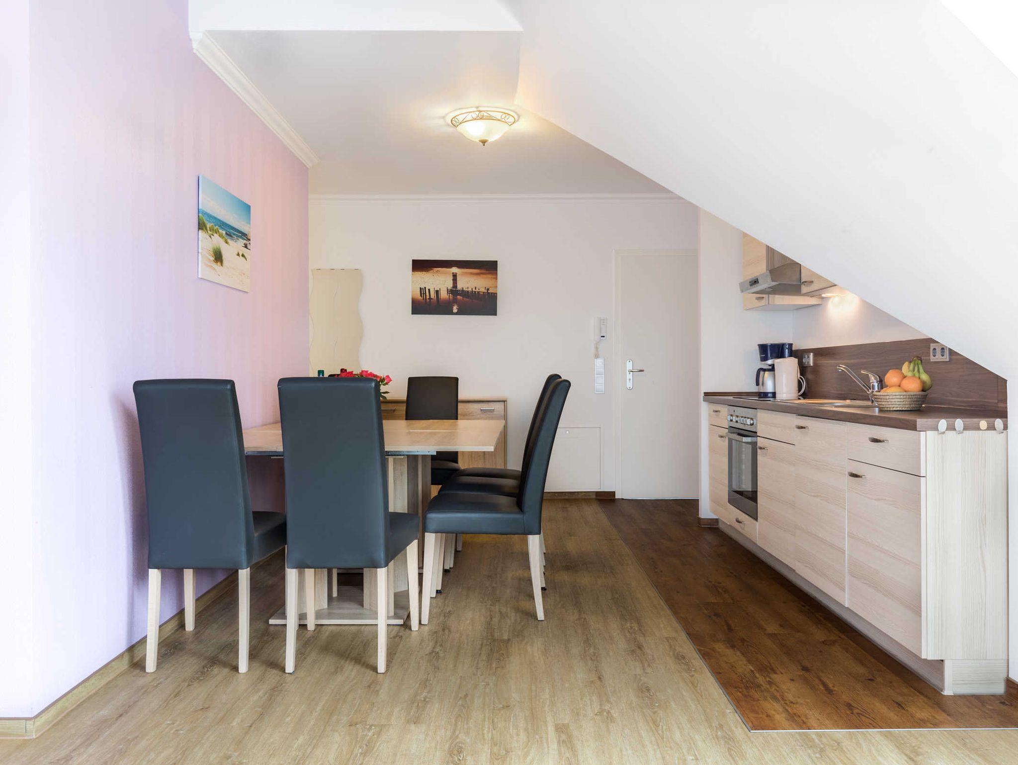 Die helle und großzügige Ferienwohnung Kerstin befindet sich im Obergeschoss des Ostseeferienhauses Drachenflieger. Die Ferienwohnung verfügt über zwei separte Schlafzimmer mit Doppelbett und Kleiderschrank, ein Schlafzimmer mit zusätzlichem Einzelbett. Wohn- Essbereich mit umfangreich ausgestatteter Küchenzeile (Kühlschrank mit Gefrierfach, 4- Platten- Herd, Backofen, Kaffeemaschine, Wasserkocher, Toaster) sowie Essbereich und Sitzecke mit ausziehbarer bequemer Schlafcouch.Vom Wohnbereich gelangen Sie auf den großen Holzbalkon mit herrlichem Blick über die weite Ostseelandschaft.Bad mit Dusche und WC.