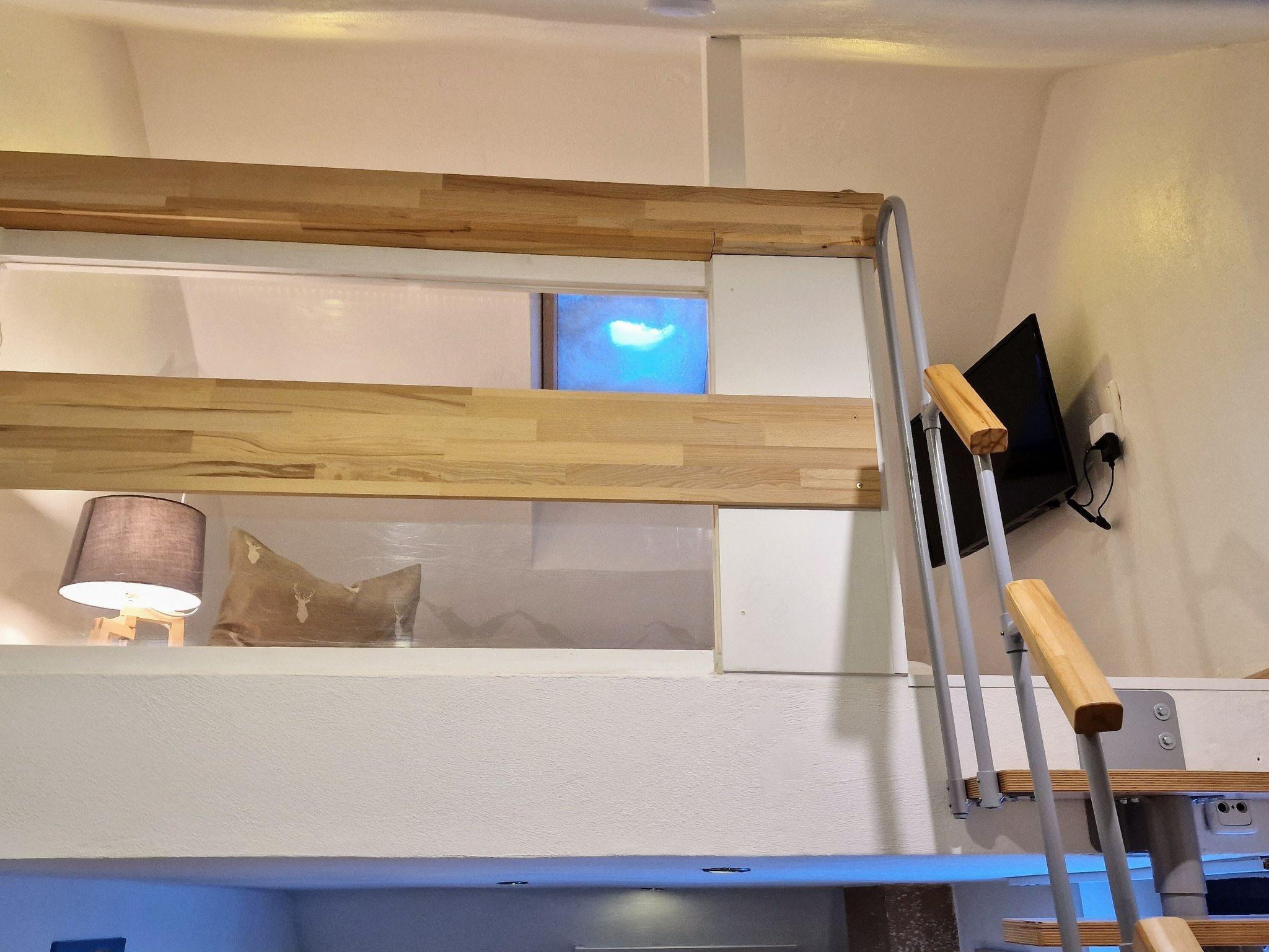 Inside, the flat boasts cosy furnishings. The bedroom is furnished with a comfortable double bed and a smart TV. The living and dining area invites you to relax with a kitchen, a cosy sofa bed and another Smart flat-screen TV. There is a special sleeping option for teenagers or children aged 12 and over: a small gallery in the sloping roof, which serves as a private "kingdom of heaven". The bathroom has a small shower and modern fittings, leaving nothing to be desired.