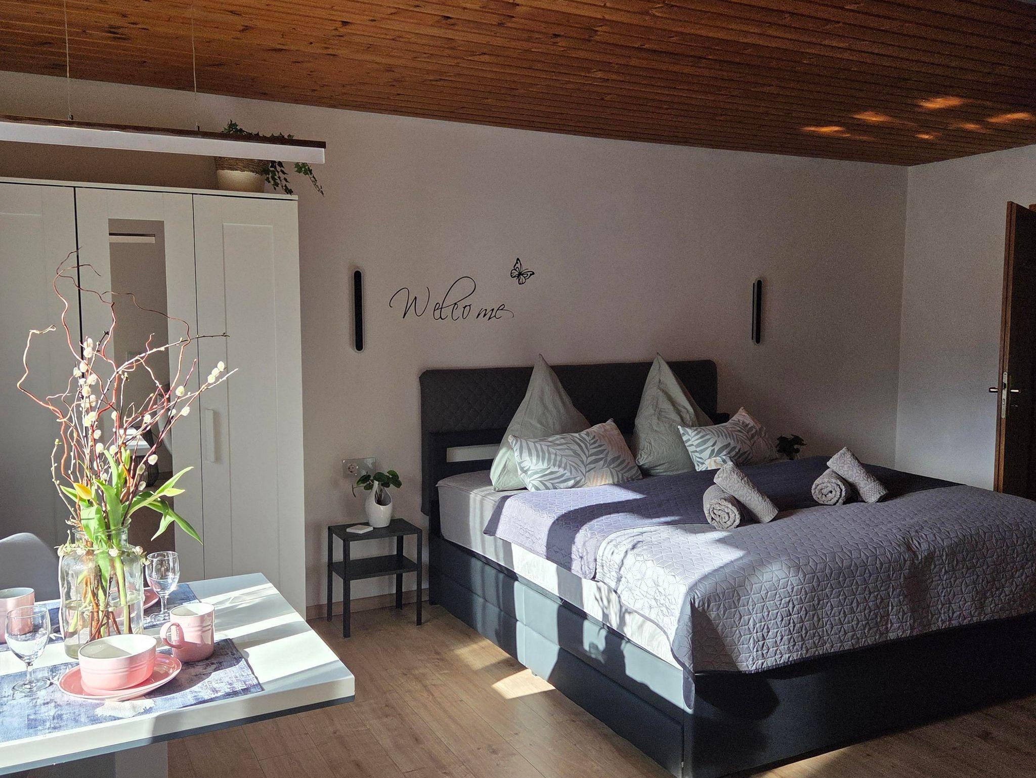 Das Appartamente besteht aus einem Zimmer mit Schlaf-, Wohn- und Essbereich, einer Kochnische und verfügt über ein privates Badzimmer und einen Balkon mit Bergblick auf den Breitenberg und Kienberg. Die Küche ist sehr gut ausgestattet. Es stehen Ihnen Spülmittel, eine Senseo- oder Filterkaffeemaschine, Kühlschrank, Herd, Geschirr, Kochutensilien, Geschirrtücher, Zucker, Öl, Essig, Gewürze, Küchenpapier, Seife, Klopapier, Handtücher, Bettwäsche uws. zur Verfügung. Weitere Utensilien stellen wir Ihnen auf Anfrage auch gerne zur Verfügung, wie z. B. Toaster oder Haartrockner. Als Begrüßung erwarteten Sie ein Begrüßungsbier aus der regionalen Brauerei.