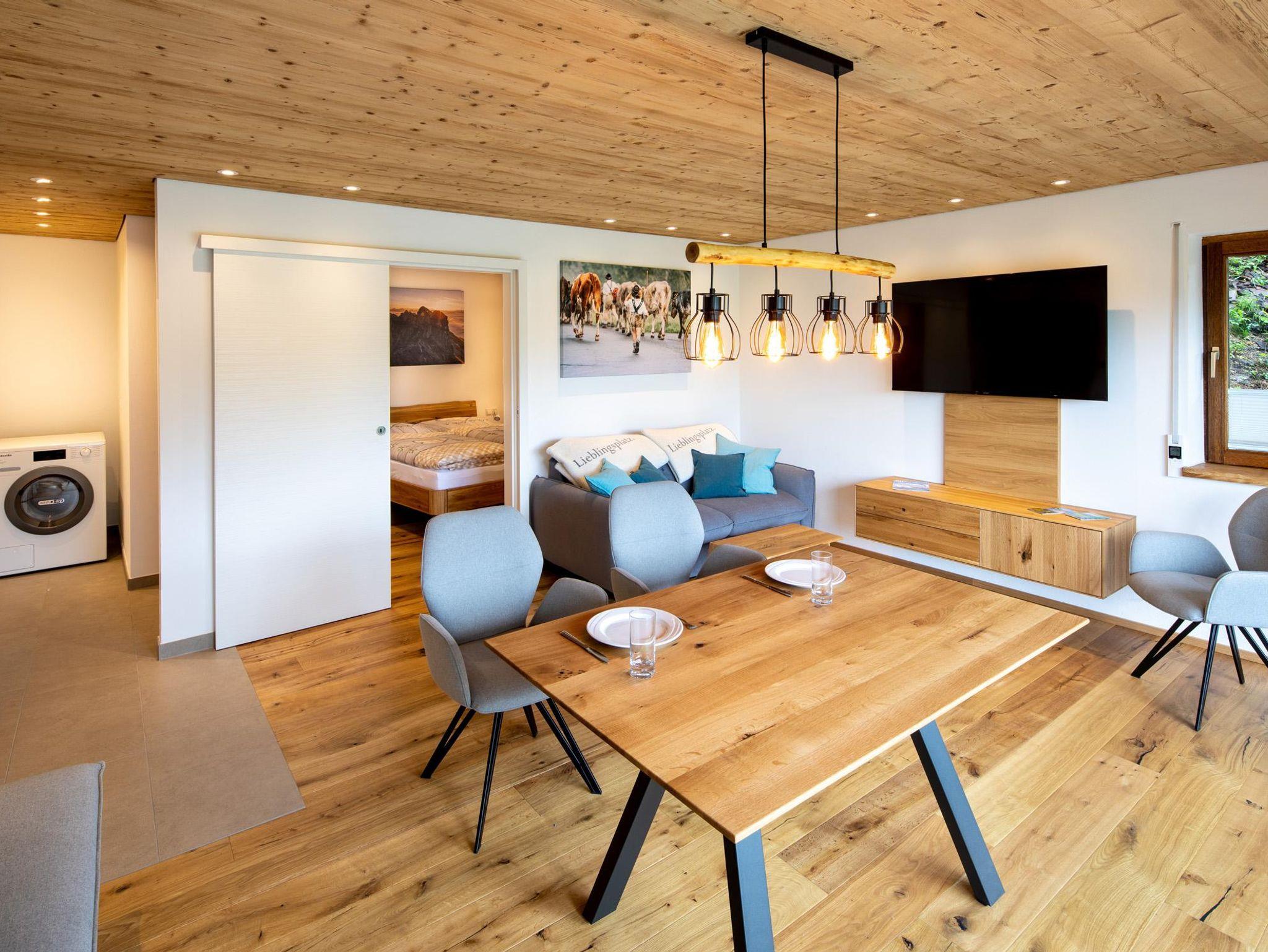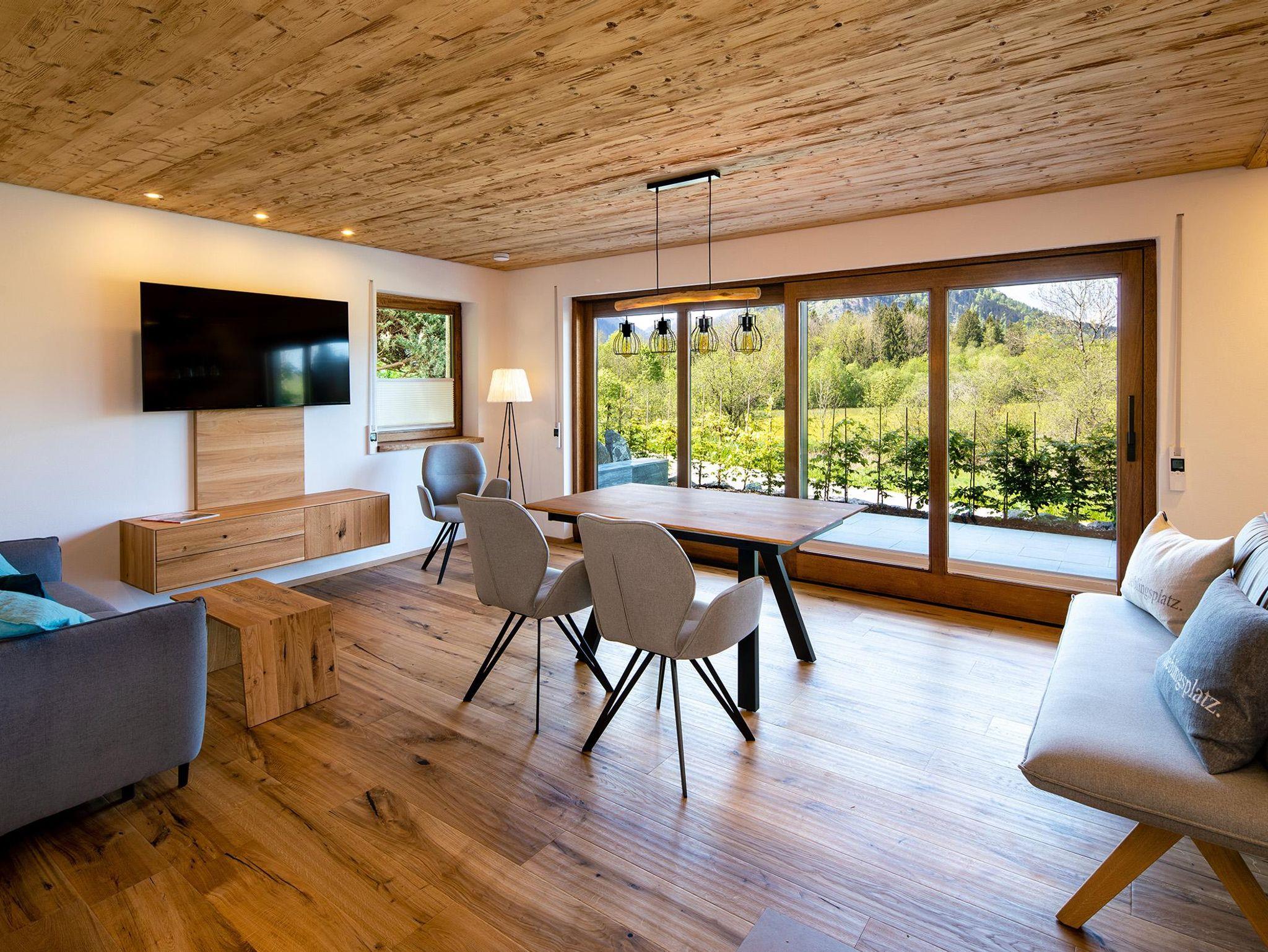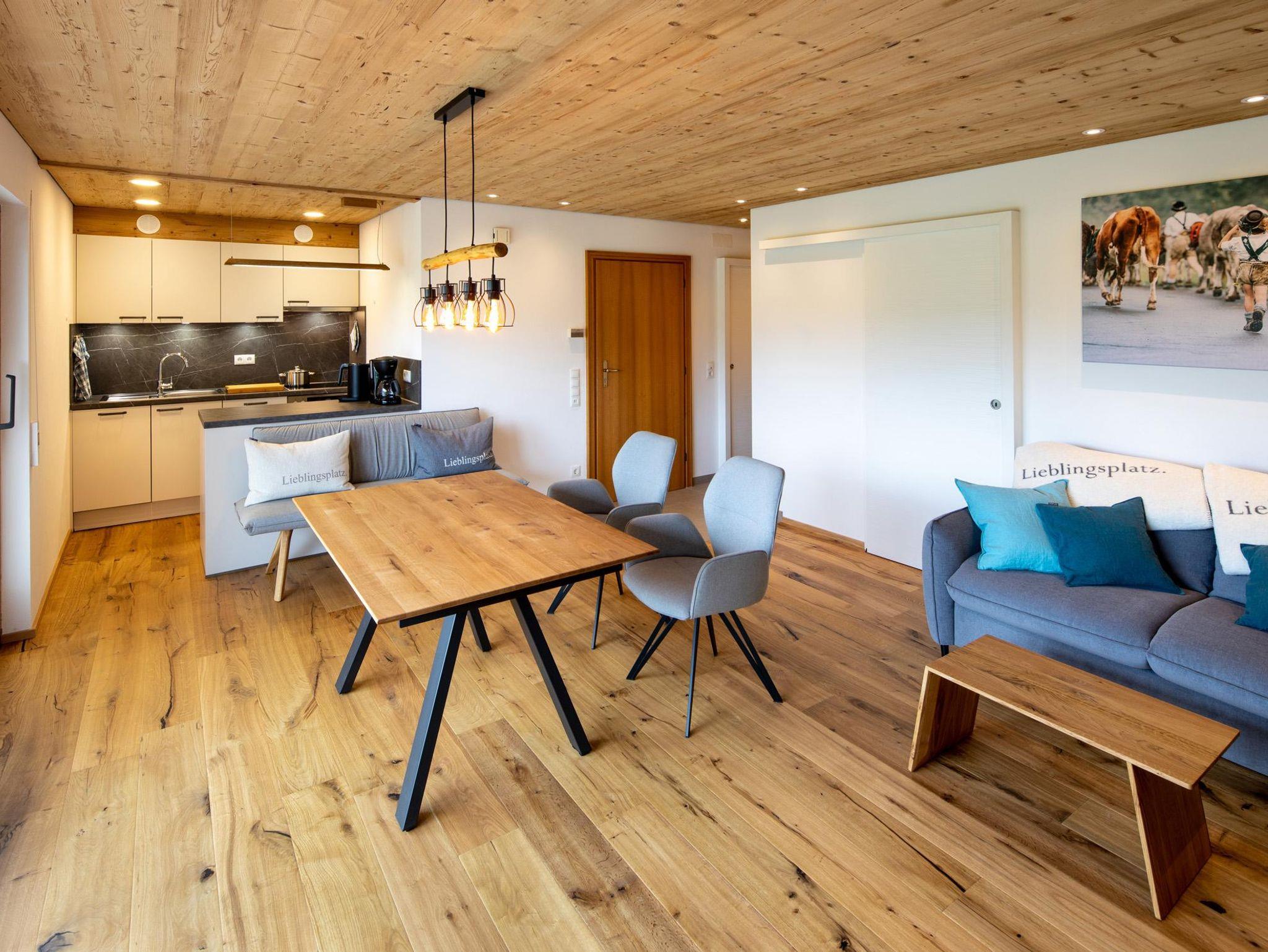 Hochwertig möblierte Nichtraucherwohnung mit gemütlichen Sitzgelegenheiten, von denen aus der Blick Richtung Berge zum Verweilen einlädt. Die Küche mit Herd und Spülmaschine von Miele ist gut ausgestattet. Neben Geschirr, Besteck und verschiedenen Gläser steht die Brotzeitbox und Thermoskanne für die nächste Tour bereit. Von Kaffeemaschine, Wasserkocher, Toaster, Zauberstab, bis hin zu Töpfen und Pfannen ist alles da.