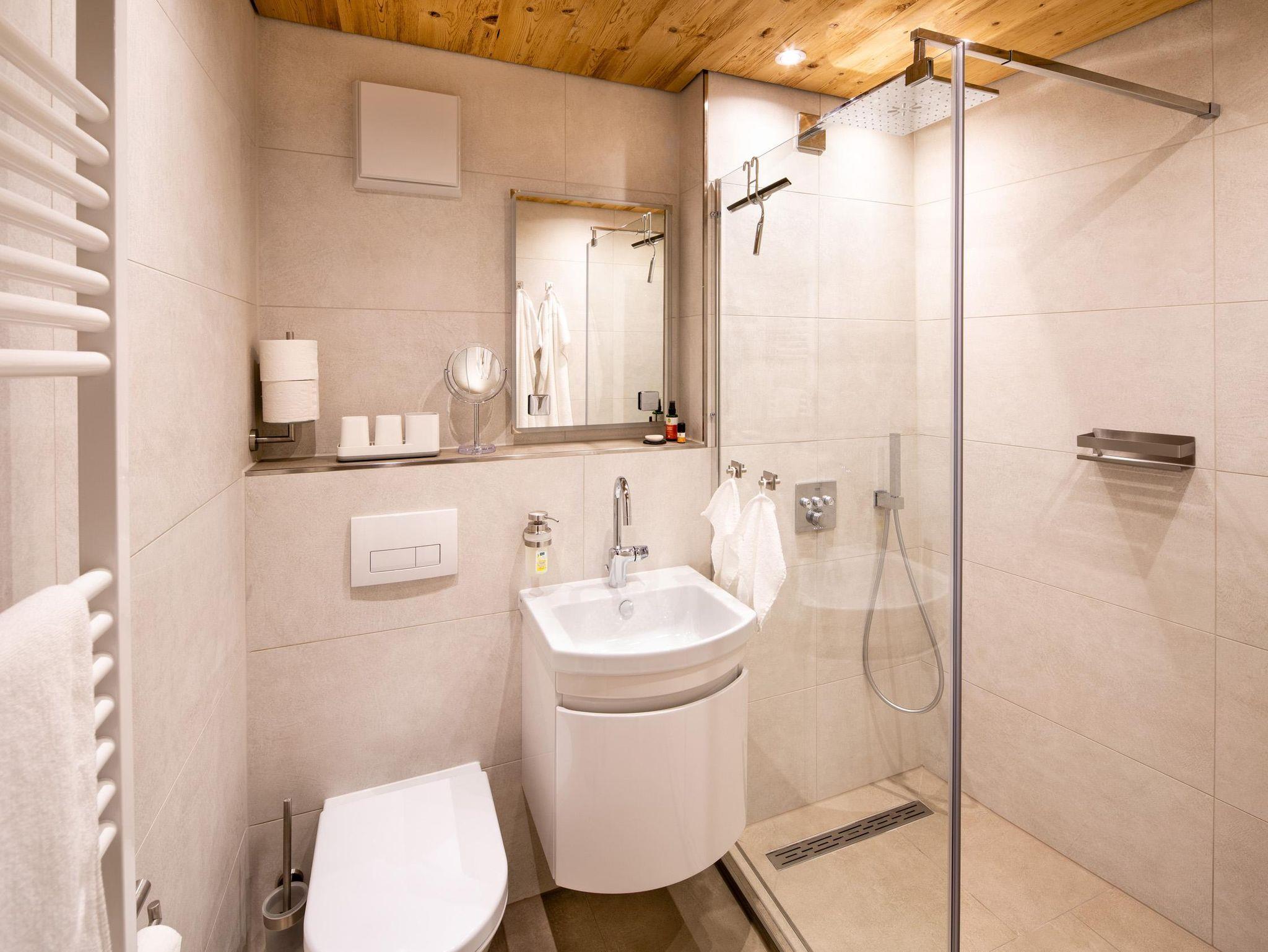 Das innenliegende Badezimmer mit Handtuchtrockner und Grohe Duschsystem ist bestückt mit Handtüchern, Kosmetikspiegel und Fön.