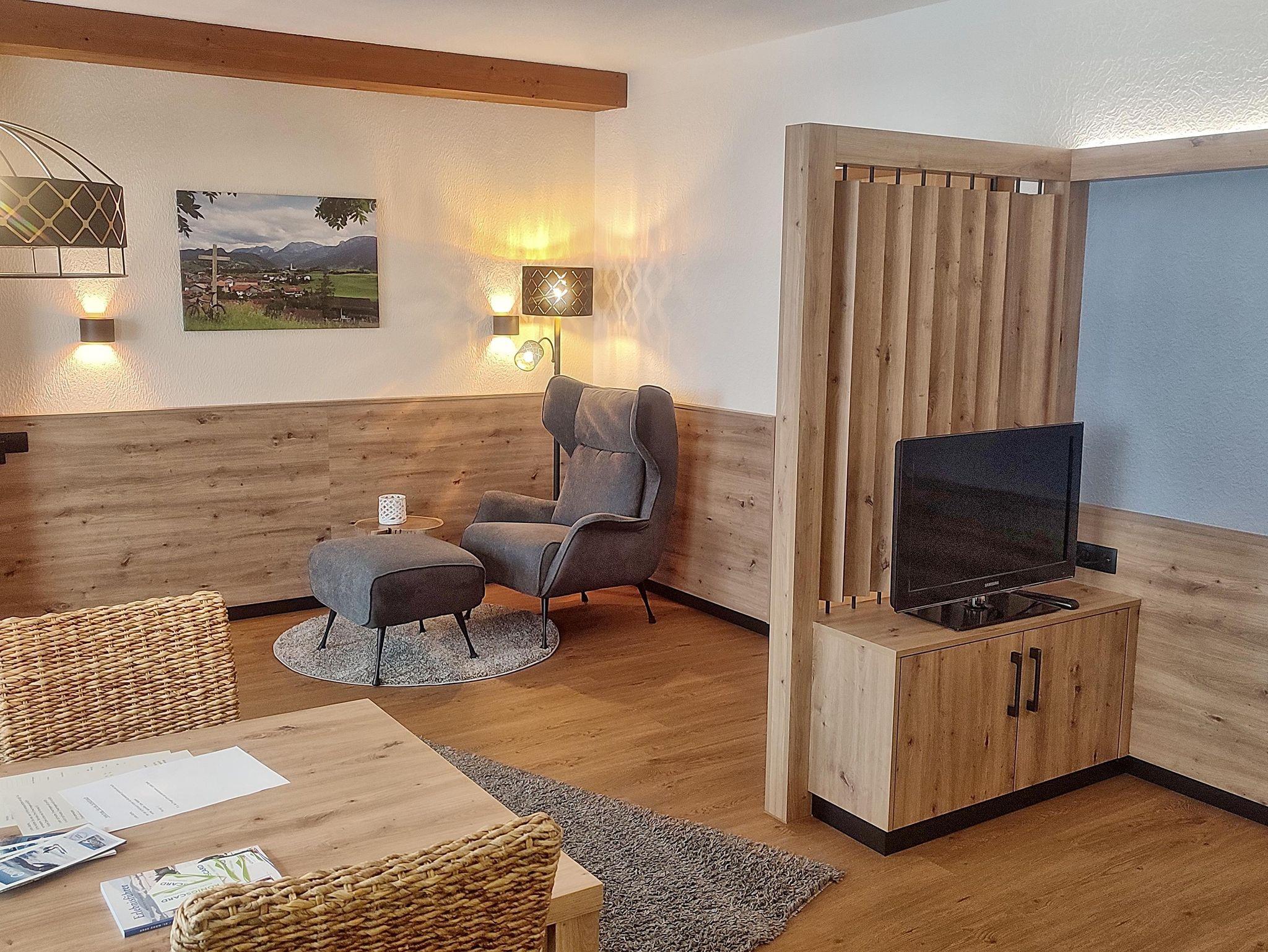 Wohnzimmer mit Küchenzeile und gemütlicher Fernsehecke, Schlafzimmer, Dusche/WC. Sonniger Südbalkon mit großartigem Blick auf den Breitbenberg.