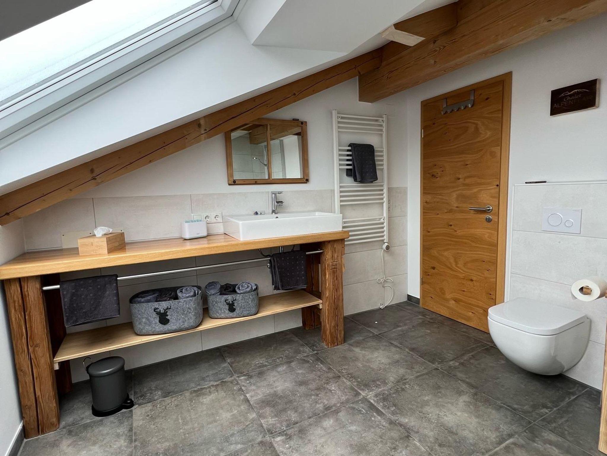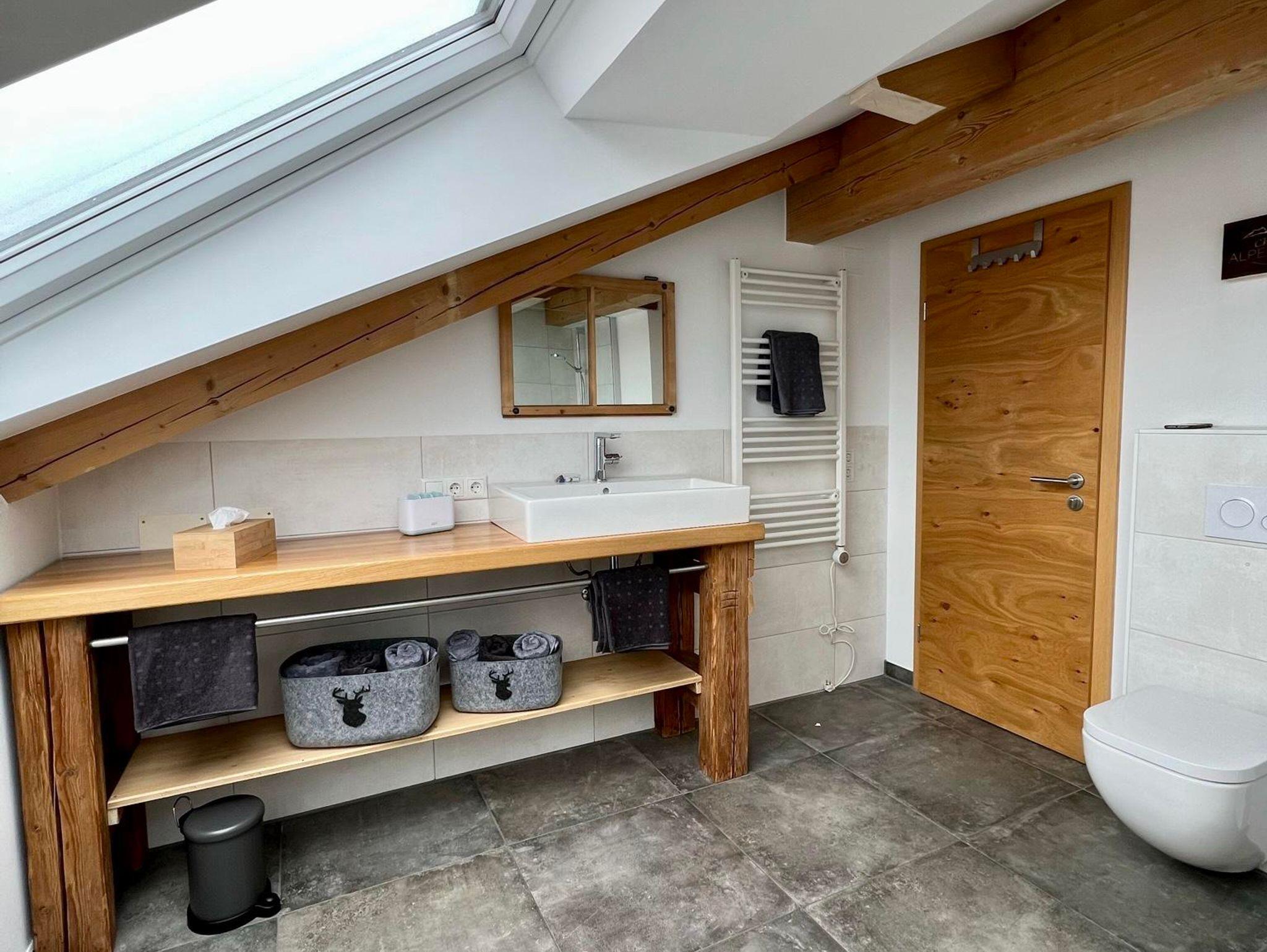 Bad: Dusche, Toilette, Waschbecken, zwei helle Dachfenster, Handtüchern (groß, klein; Auswechseln nach Absprache), Spiegel, Haarföhn, Handtuchtrockner