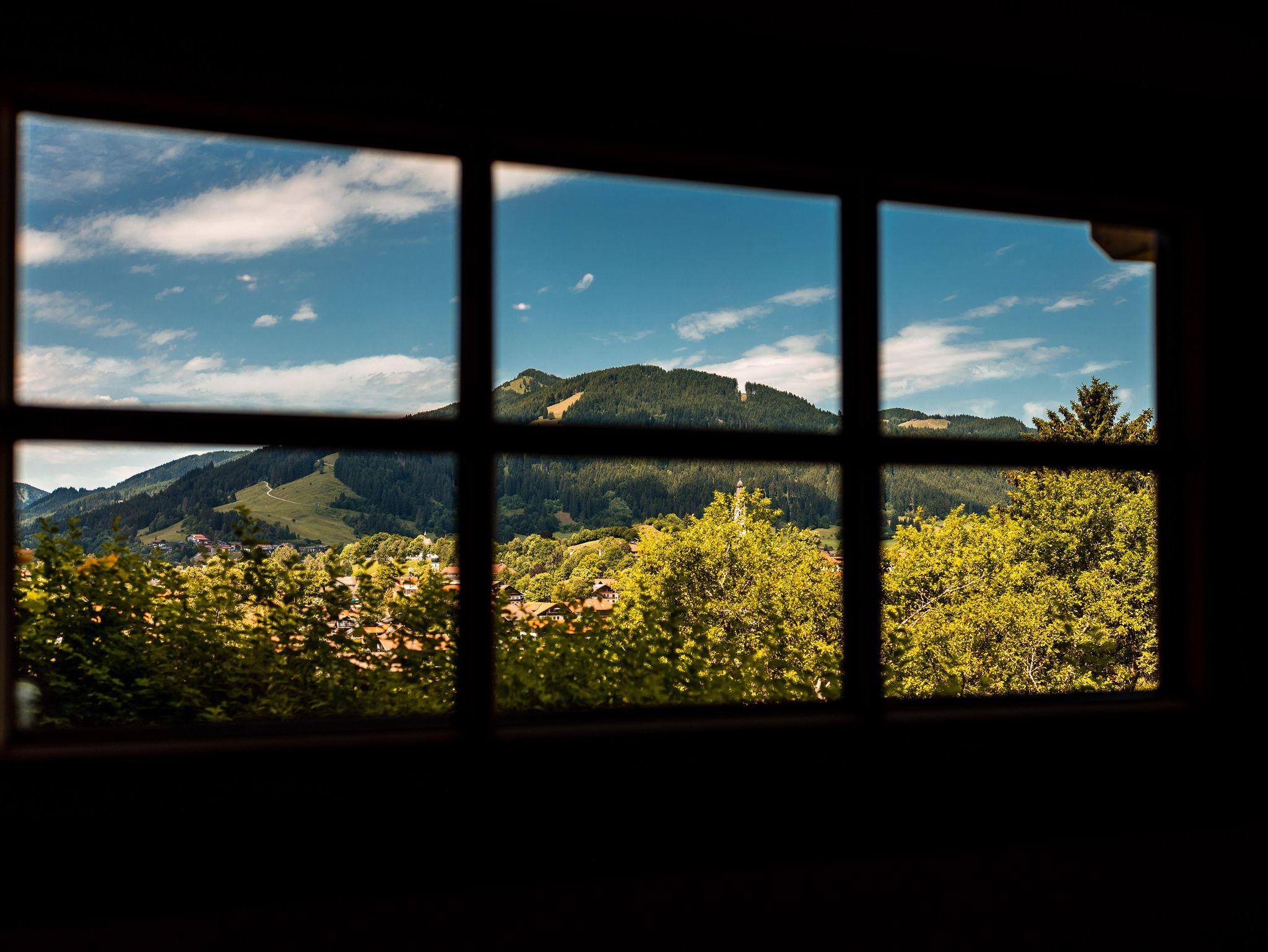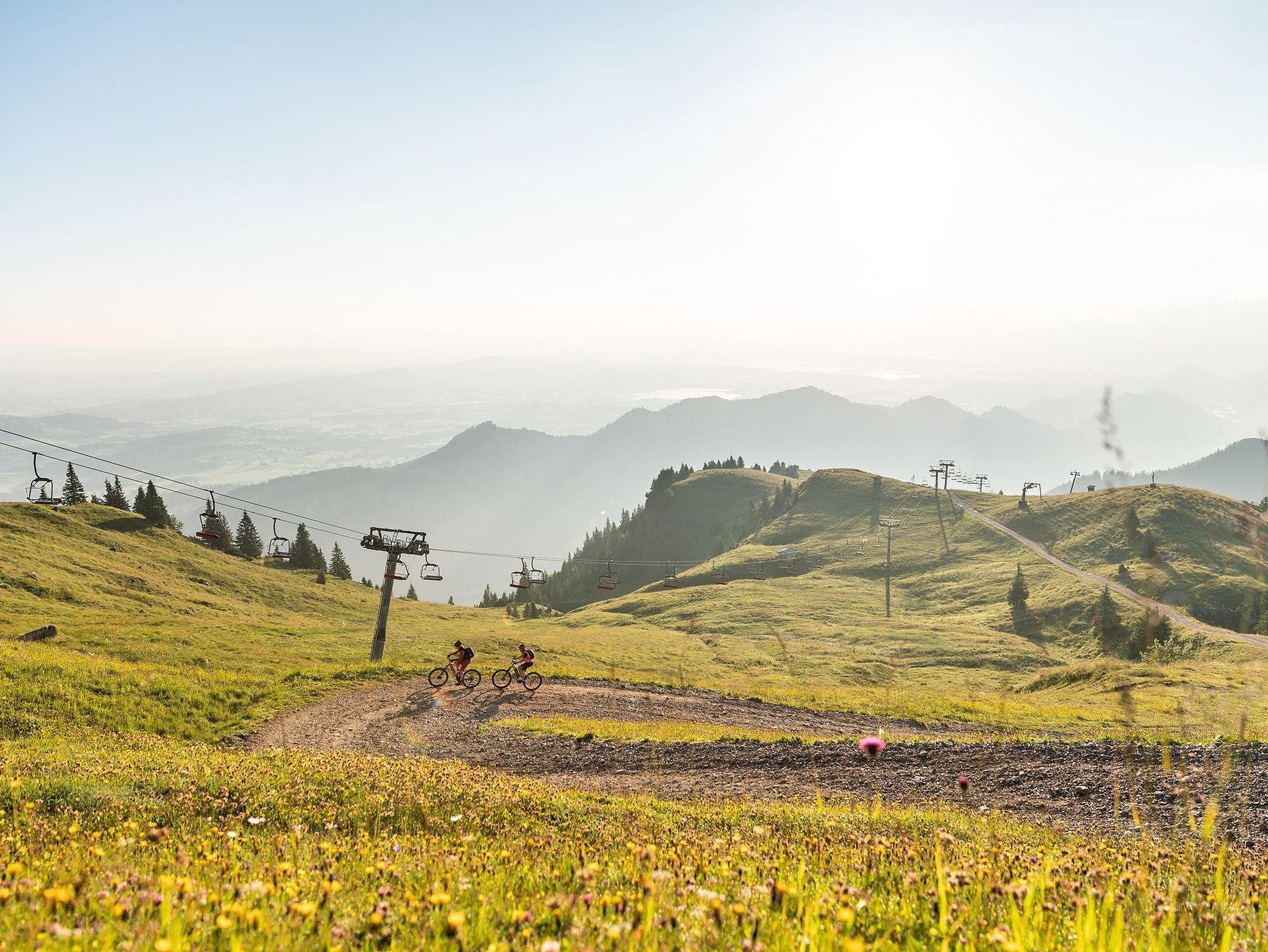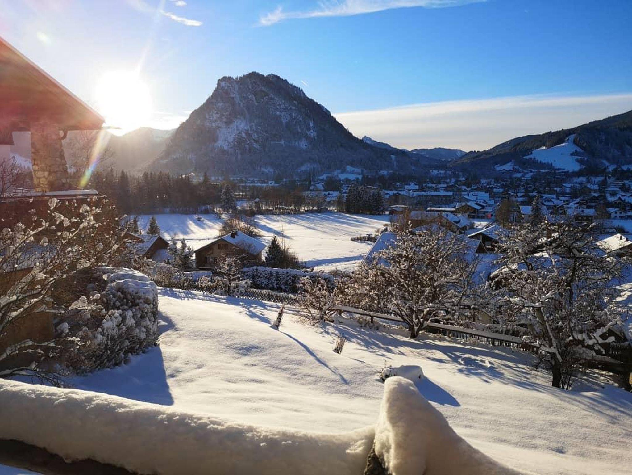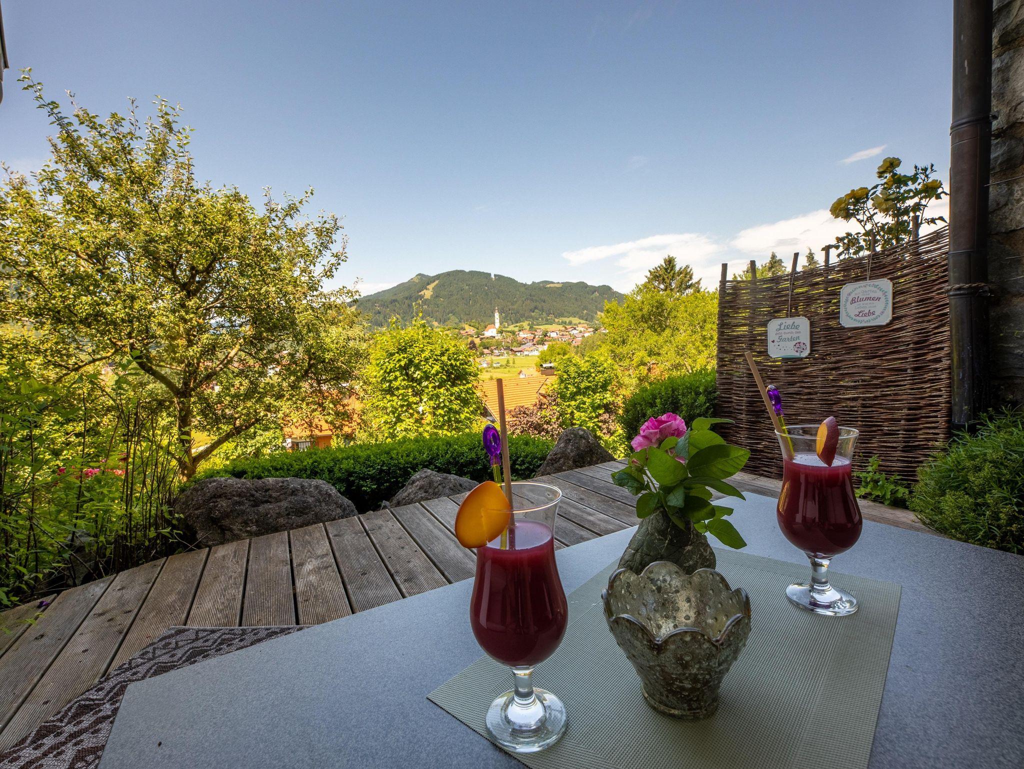 Terrasse mit eigener Sauna, Zugang zur Liegewiese und zum Barfußpfad, Panoramablick auf Pfronten und dessen Berge