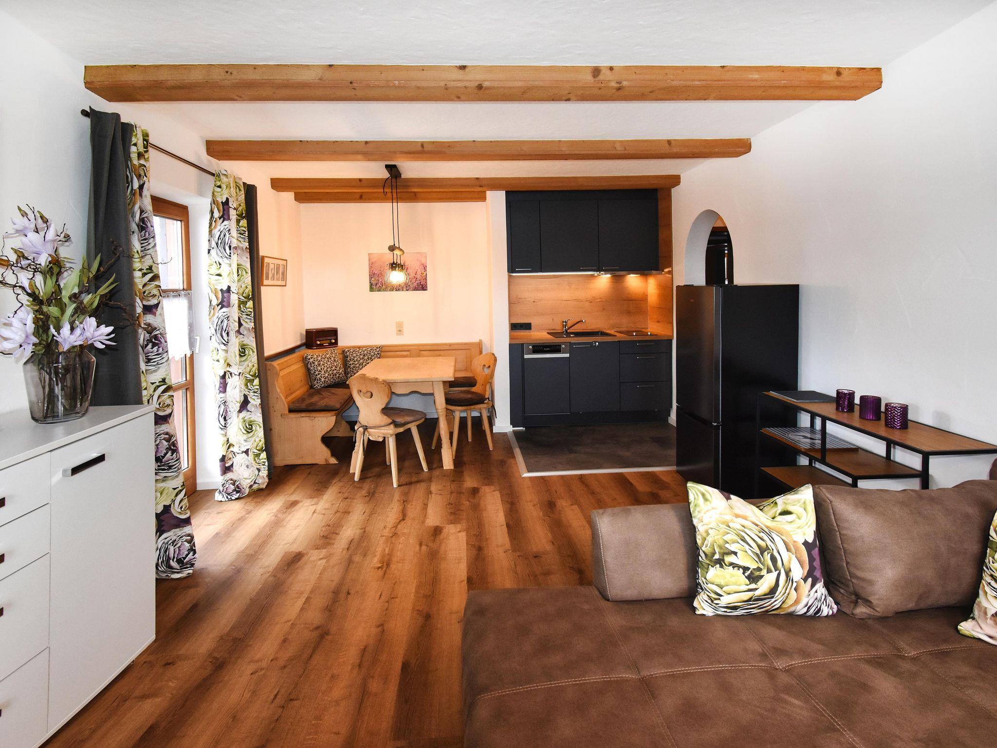 Neu renovierte, großzügig gestaltete Wohnung für 2-4 Personen im ersten Stock. Wohn-Essbereich mit ausziehbarer Eckganitur und KabelTV, Küchenzeile mit Spülmaschine, Kaffemaschine, Wasserkocher, Toaster, Eckbank, großer Standkühlschrank mit Gefrierfächer, Bad/WC, Schlafzimmer, Süd- und Westbalkon mit Bergblick auf beiden Seiten, allergikerfreundlich-Vinylböden.