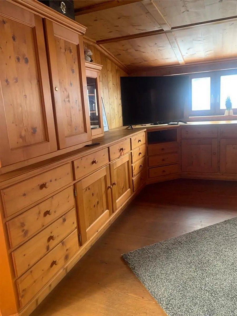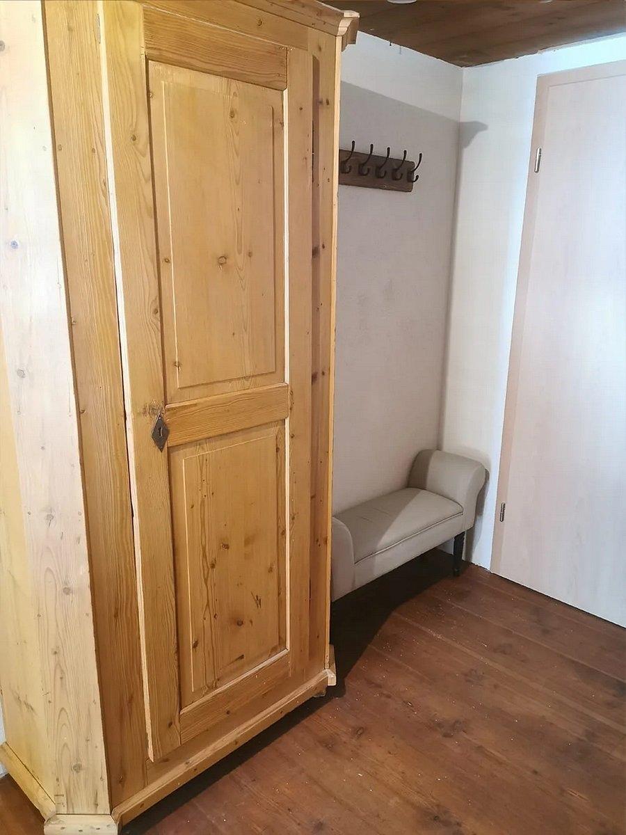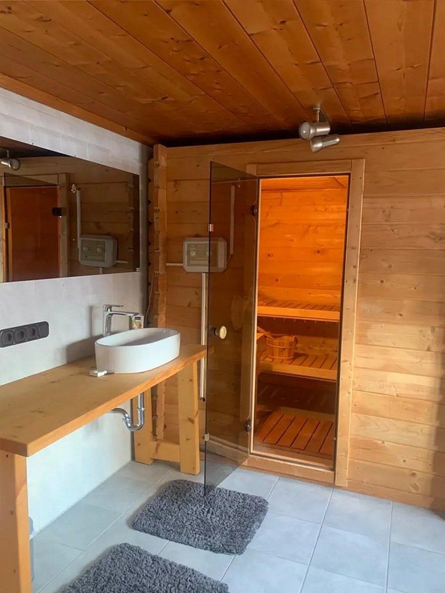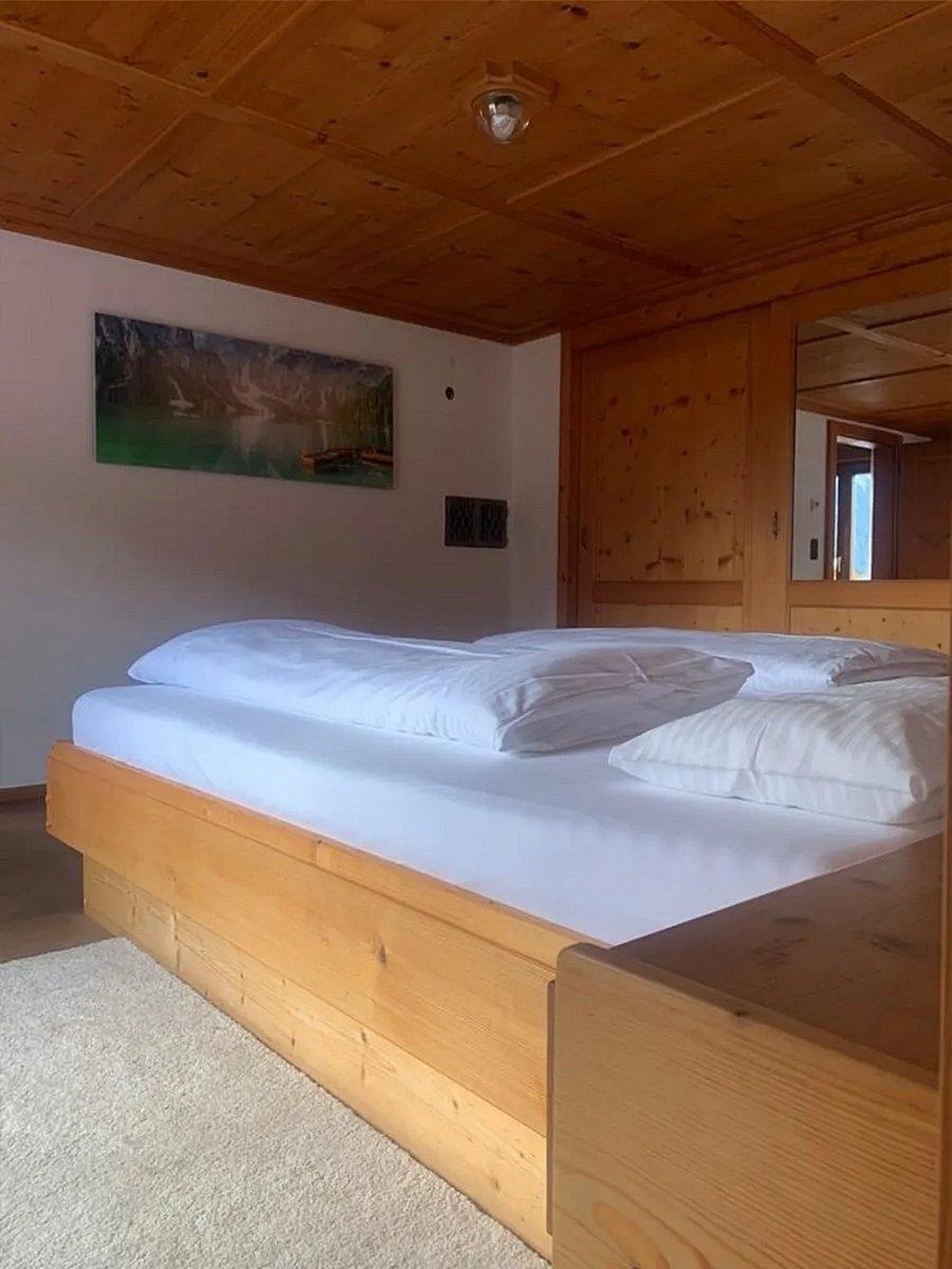 Ein sehr gemütliches Schlafzimmer, fast alles ist aus Holz, von hier aus blickt man direkt auf die Zugspitze. Das Badezimmer ist sehr großzügig und mit einer Sauna ausgestattet. Das WC ist separat im Badezimmer. Im Wohnzimmer gibt es eine Couch die zu einer vollwertigen Schlafcouch mit Matratze umgestaltet werden kann. Außerdem eine, zum Relaxen einladende Bank direkt neben dem Kachelofen. In der Küche gibt es eine Eckbank mit Esstisch, von hier aus hat man den Blick auf die Skipiste in Pfronten.