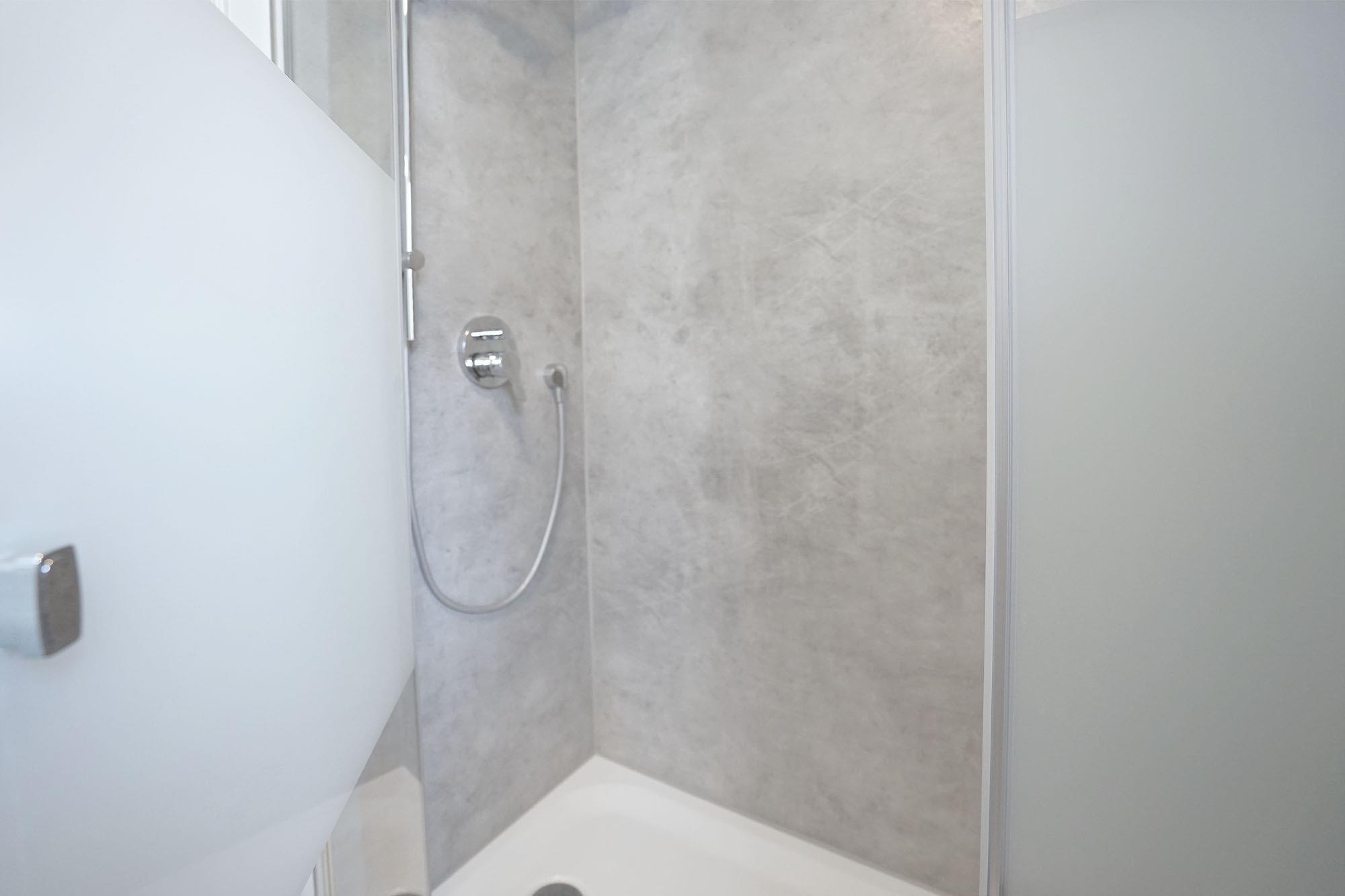 Bad mit Dusche, WC, Waschbecken, Spiegel und Föhn