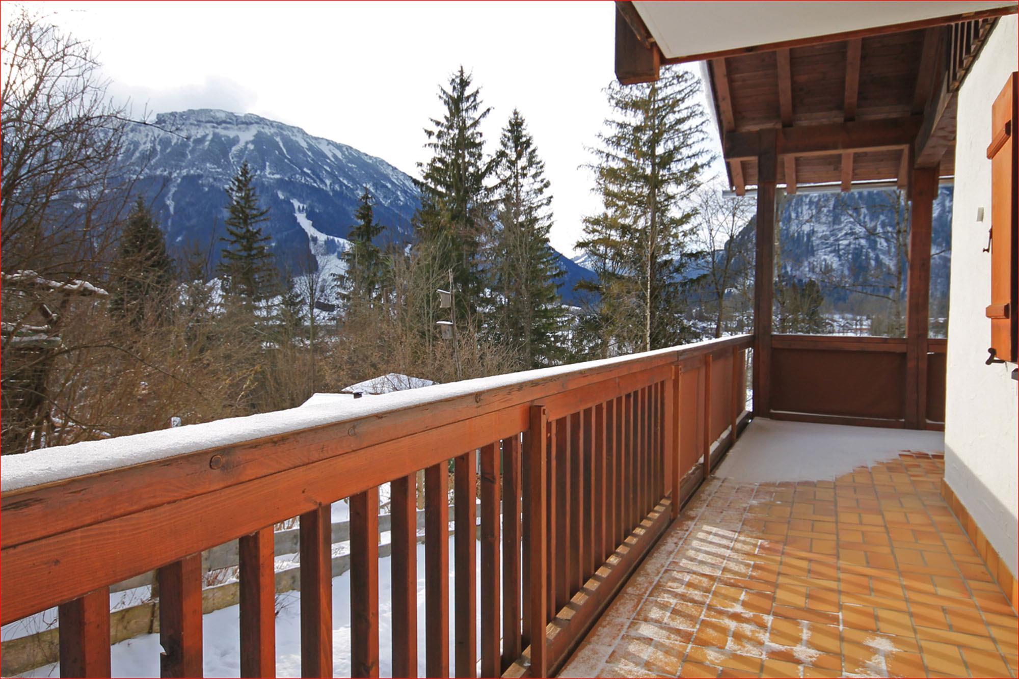 großzügiger überdachter Balkon mit Berg- und Wiesenblick und Balkonmöbel