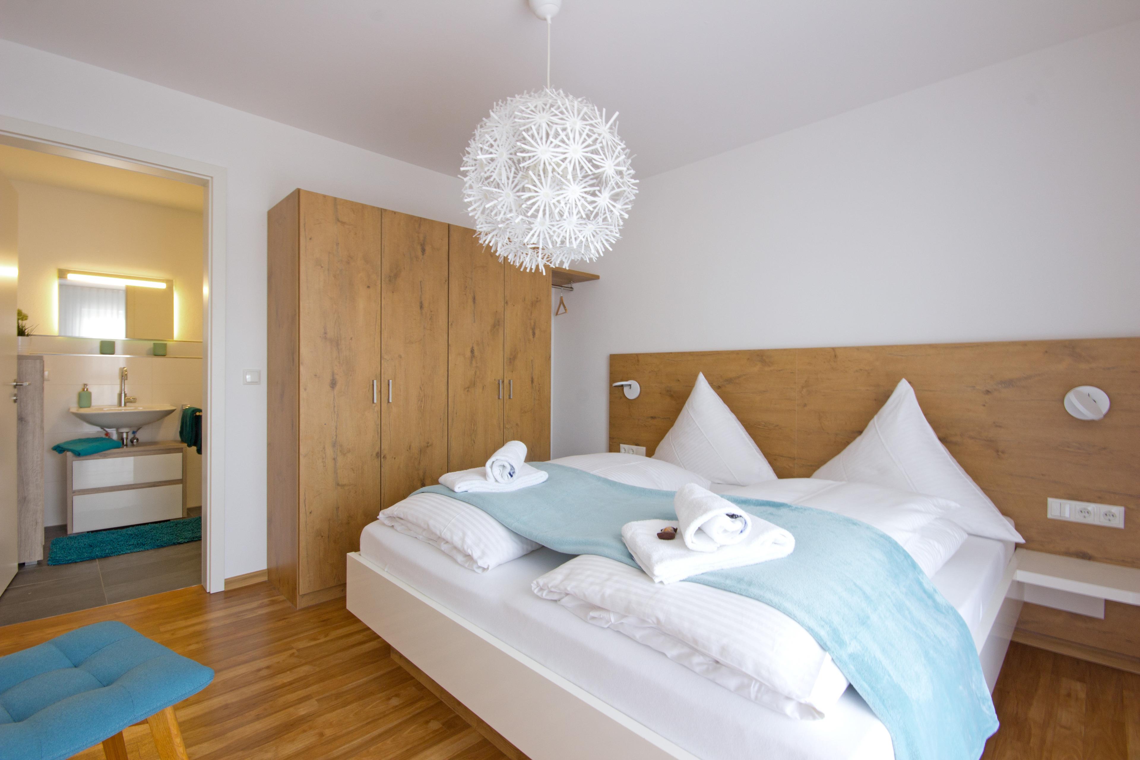 2 Schlafzimmer mit Doppelbett und Kleiderschrank, jedes mit eigenem Duschbad,