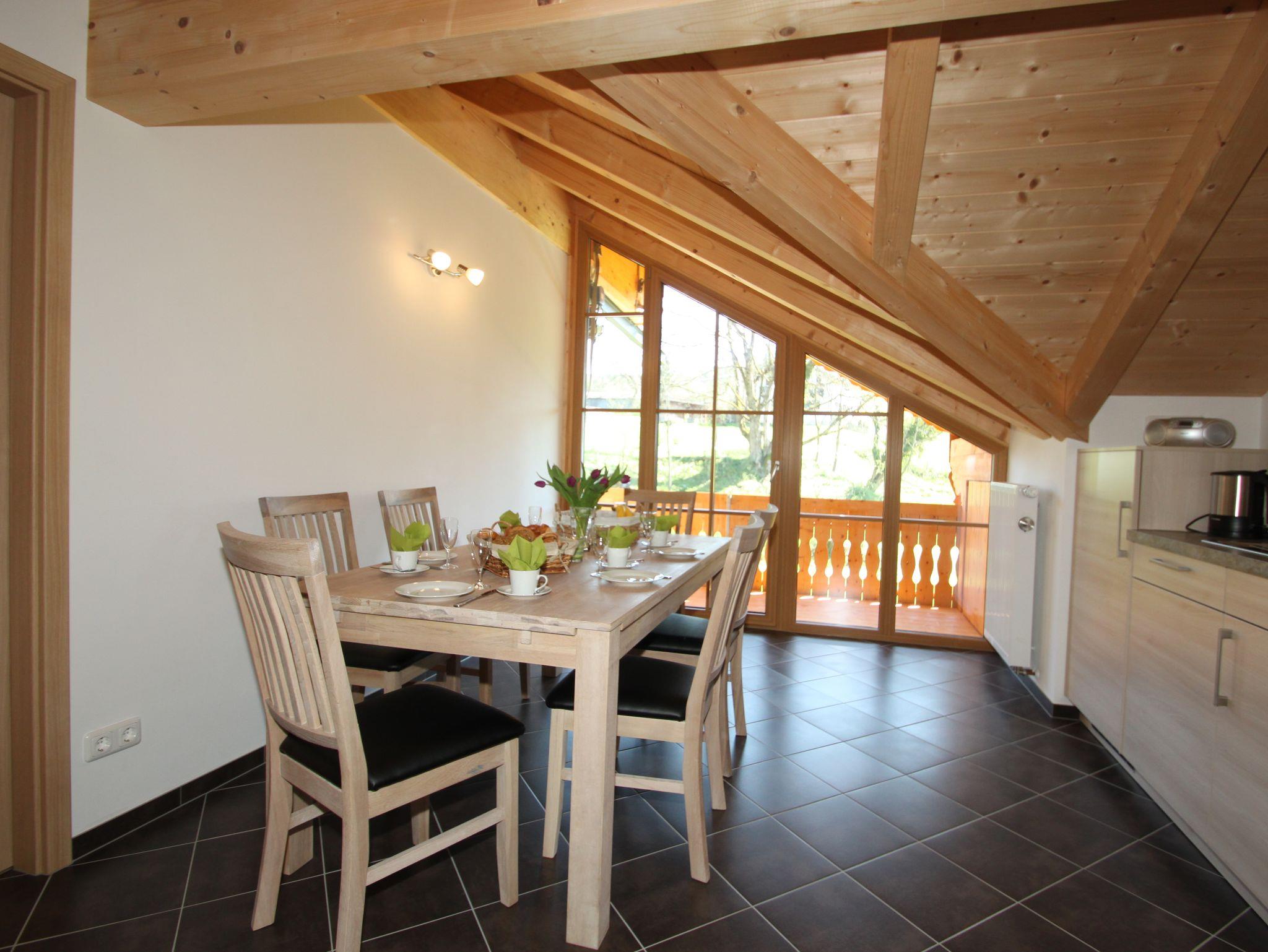 Helle, komfortable Ferienwohnung - Bergblick im Dachgeschoss für 1 bis 9 Personen mit 3 Balkonen, die Küche ist komplett ausgestattet mit Mikrowelle, Toaster und Kapselmaschine, 3 separate Schlafzimmer, Gäste-WC, Bad mit Badewanne und Dusche. Zahlreiche Ausflugsziele wie zum Beispiel Bad Reichenhall, Berchtesgaden, Salzburg sind in unmittelbarer Nähe. Haustiere auf Anfrage erlaubt.