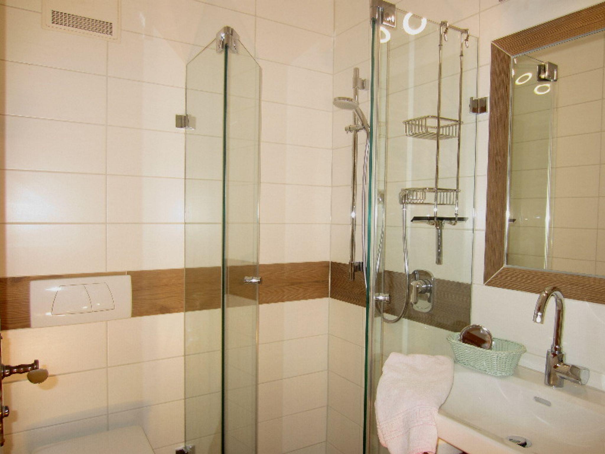 Die Ferienwohnung hat 45 qm² Wohnfläche und ist im Erdgeschoss des Gästehaus. Sie hat eine große Terrasse von der Sie eine traumhafte Aussicht auf die Berge und ins Tal haben.In der Wohnküche ist eine Essecke und die Küche mit Induktionsherd, Backofen, Spülmaschine, Mikrowelle, Kühlschrank, Kaffeemaschine, Wasserkocher, Toaster, Erstausstattung mit Spültuch, Tabs und Mülltüten. Außerdem steht hier auch noch eine Couch, der Fernseher und eine Stereoanlage. Im kleinen Bad ist eine Dusche, Waschbecken und WC, Handtücher, ein kleiner Schminkspiegel und ein Föhn. Die zwei Schlafzimmer haben jeweils Doppelbetten.