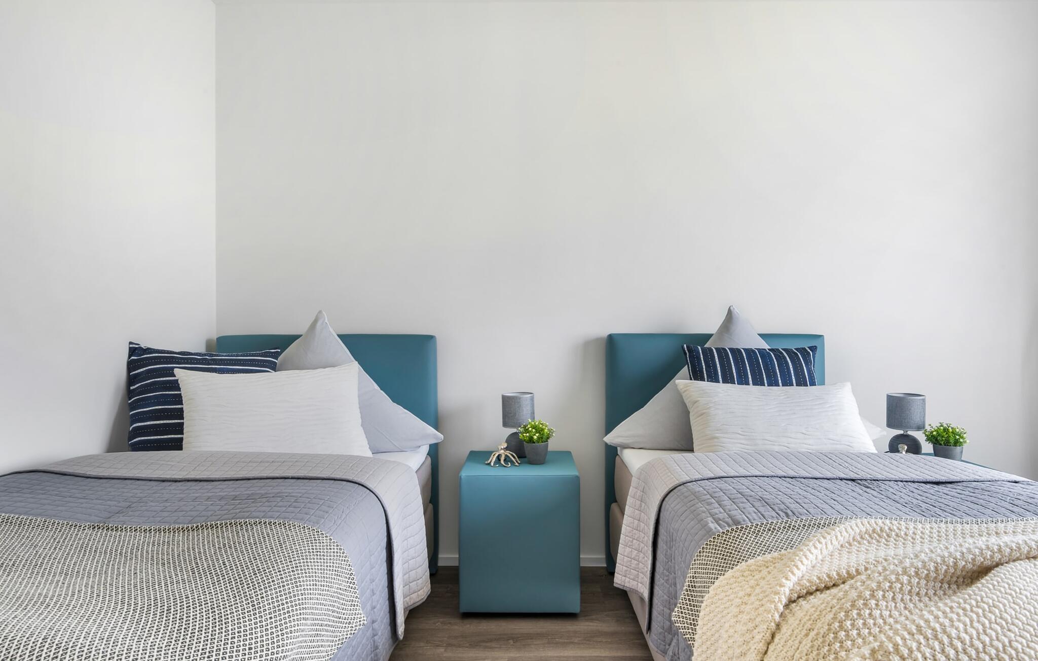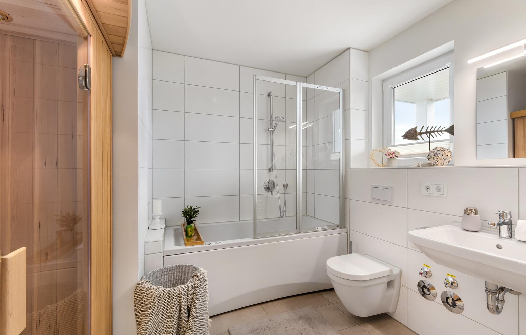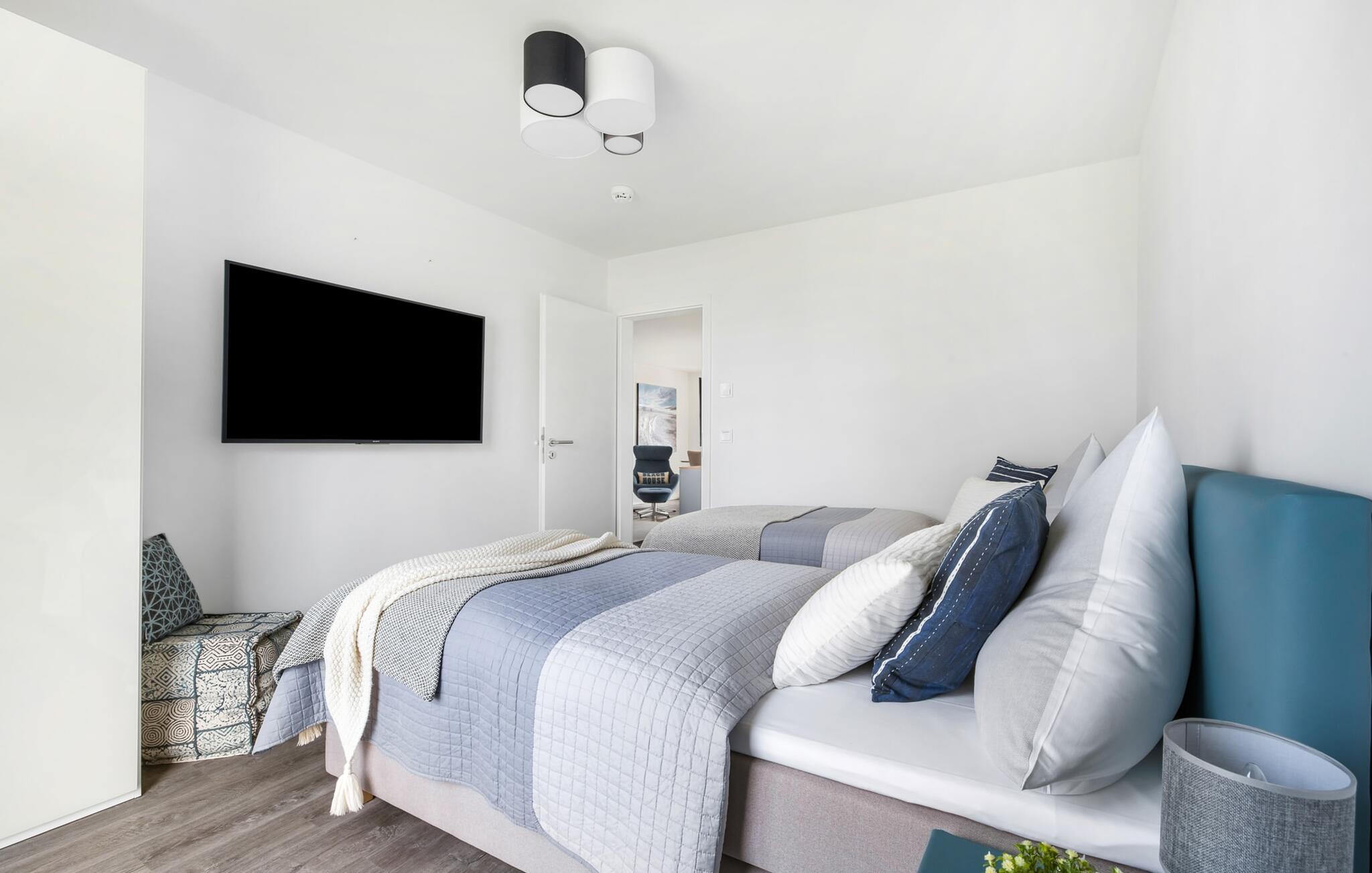 Den hyggelige ferielejlighed Pierstern 53 ligger kun få minutters gang fra den populære Weidefelder sandstrand og Østersøen. Den centrale beliggenhed i Østersøen Resort Olpenitz er perfekt marinaen, minigolfbanen og havnepromenaden med et voksende udvalg af tilbud er i umiddelbar nærhed. Pierstern 53 ligger i stueetagen og har to overdækkede solterrasser. Derfra har I direkte adgang til det grønne område, der omkranser huset. Ren sommer- og kystfølelse er dagens orden her! I maritim stil er den kombinerede åbne stue/alrum oversvømmet med lys og hyggeligt takket være dens gulv-til-loft vinduesfront. I direkte tilknytning til spisepladsen ligger den rummelige sydøstvendte solterrasse. Det lover solnydelse fra morgen til aften og indbyder til hyggelige timer udendørs med havemøbler og grill. På ferien er der tid til kreativ madlavning. Det omfattende køkken-alrum lader intet tilbage at ønske. Her kan man fremtrylle lækre feriemåltider. De to soveværelser er udstyret med højkvalitets boxmadrasser og byder på en smuk udsigt over havnen. Der er et andet fjernsyn i hvert soveværelse til hyggelige aftener med at se tv. Der er nok opbevaringsplads i skabene. Badeværelset er en lille wellness-oase! Et spabad og en infrarød sauna forsøder også de dage, hvor vejret ikke er rigtig godt og bliver nordisk. Takket være gulvvarme og pejs er lejligheden ideel til enhver sæson. Hvad enten det er med en bog og vin, en spændende film eller romantisk foran den knitrende ild i pejsen, begynder jeres ferie! Der er en privat parkeringsplads og et cykelskur foran huset. Vores yndlingssted: Efter en lang dag på stranden kan I afslutte aftenen med at slappe af på terrassen og nyde de sidste solstråler... Bemærk venligst: OstseeResort Olpenitz er meget populært, og der bygges fortsat i parken. Ikke desto mindre kan I se frem til en 5-stjernet standard og et førsteklasses ophold. Byggeaktiviteterne kommer ikke til at forstyrre jer på ferien, og derfor gives der ikke yderligere afslag i prisen.