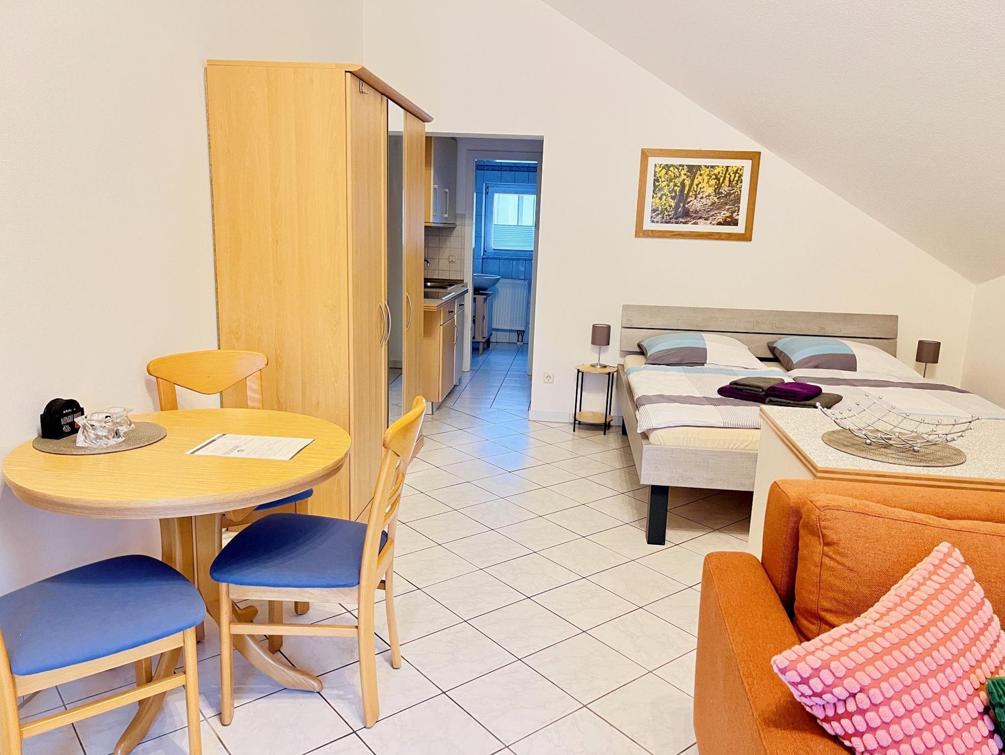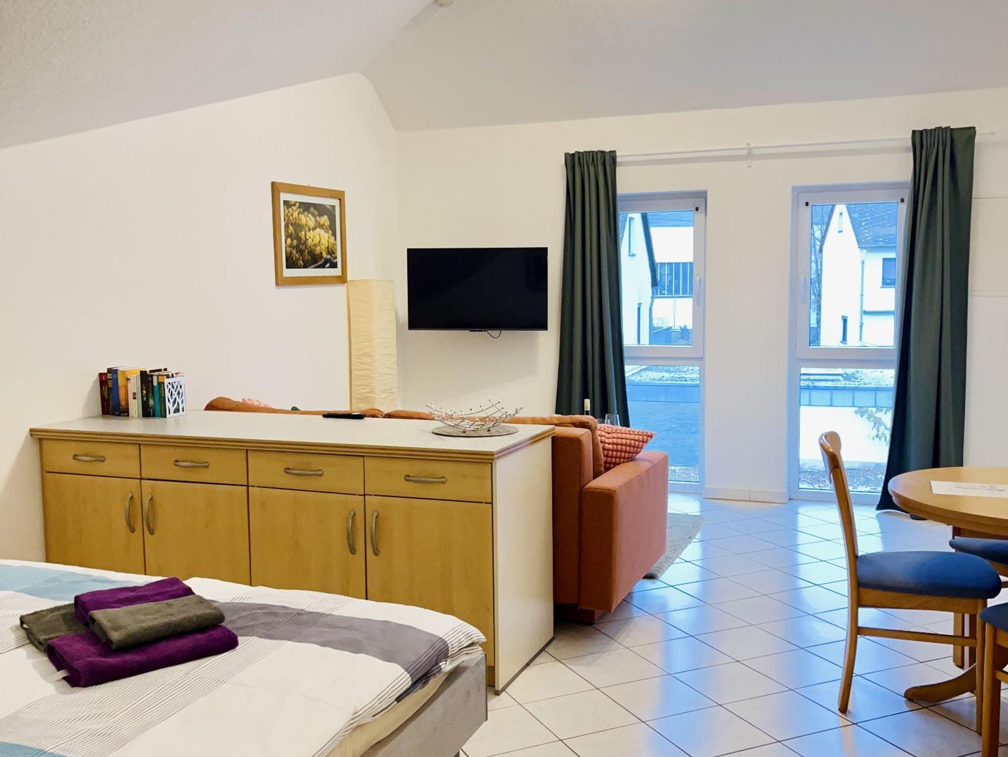 Das gemütliche Apartment verfügt über eine voll ausgestattete Küche, ein modernes Bad mit Dusche sowie einen einladenden Wohn- und Schlafbereich und ist mit TV und WLAN ausgestattet. Ein Parkplatz befindet sich direkt an der Unterkunft, und gegenüber steht Ihnen zudem öffentliche Parkmöglichkeiten zur Verfügung. Das Apartment bietet Platz für zwei bis drei Personen und die Touristinformation, Restaurants, Winzer und die Mosel sind bequem zu Fuß erreichbar.