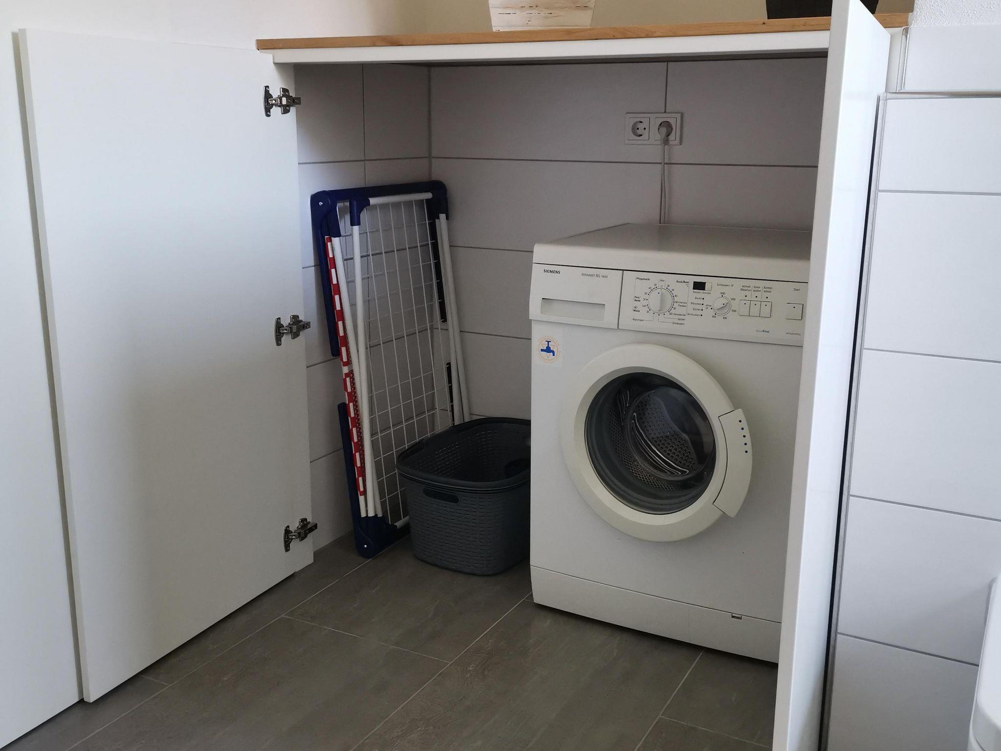 Handtücher und Bettwäsche sind bereits inklusive. Eine Waschmaschine, Wäscheständer sowie Bügeltisch und Bügeleisen sind vorhanden.