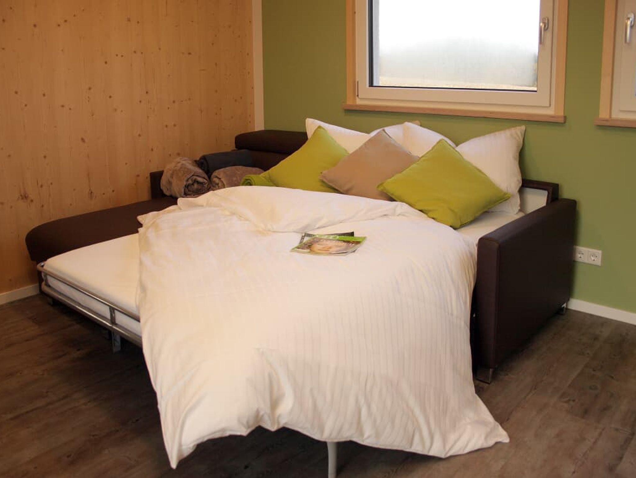 Mit unseren je ca. 44 m² großen einzeln stehenden Chalets mitten im Grünen haben wir ein Areal geschaffen, in dem Sie Auszeit nehmen können, Einblick nehmen können in ländliches Leben, aktiv sein können, eintauchen können in eine Oase für die Seele. Sie entscheiden, ob Sie für sich alleine bleiben wollen oder in Gemeinschaft mit uns und den anderen Gästen aktiv werden. In den 3 identisch aufgebauten Übernachtungschalets befindet sich jeweils ein großes Schlafzimmer für 2 Personen und ein kleineres für 2 Kinder oder einen Erwachsenen. Im Wohn/Essbereich gibt es zudem ein Schlafsofa. Eine kleine, aber komplett ausgestattete Küche inclusive Geschirrspüler und großem Kühlschrank lädt zum Kochen und Genießen ein. Im Duschraum liegen Handtücher und ein Fön für Sie bereit. Eine überdachte Terrasse lädt zum Verweilen an der frischen Luft ein. Die Terrassen sind von den anderen Chalets aus nicht einsehbar. Areal und Chalets sind ebenerdig angelegt und auch für ältere Menschen gut begehbar. Selbstverständlich verfügen die Chalets über WLAN. Wenn sie möchten bieten wir Ihnen morgens ein Frühstück in unserem Seminar-Chalet mit Gemeinschaftsraum, großer Terrasse und Profiküche. In diesem Chalet sind Ihre Haustiere auf Anfrage willkommen.