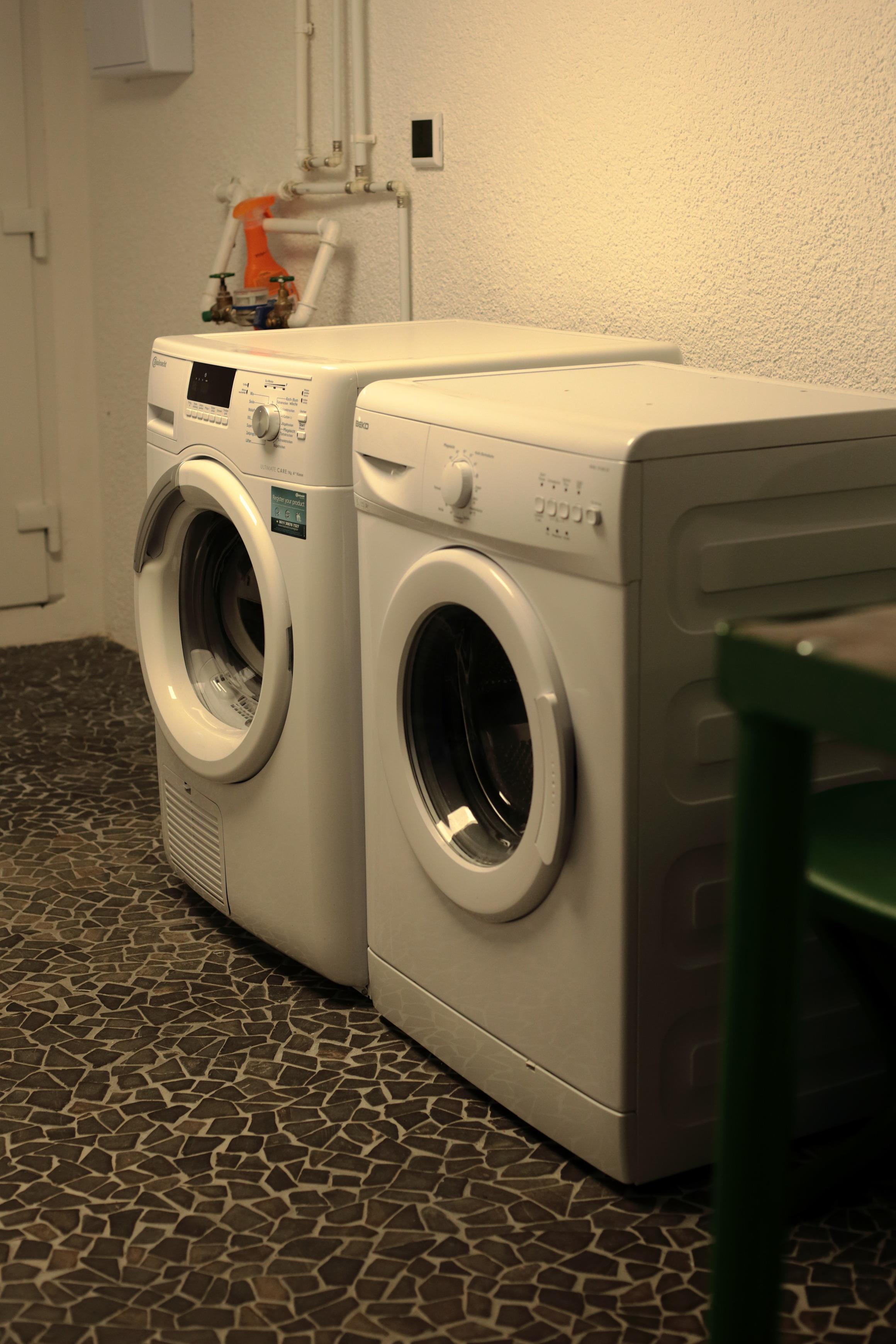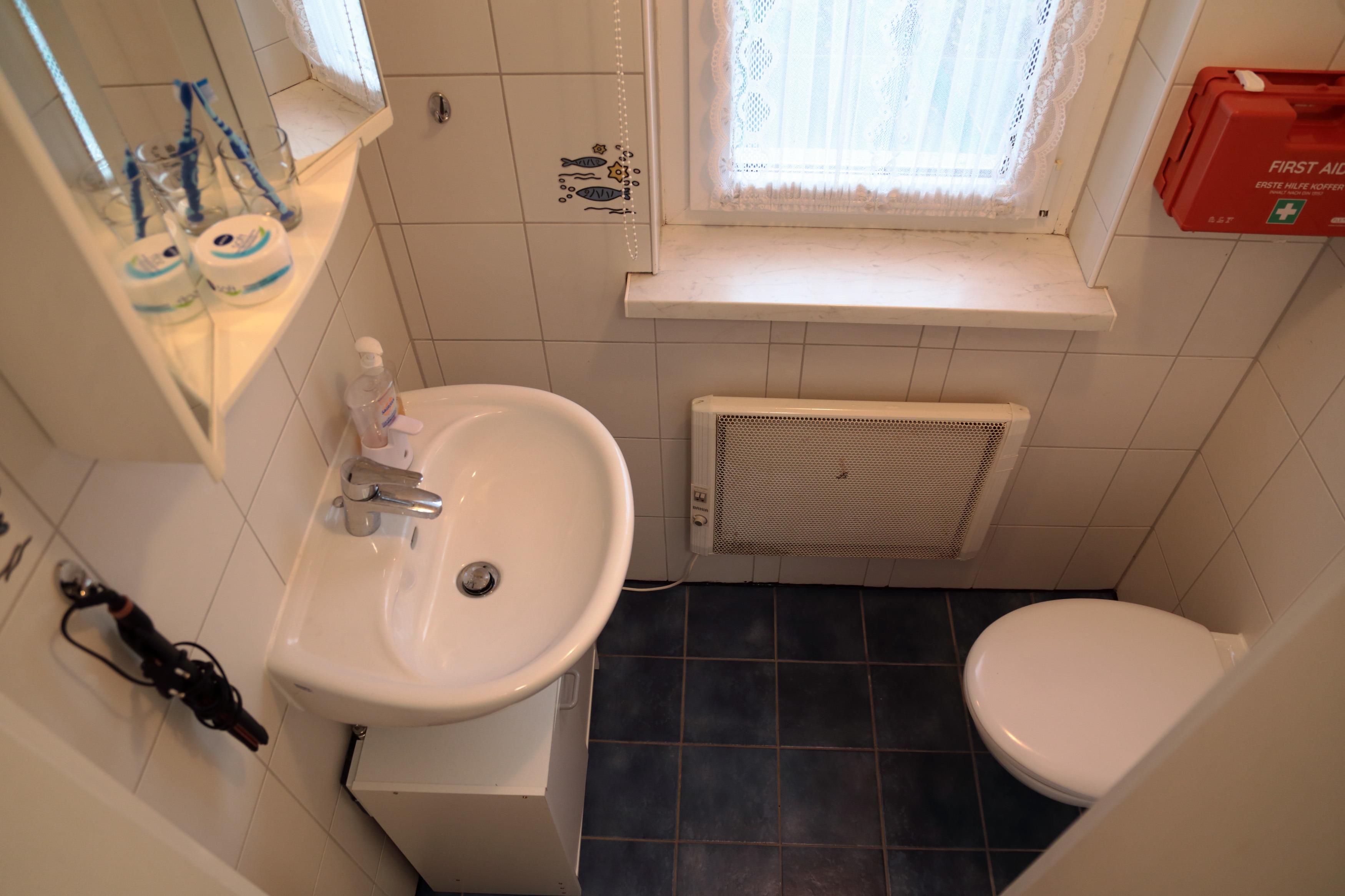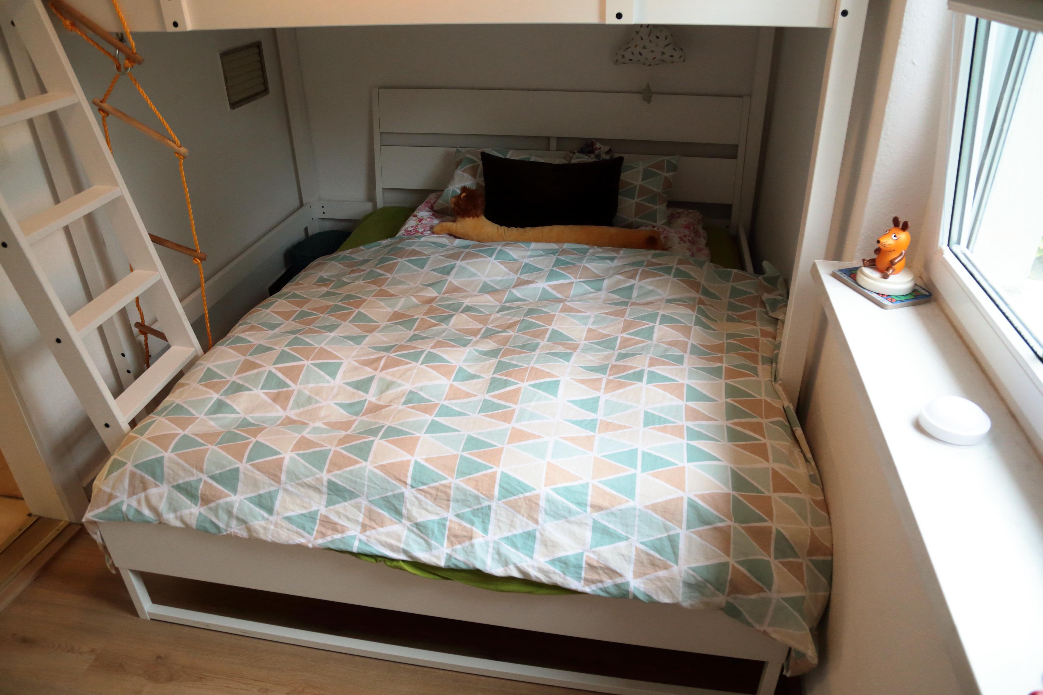 Badezimmer mit Dusche Waschmaschine und Trockner. Separates WC. Schlafzimmer mit einem Ehe- plus Kinderbett für zwei Kinder und einem Kleiderschrank.