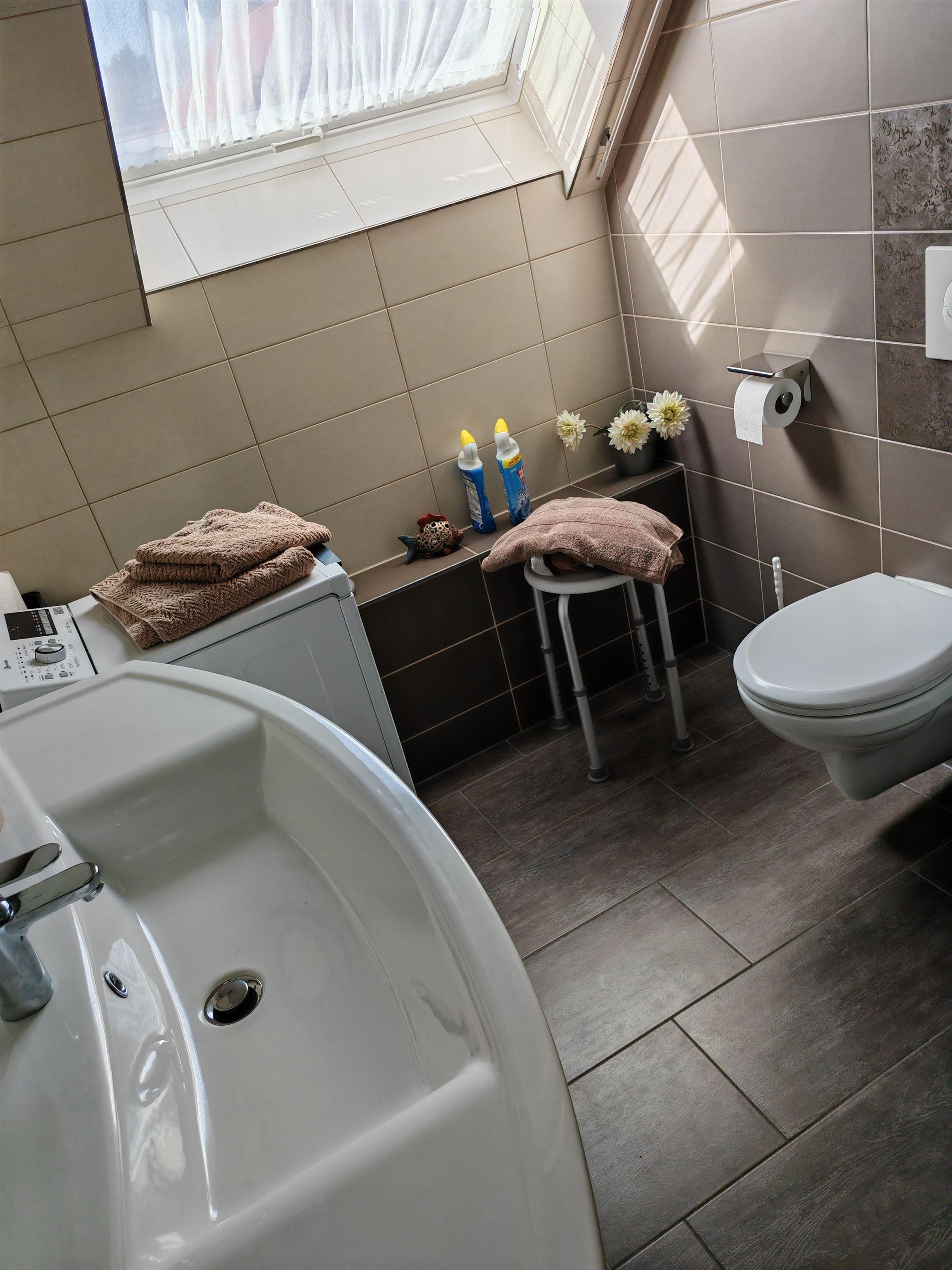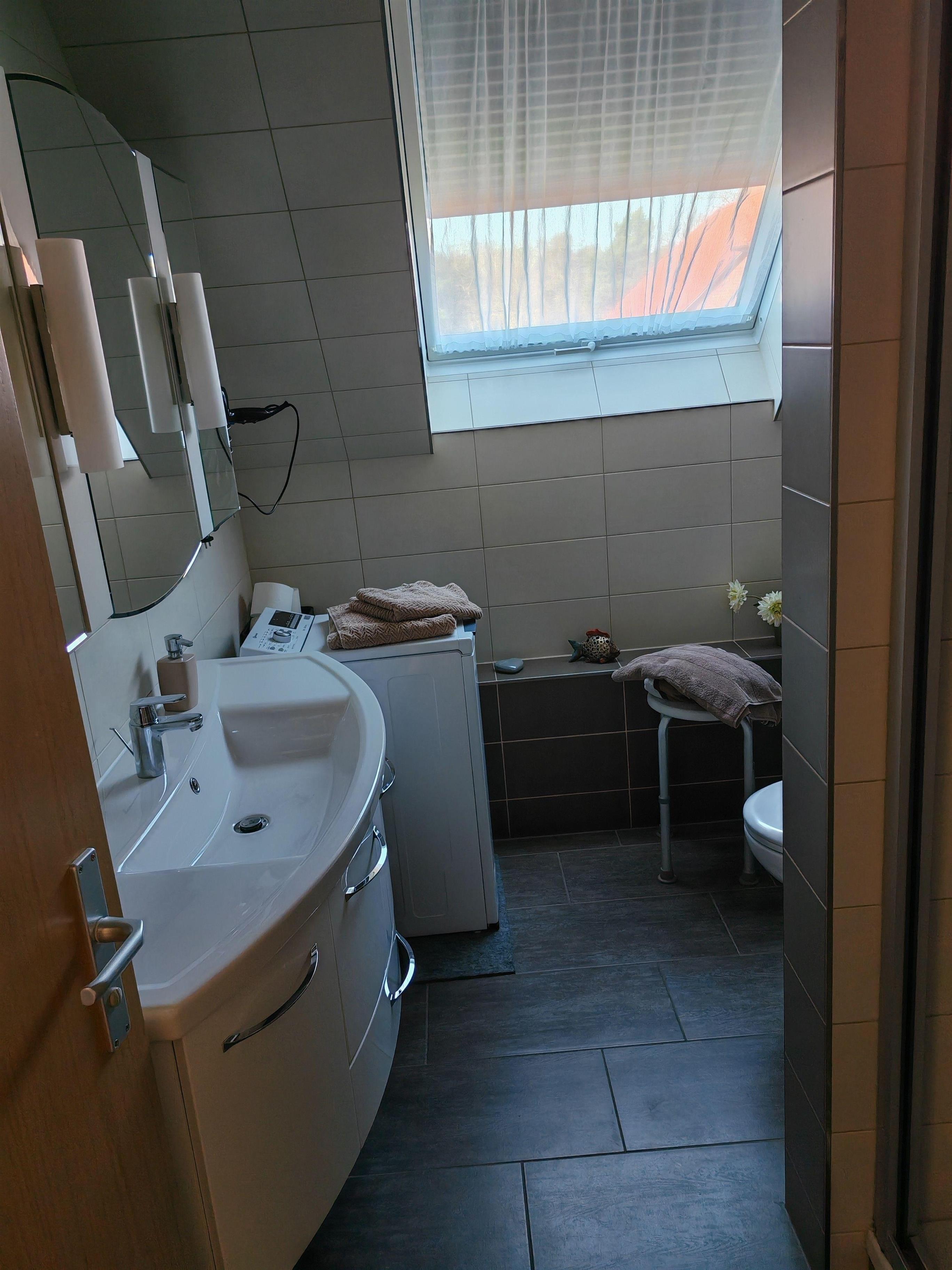 Das moderne Bad mit Fenster verfügt über Dusche, Waschbecken , Waschtisch, Handtuchhalter, Waschmaschine und WC.