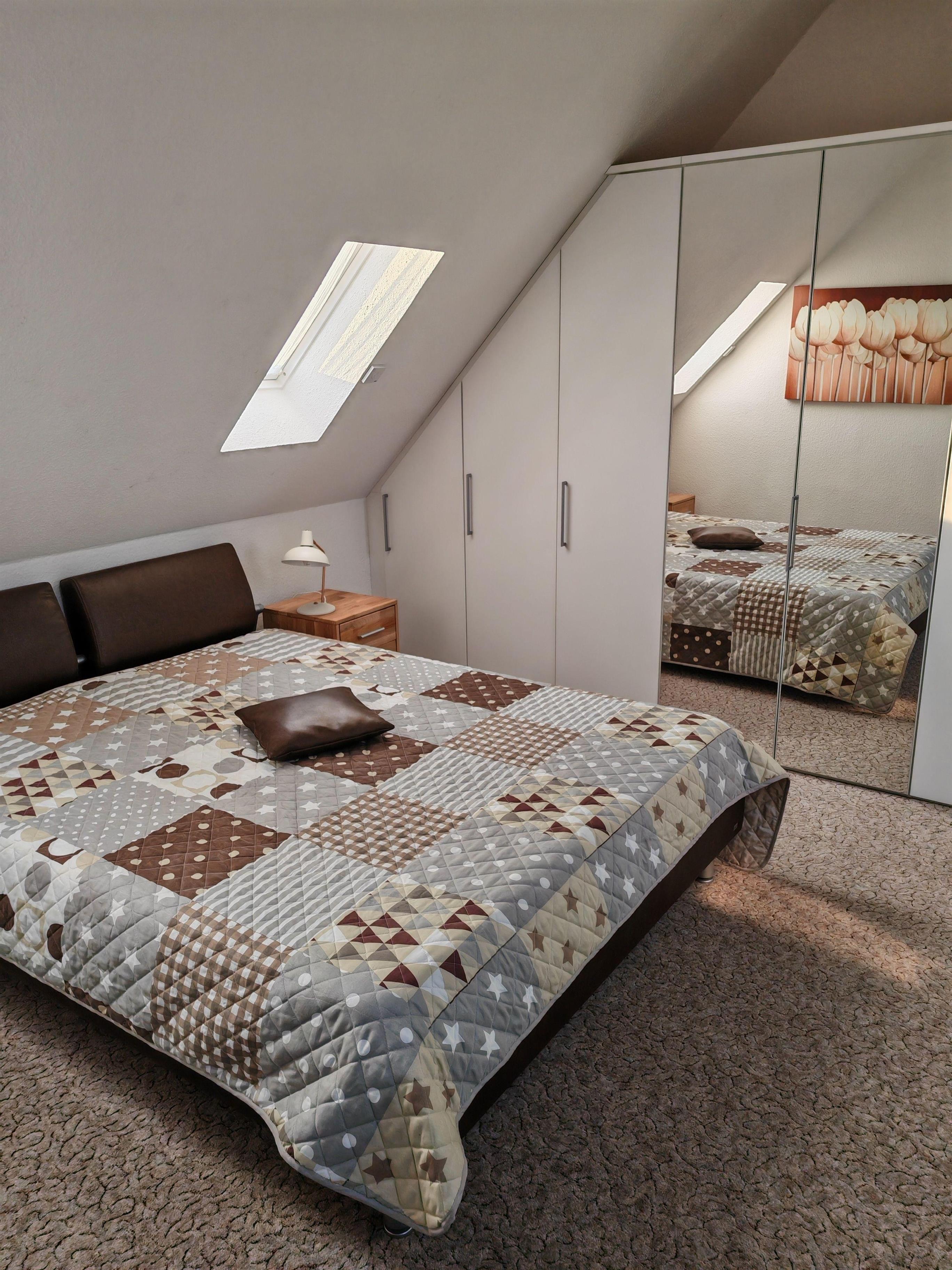 Das Schlafzimmer erreichen Sie über eine Wendeltreppe. Es verfügt über ein Doppelbett mit verstellbaren Lattenrosten und neuen Matratzen. Im Schrank finden Sie genügend Stauraum für Ihre Kleidung.