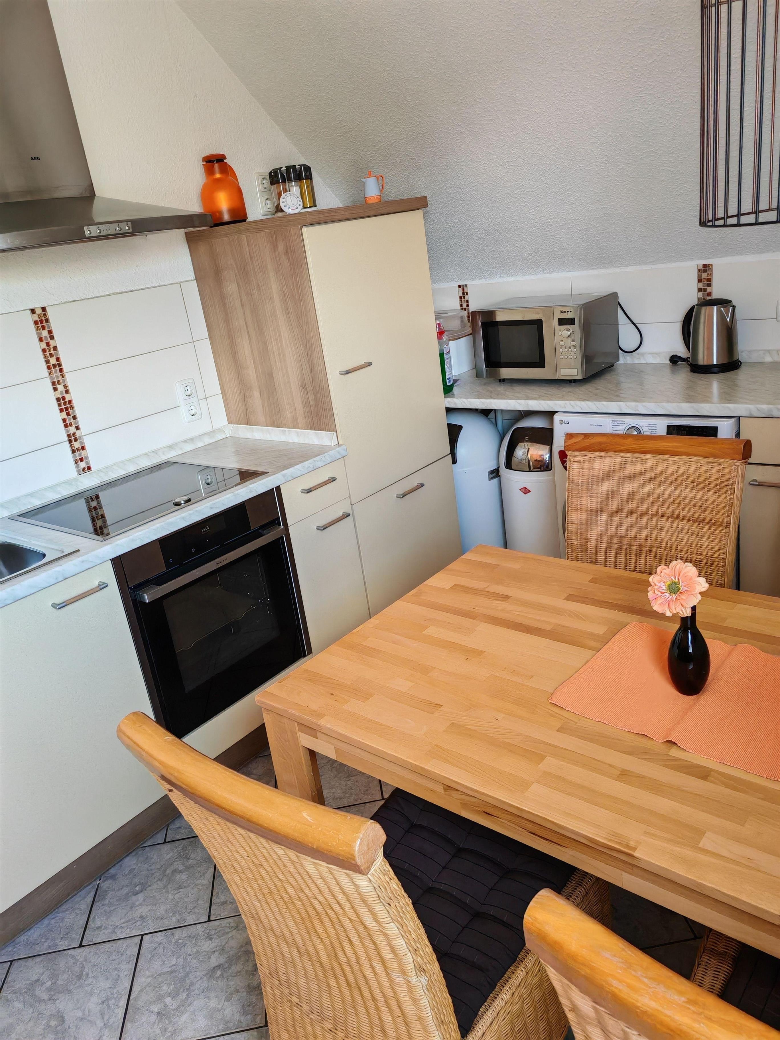 Die Küchenzeile ist sehr gut ausgestattet und verfügt über einen Herd mit Backofen, Kühl- u. Gefrierschrank , Wasserkocher, Kaffeemaschine,Toaster und Mikrowelle. Die gemütliche Sitzecke bietet Platz für bis zu vier Personen .