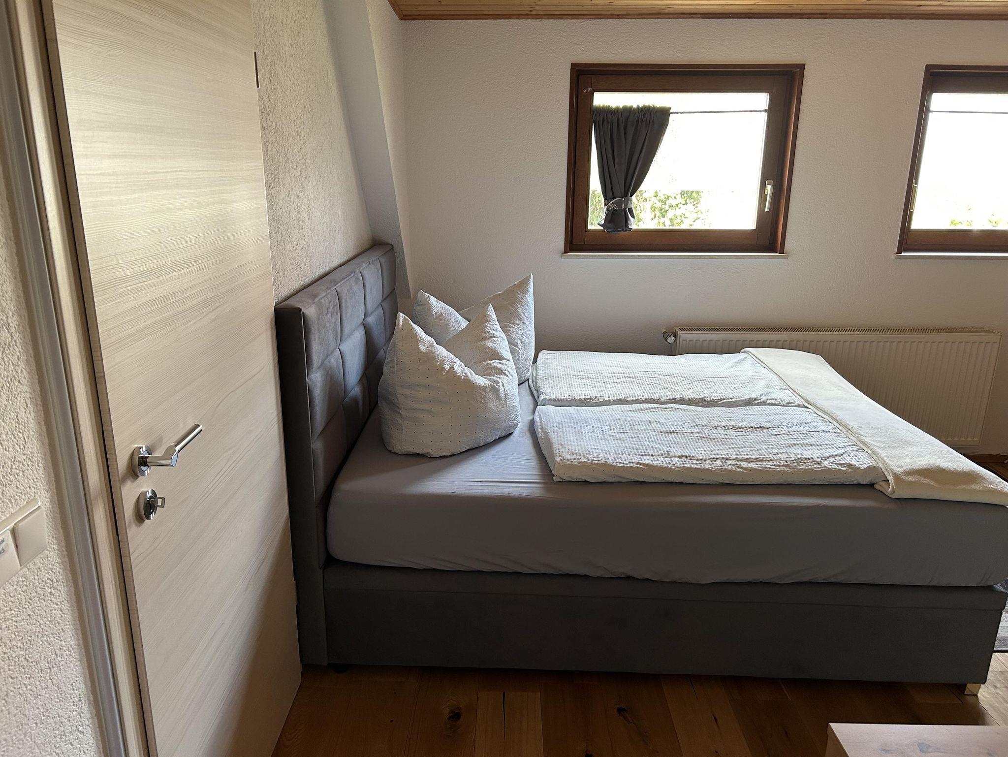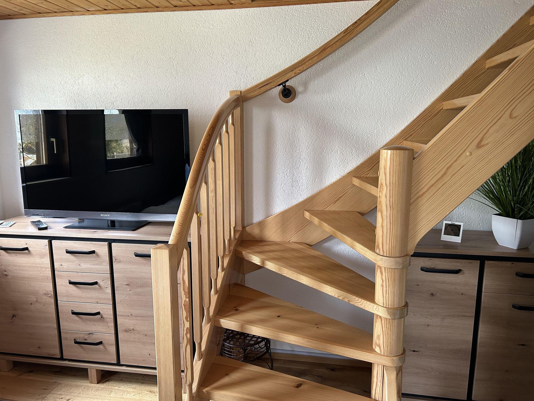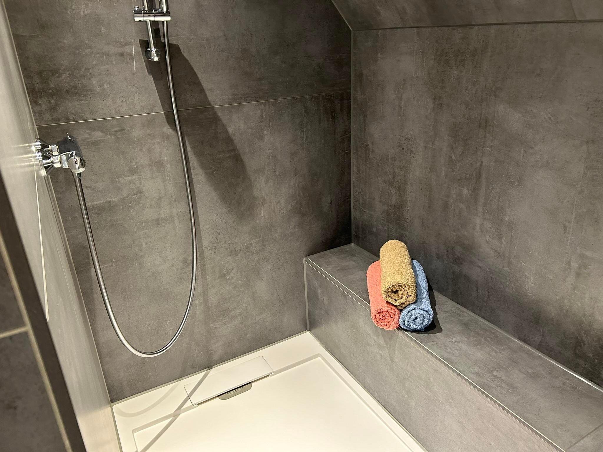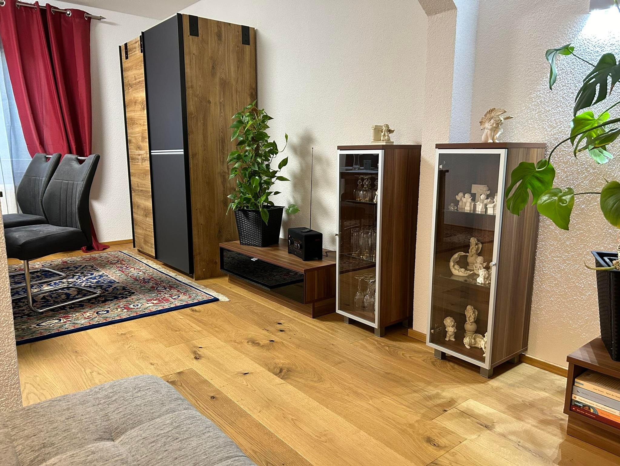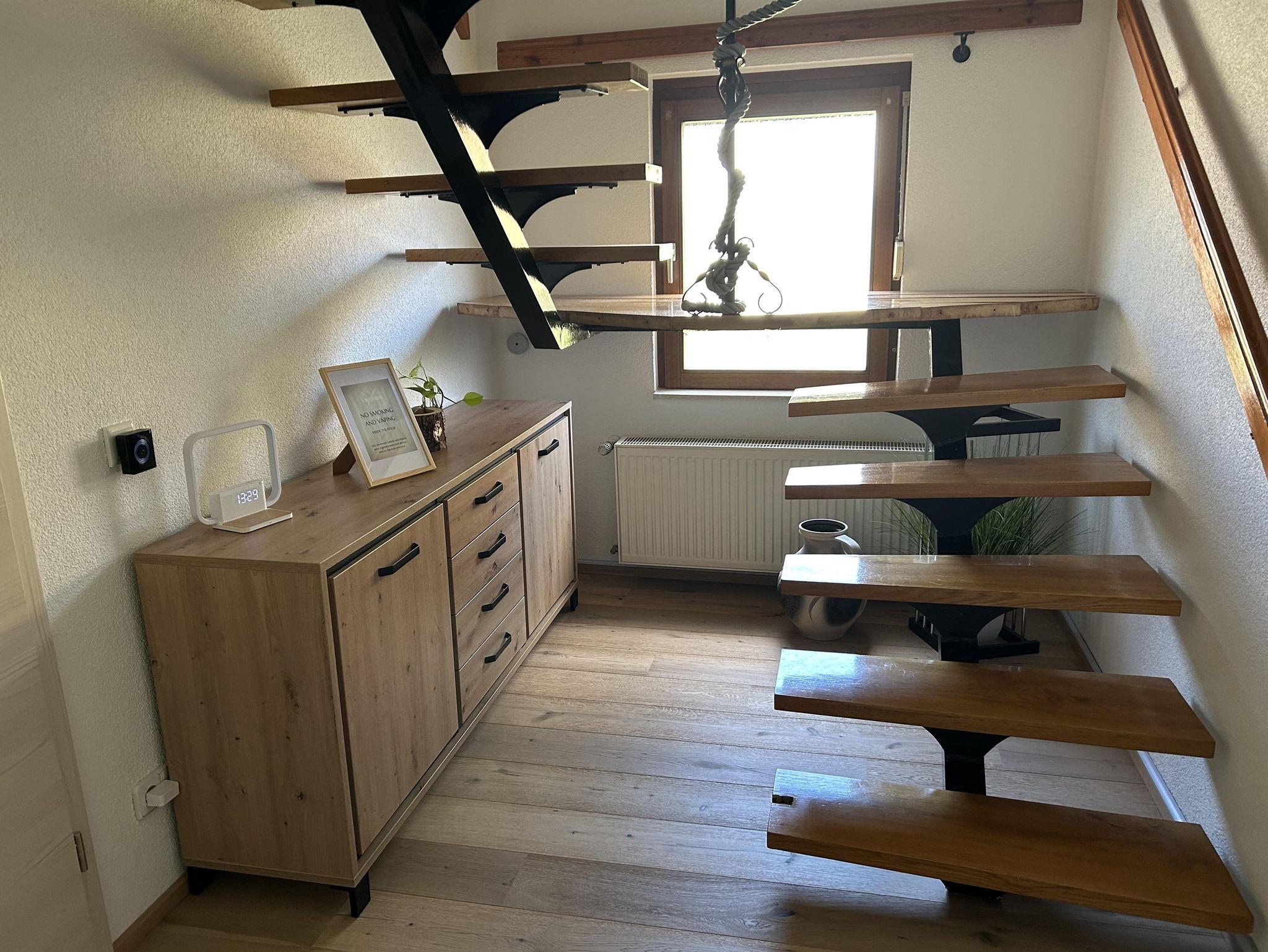 Unsere Ferienwohnung - welche komplett neu saniert und eingerichtet wurde - ideal für 2 Erwachsene und 1 bis 2 Kinder (max. 5 Personen) erstreckt sich über 2 Etagen. Über die Treppe erreichen wir im Obergeschoss das Schlafzimmer mit einem Doppelbett, und ein weiteres Schlafzimmer als Durchgangszimmer mit einem Queensize-Doppelbett. Auf Anfrage ist ein Kinderreisebett und ein Hochstuhl möglich. Im Dachgeschoss steht eine weitere Schlafmöglichkeit zur Verfügung. Das Bad ist mit Dusche und WC ausgestattet. Ein separates Gäste WC steht im Erdgeschoss zur Verfügung.